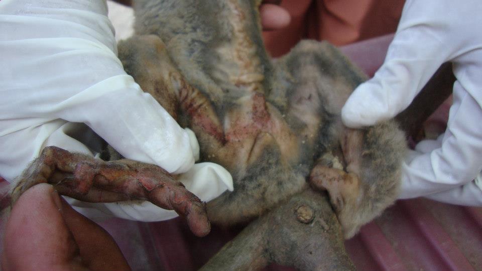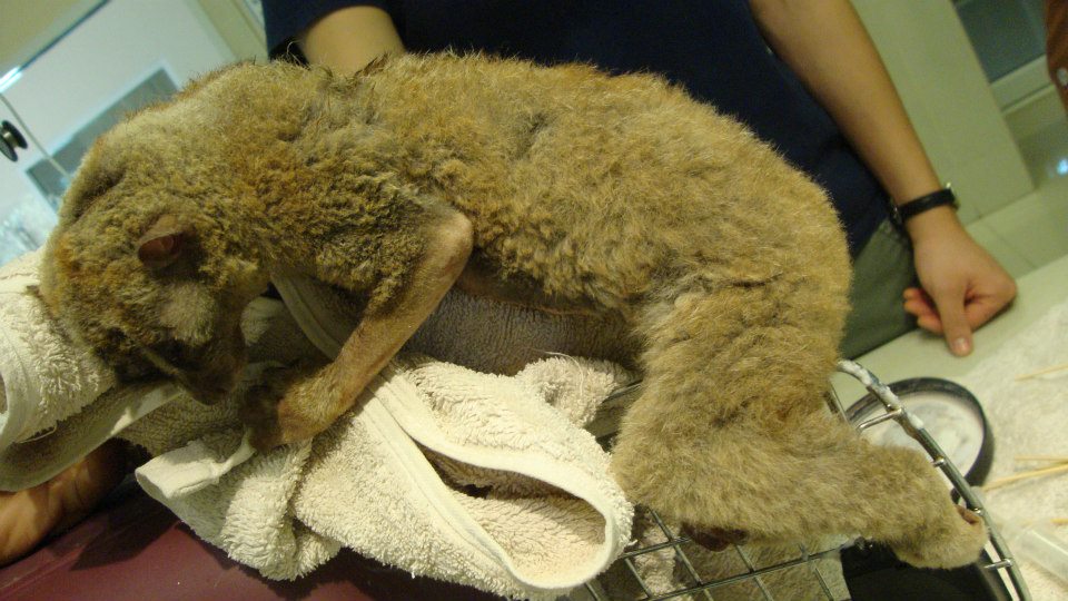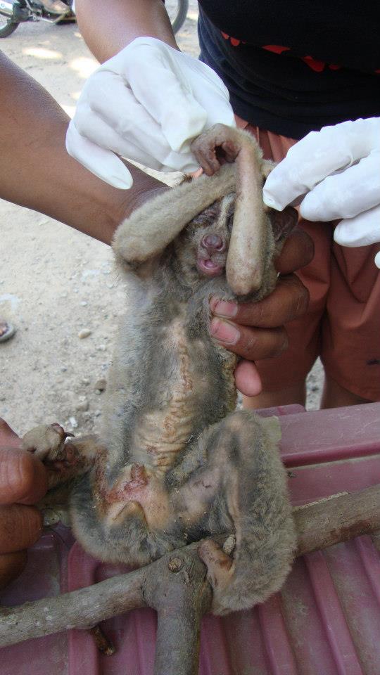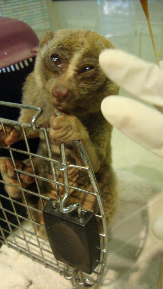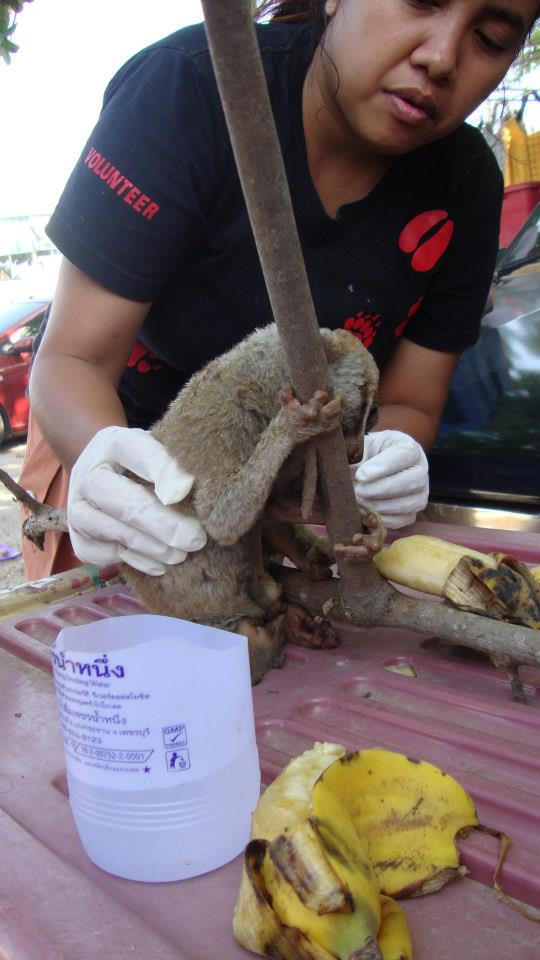 A slow loris (a night monkey found in Thailand) was brought in to the Wildlife Hospital of the WFFT on the 14th of March 2013. The loris had severe burns on legs, arms and body and has infected eyes. This small slow loris was probably electrocuted as it climbed a power-line from or to a tree.