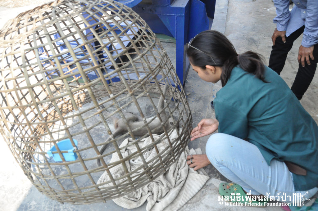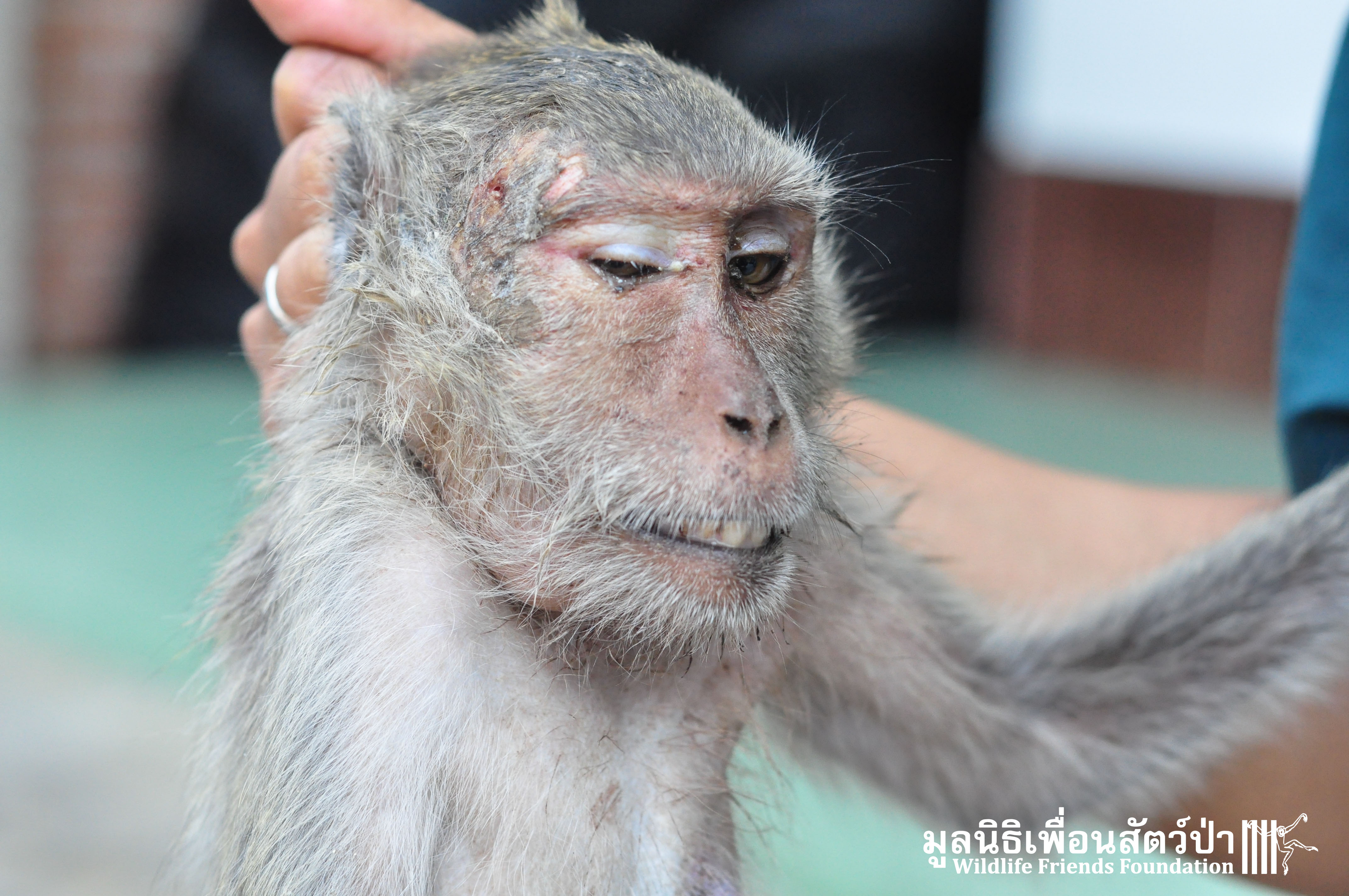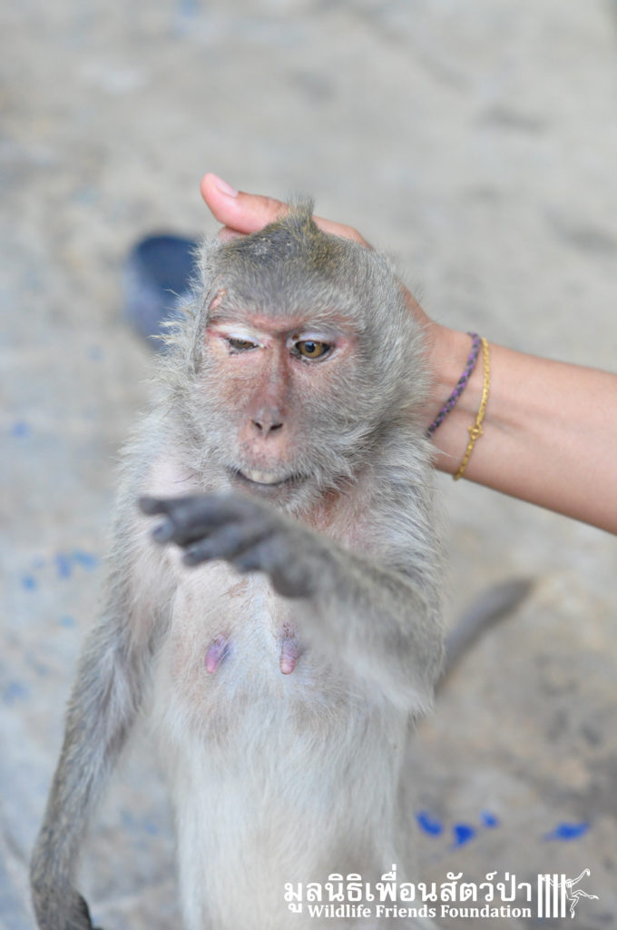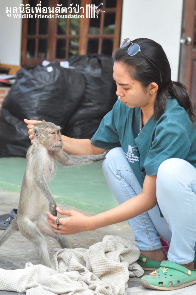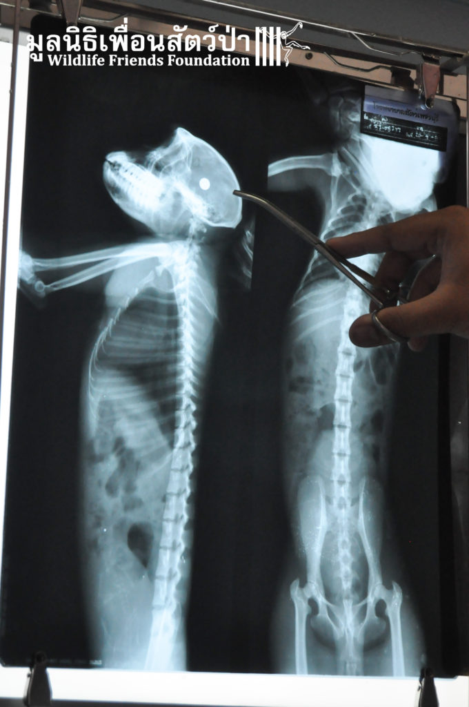 Yesterday we received a call from a concerned local man about a long-tailed macaque (Macaca fascicularis) that had been found by the side a busy road within a highly populated industrial area in Cha-am close to the WFFT Wildlife Rescue Centre. The compassionate local that found her thought she had been attacked by a pack of feral dogs. The WFFT Rescue Team set out immediately to help this poor soul, after the initial health check, the vet team found a puncture wound on the right side of her head, and it seemed that she had some kind of nervous damage to the right side of her body. She was rushed directly to an animal hospital nearby so an x-ray could be performed. After examining the results of the x-ray it was found that a bullet was lodged in her head, not only this, we found that she was carrying an unborn infant. This is a bleak reminder of the challenges faced by our team and Thailand’s urban macaques, those wild macaques that live in close proximity to human settlements.