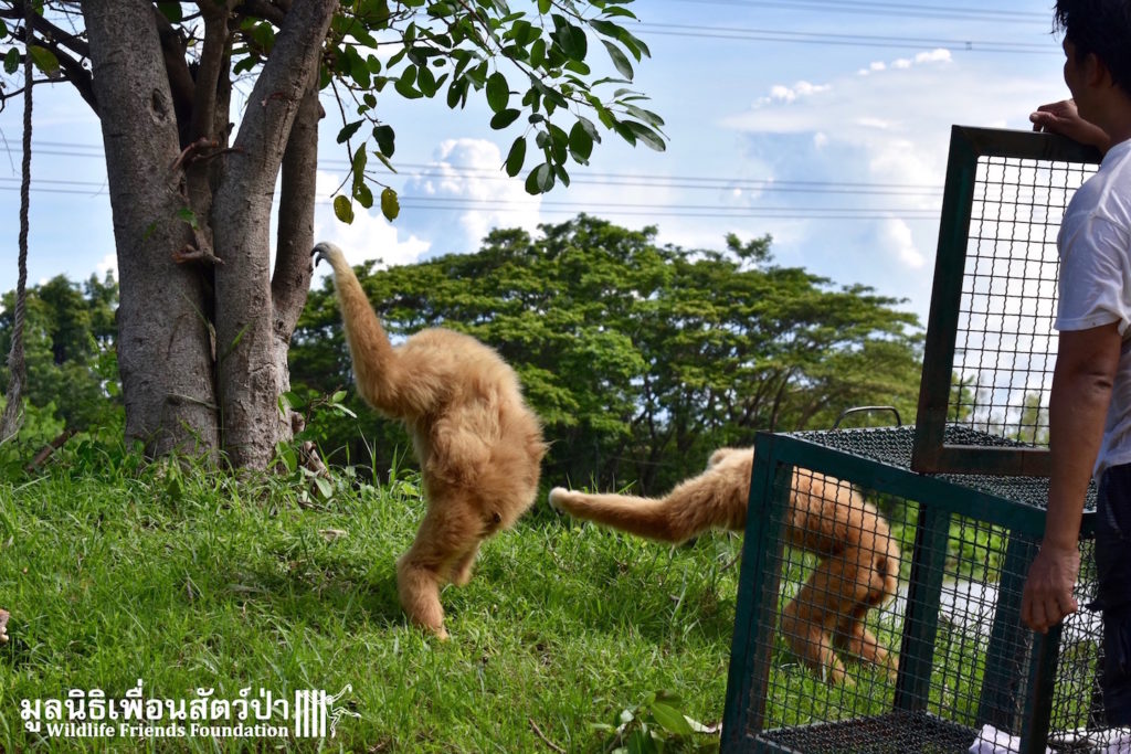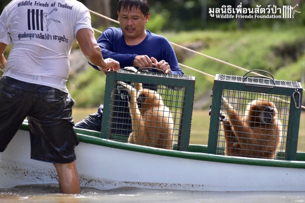 The rain that fell in last years’ rainy season was not enough to keep the WFFT lake full of water all year round so a few months ago we had to relocate the gibbons from the Gibbon Rehabilitation Islands into the main WFFT Wildlife Rescue Centre. Thankfully this year the rains have arrived filling up our lake to a level safe enough to allow us to once again use the Gibbon Islands. This week after some maintenance and refurbishments we have started to put the gibbons back out there. Three of the islands are currently occupied, with 5 more to be completed in the coming weeks. Here are some images of the first gibbons going back, as you can see they are very happy to be returning to their island homes.