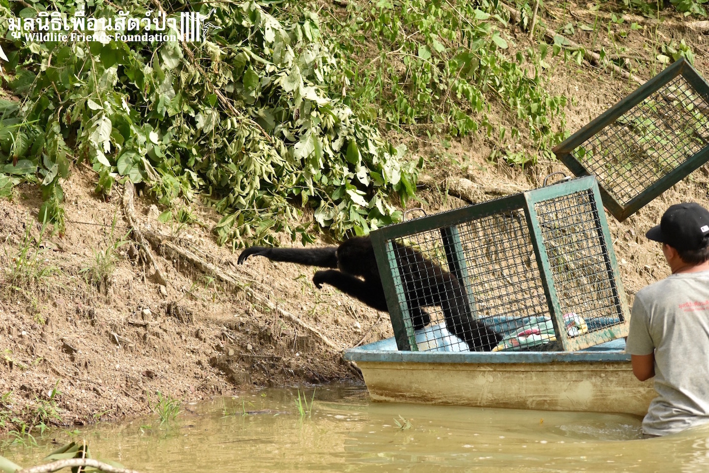 The rain that fell in last years’ rainy season was not enough to keep the WFFT lake full of water all year round so a few months ago we had to relocate the gibbons from the Gibbon Rehabilitation Islands into the main WFFT Wildlife Rescue Centre. Thankfully this year the rains have arrived filling up our lake to a level safe enough to allow us to once again use the Gibbon Islands. This week after some maintenance and refurbishments we have started to put the gibbons back out there. Three of the islands are currently occupied, with 5 more to be completed in the coming weeks. Here are some images of the first gibbons going back, as you can see they are very happy to be returning to their island homes.