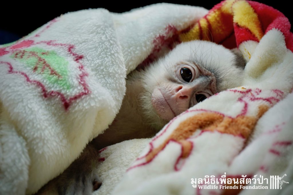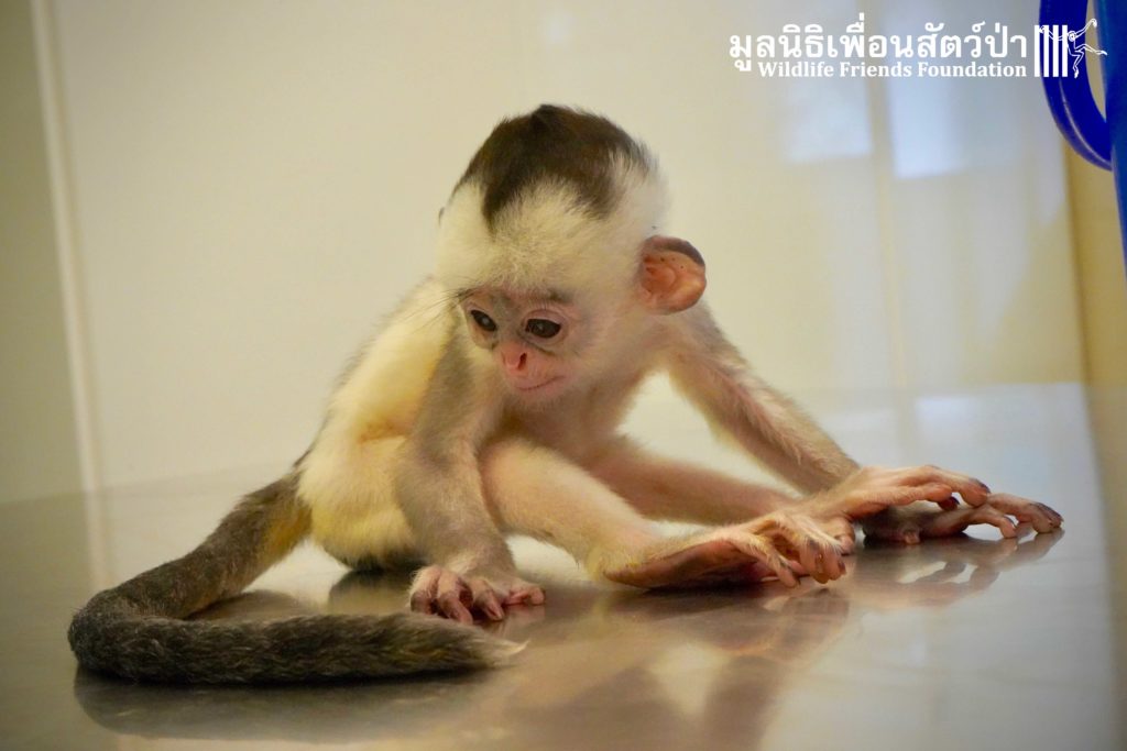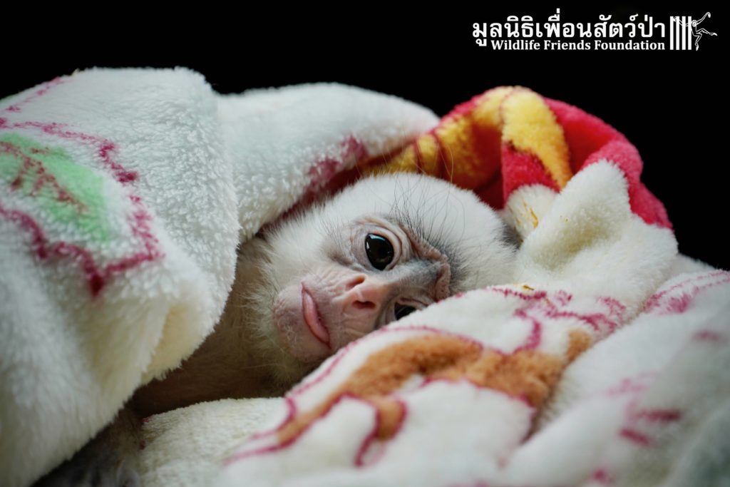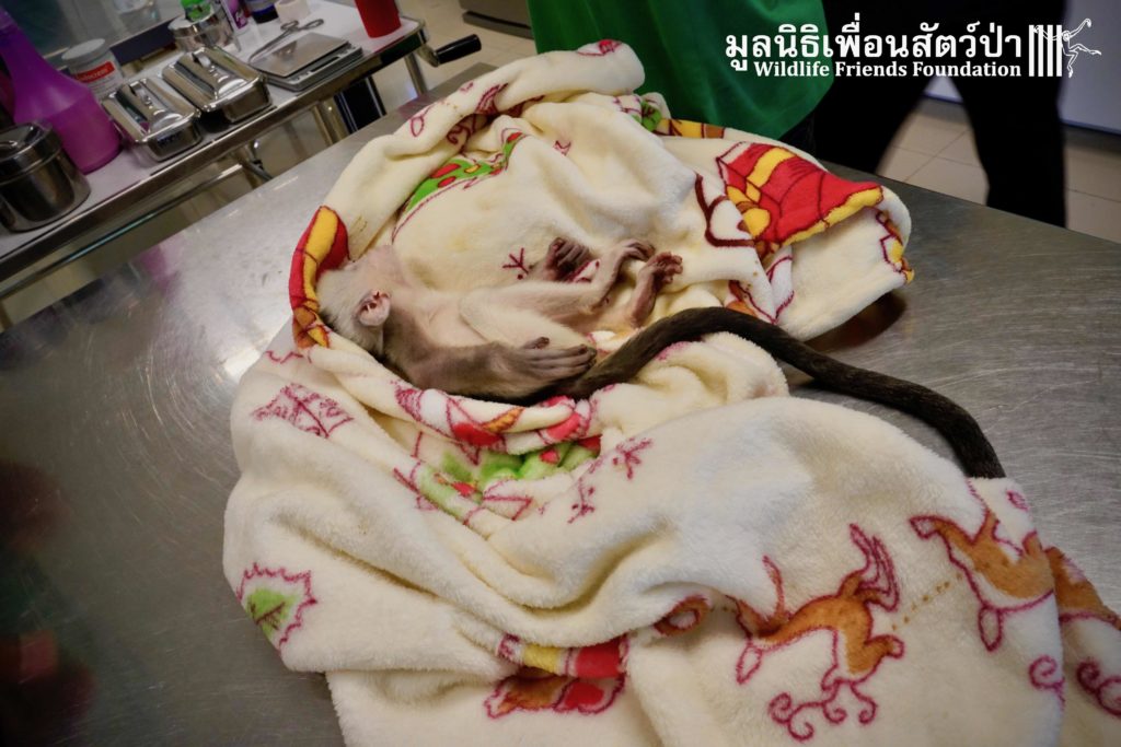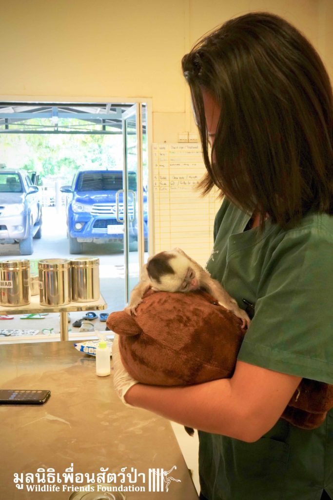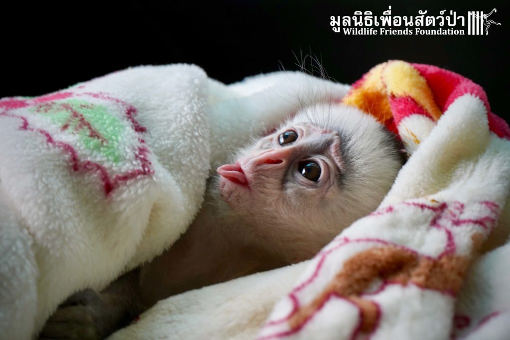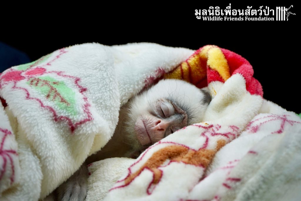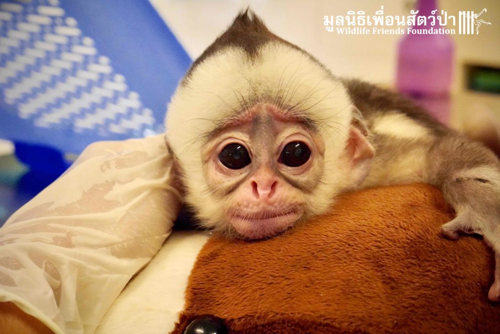 A few days ago we welcomed a new species to the WFFT Wildlife Rescue Centre, an infant Banded langur (Presbytis femoralis). We received a call for help from a lady who had found this sick little infant monkey three days prior to contacting us. We were told he was found alone near a forested area in Southeast Thailand. However here in Thailand this species is only found in peninsular Thailand. This means this little one must have been dumped into the forest as he was hundreds of miles away from where his species may be found in the wild. Another sad victim of the illegal wildlife trade. The WFFT Rescue Team headed out on the long drive to collect this sickly little monkey.