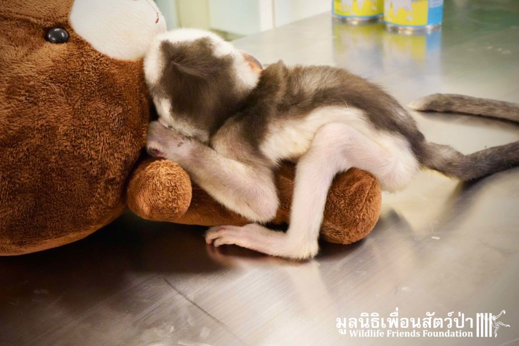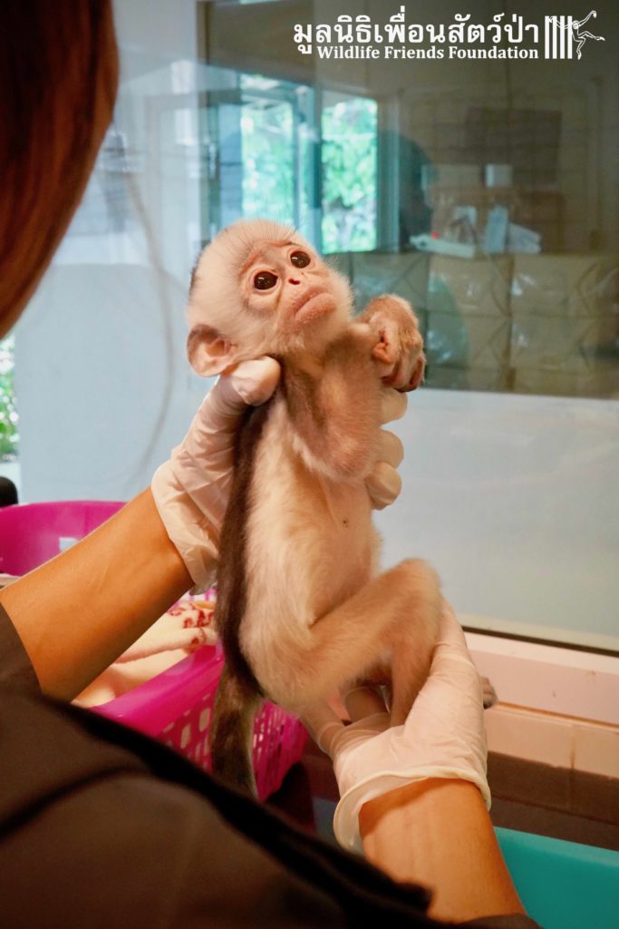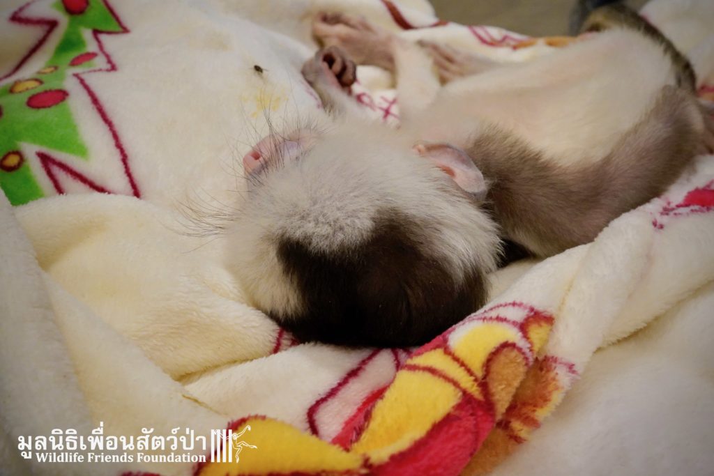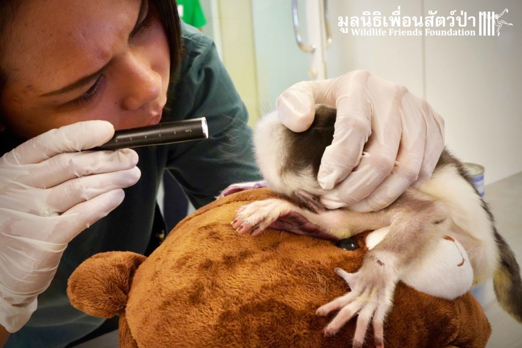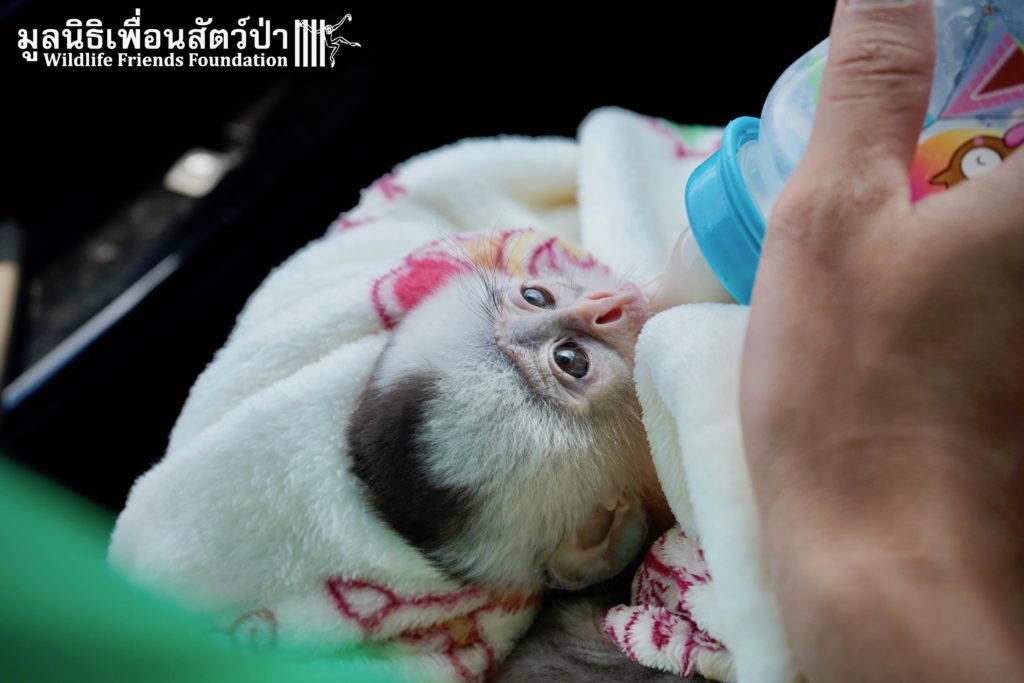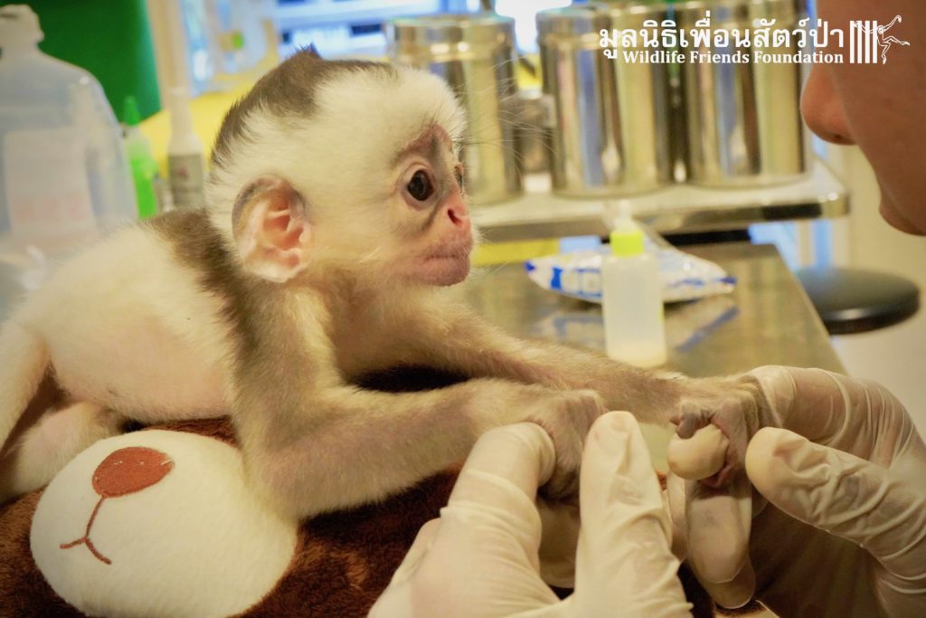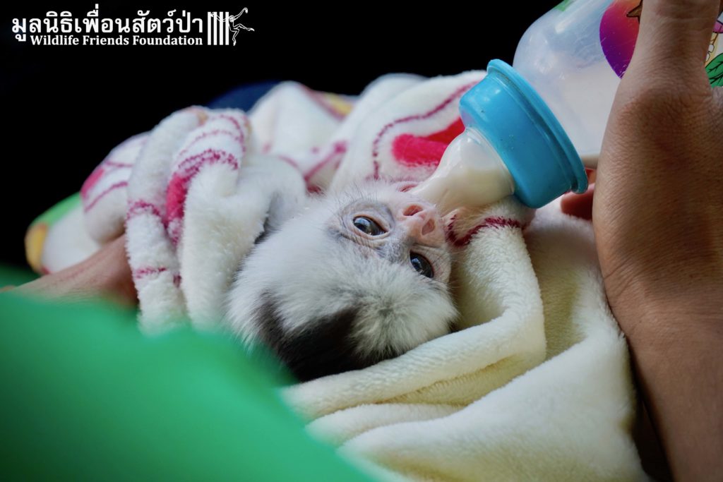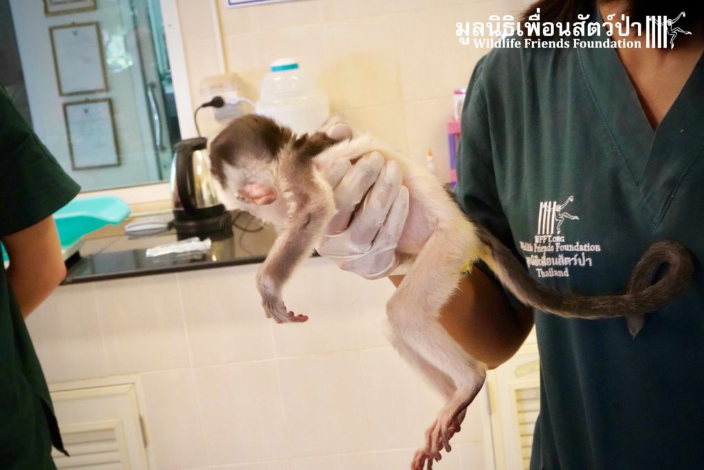 A few days ago we welcomed a new species to the WFFT Wildlife Rescue Centre, an infant Banded langur (Presbytis femoralis). We received a call for help from a lady who had found this sick little infant monkey three days prior to contacting us. We were told he was found alone near a forested area in Southeast Thailand. However here in Thailand this species is only found in peninsular Thailand. This means this little one must have been dumped into the forest as he was hundreds of miles away from where his species may be found in the wild. Another sad victim of the illegal wildlife trade. The WFFT Rescue Team headed out on the long drive to collect this sickly little monkey.