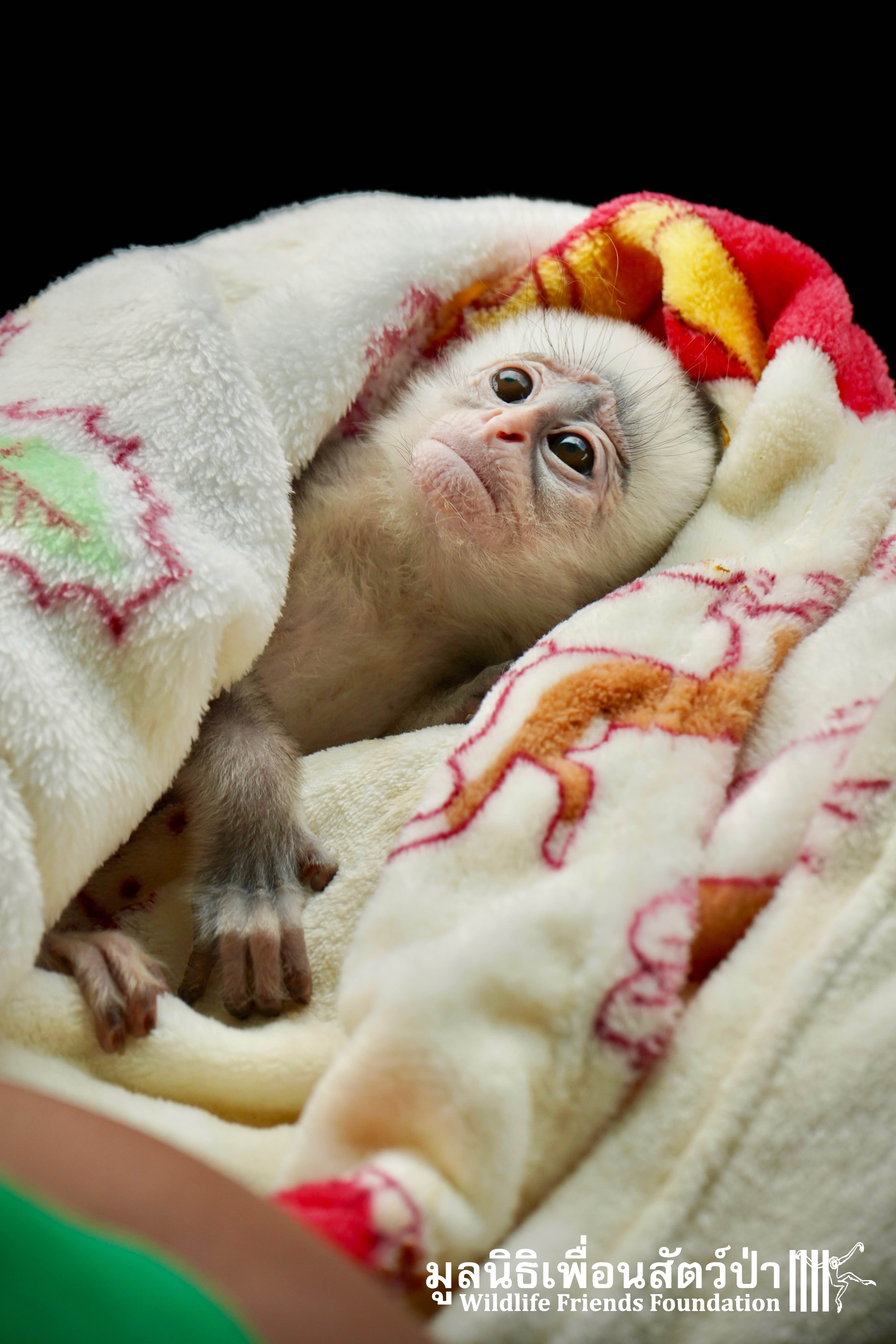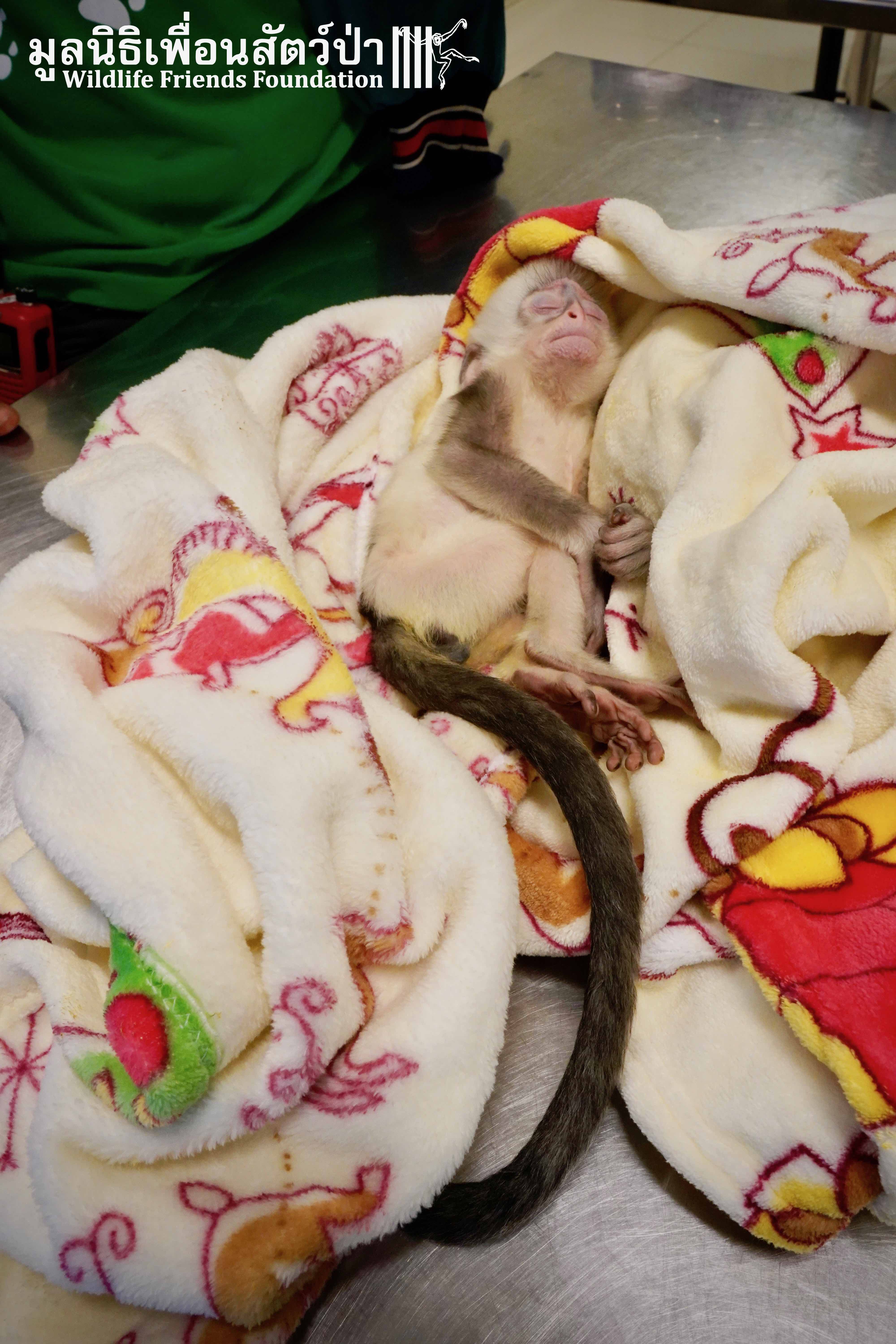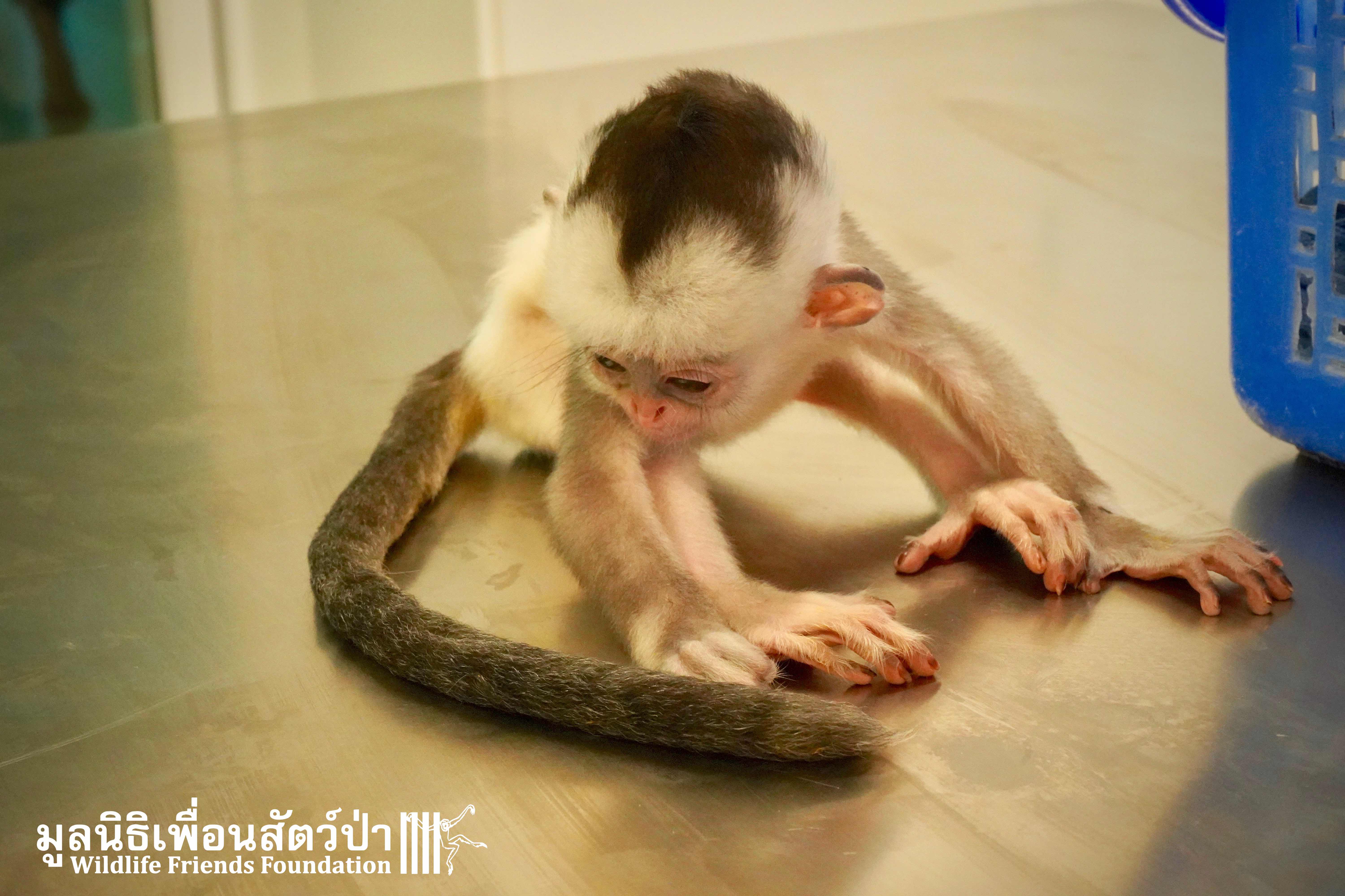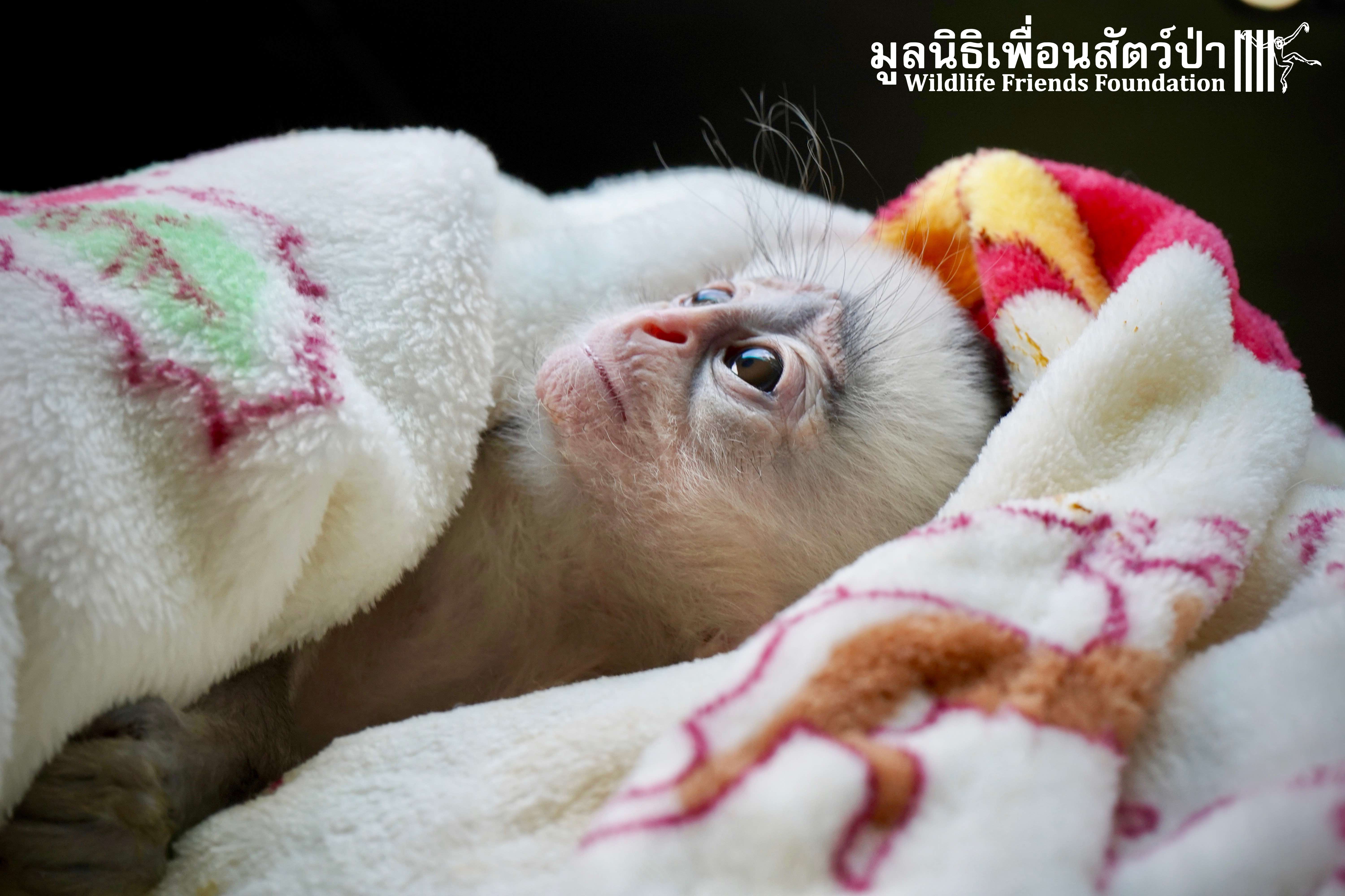 A few days ago we welcomed a new species to the WFFT Wildlife Rescue Centre, an infant Banded langur (Presbytis femoralis). We received a call for help from a lady who had found this sick little infant monkey three days prior to contacting us. We were told he was found alone near a forested area in Southeast Thailand. However here in Thailand this species is only found in peninsular Thailand. This means this little one must have been dumped into the forest as he was hundreds of miles away from where his species may be found in the wild. Another sad victim of the illegal wildlife trade. The WFFT Rescue Team headed out on the long drive to collect this sickly little monkey.
