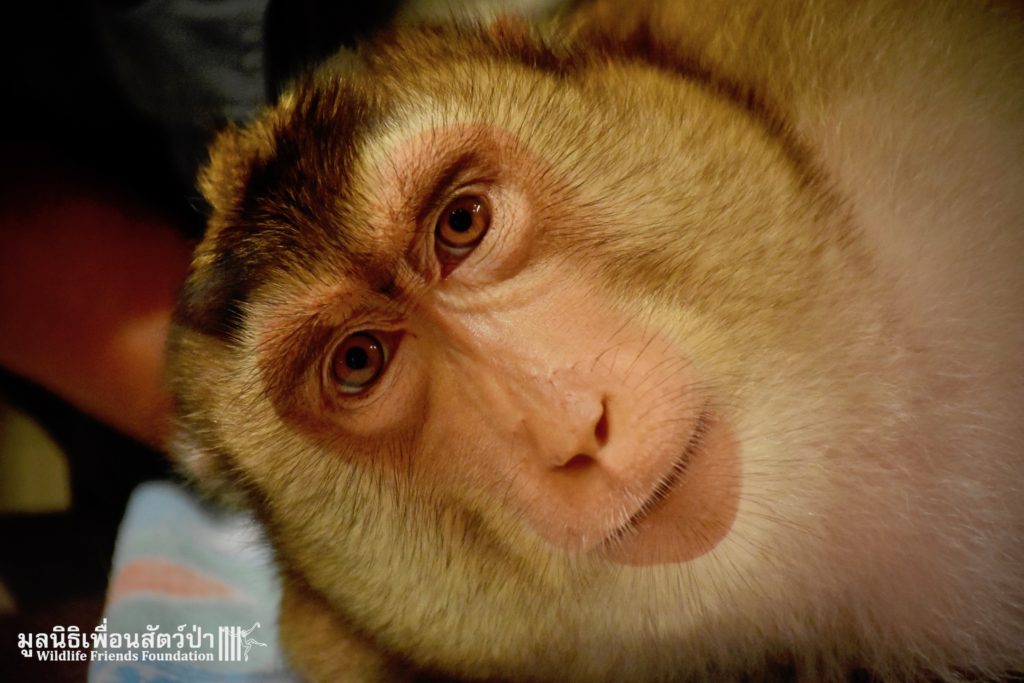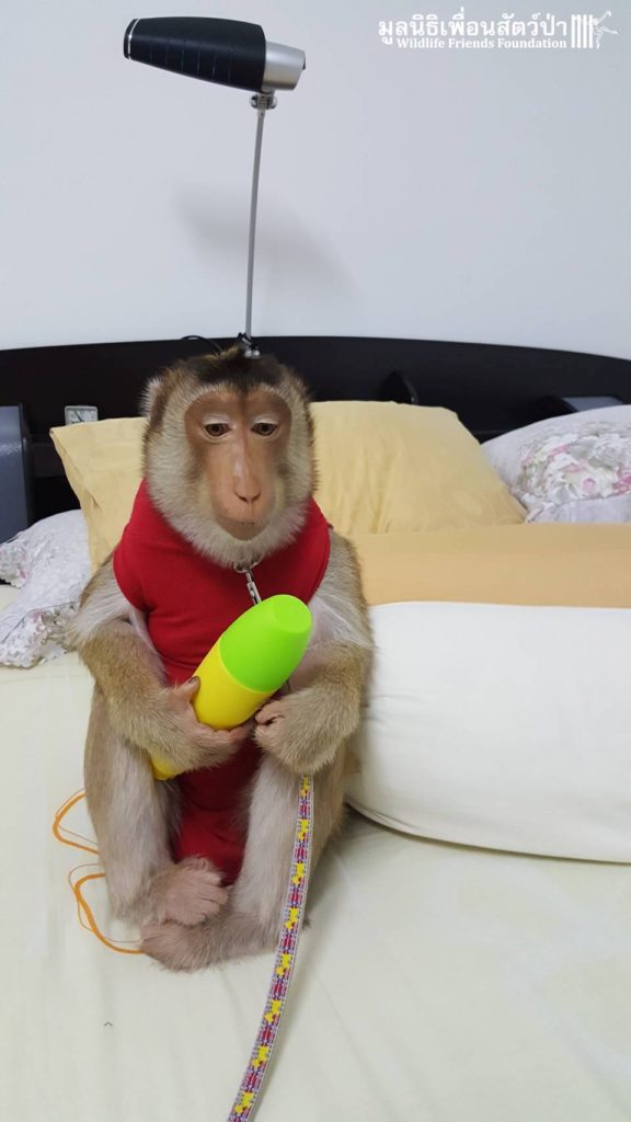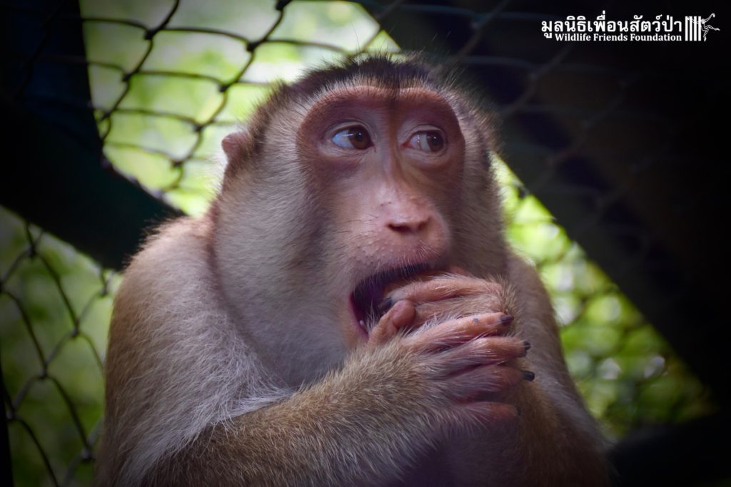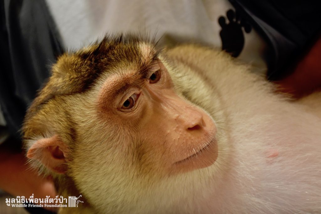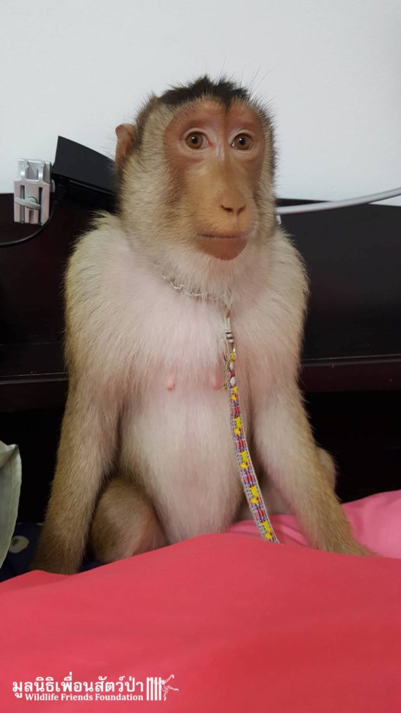 Meet Bobo – a 5-year-old female Southern pig-tailed macaque (Macaca nemestrina) who had been kept as a pet for five years in Samut Songkhram, south of Bangkok. She was purchased illegally from Facebook for 5000THB when she was approximately 3 months old by international resident. The lady in question is going home soon so needed to find a suitable new place for her pet monkey. She was still sleeping in the bed with her owner, and had been provided with a cage in the garden during the day.