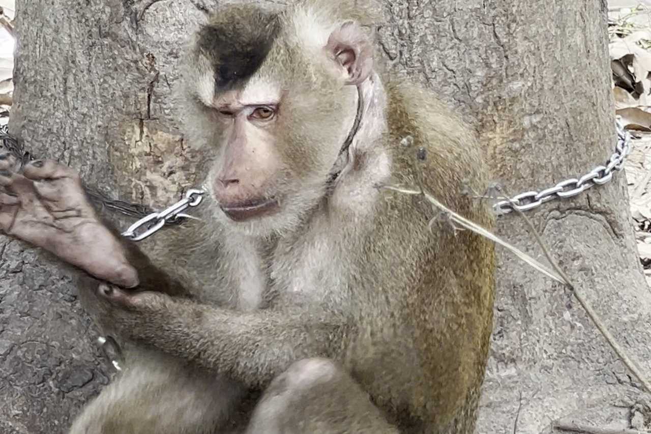 Macaques like Sen are forced to climb trees and harvest coconuts. When they are not working, they are typically kept chained to trees. This restrictive and isolating life leads to severe emotional trauma. The solitary confinement and constant physical abuse inflict deep psychological scars, causing many to develop self-harming behaviours.