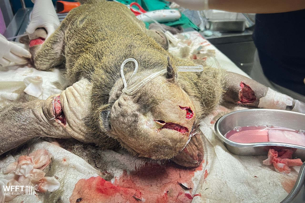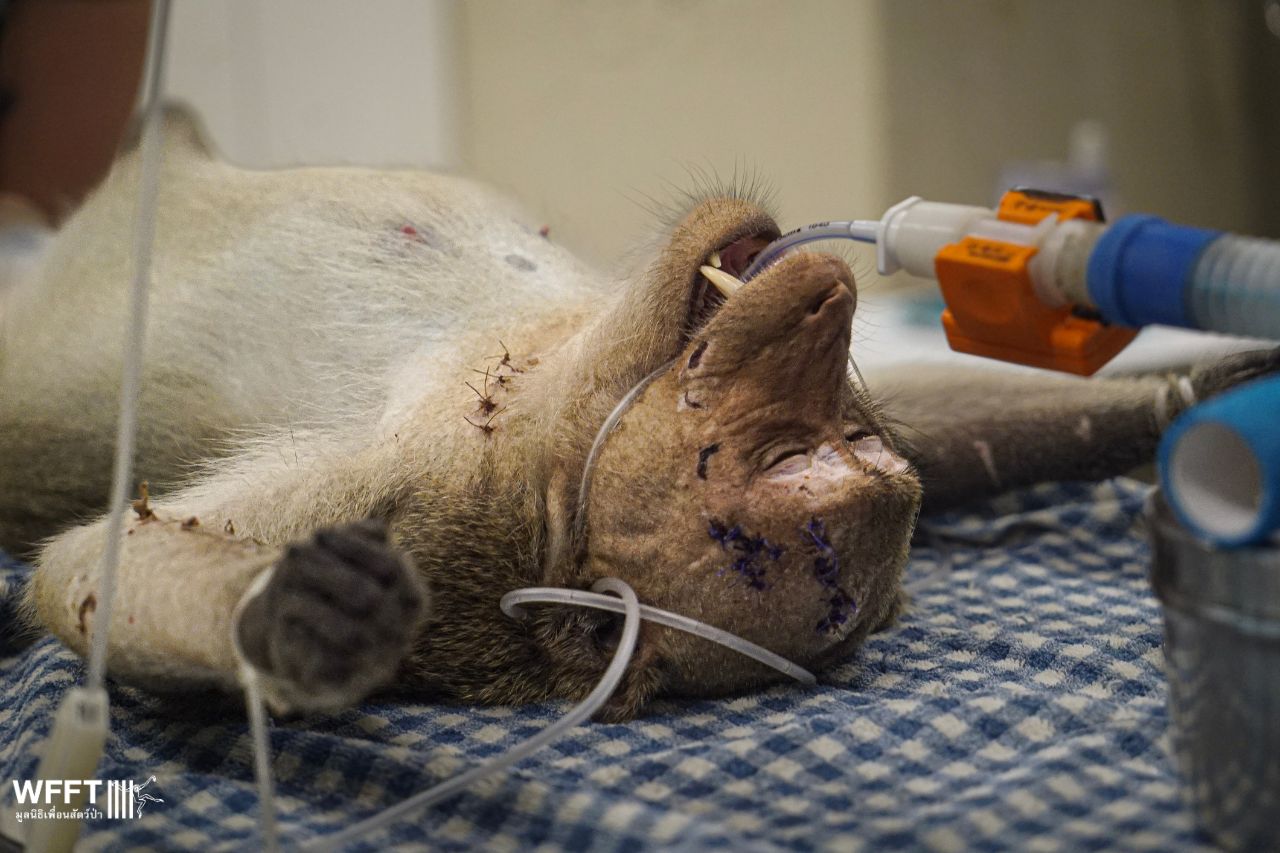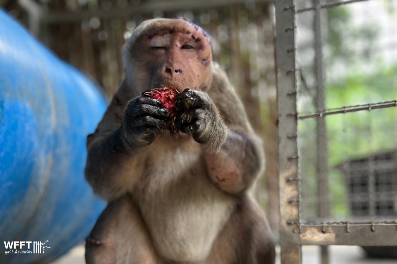 Earlier this month, a poor long-tailed macaque named Duan arrived at our sanctuary as an emergency case. He’d been viciously attacked by other monkeys, suffering horrific wounds that required intensive care and stitches all over his body and head. It’s truly a miracle he survived.