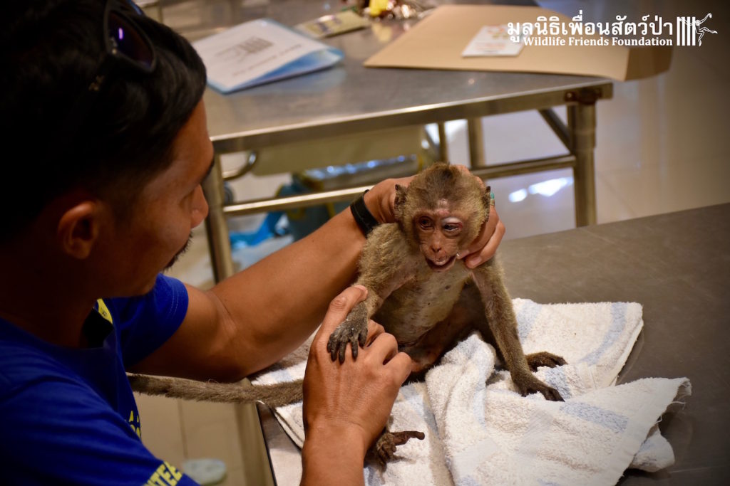 The WFFT Wildlife Rescue Team received a call from some concerned locals that had found a young female long-tailed macaque (Macaca fascicularis) that had been electrocuted and had fallen to the ground. The team headed straight out to help this little monkey. During the initial health check no visible signs of major injuries were seen. She was taken straight back to the WFFT Wildlife Hospital for further assessments.
