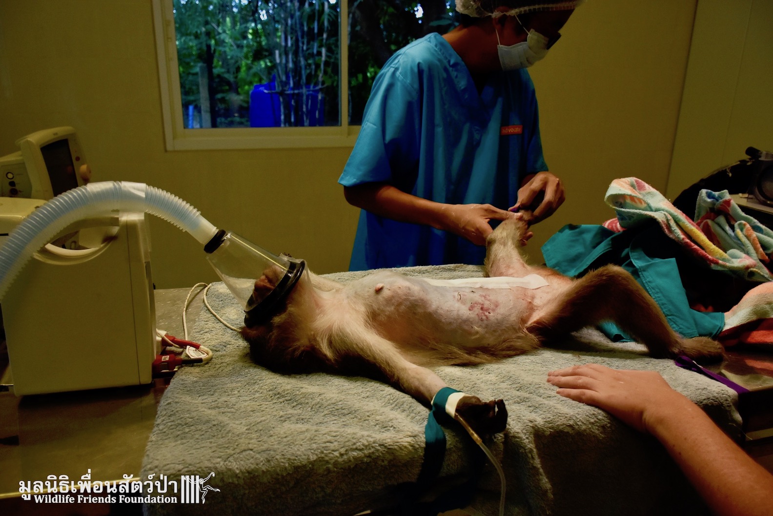 Yesterday we received a telephone call from a concerned resident in Hua Hin, who had found a severely injured female long-tailed macaque (Macaca fascicularis) next to a garbage collection area at the side of a busy road. The WFFT Wildlife Rescue Team headed straight to try and save this monkey. Open arrival to the scene they found a very weak, almost unresponsive macaque on the ground. We do not know why she was found in such a weakened state, she may have been involved in a road traffic accident, or be suffering from an illness. She was loaded on the rescue vehicle and rushed straight to an animal x-ray clinic to help the vet team properly diagnose the problem. She was then transported to the WFFT Wildlife Hospital for further assessment and treatment.