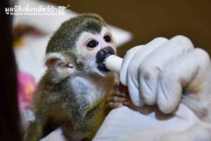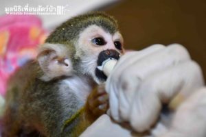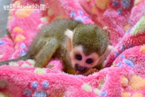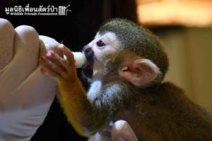 สัปดาห์นี้มีครอบครัวจากกรุงเทพเดินทางมาที่WFFTพร้อมกับลูกลิงกระรอก (Squirrel monkey) ชื่อ” ฟร๊อง” พวกเขาได้ซื้อฟร๊องมาจากฟาร์มสัตว์แปลกขณะนั้นอายุเพียงแค่ 6 สัปดาห์ ก่อนซื้อเจ้าของได้ศึกษาข้อมูลอย่างถี่ถ้วนและเตรียมอุปกรณ์ทุกอย่างที่ลิงอย่างฟร๊องจำเป็นต้องใช้ในชีวิตไม่ว่าจะเป็น อาหาร ผ้าห่ม ไฟให้ความอบอุ่น วิตามิน แต่เมื่อรับมาเลี้ยงจริงๆ ทำให้พวกเขารู้ว่า ฟร๊อง ต้องการความดูเเลเป็นพิเศษสูงกว่านั้น ต้องป้อนนมทุก 3 ชั่วโมง ต้องรับแสงแดดที่มีทั้งUVA UVB ต้องควบคุมอุณหภูมิในห้องให้เหมาะสมและนั่นเริ่มทำให้เขาตระหนักว่าการนำสัตว์ป่ามาเลี้ยงในวิถีชีวิตเดียวกับมนุษย์นั้นไม่เหมาะสมอย่างยิ่งและยังทำให้สุขภาพของเจ้าของย่ำแย่ลงอีกด้วย