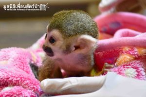 This week a family travelled from Bangkok to WFFT with a very young Common Squirrel monkey (Saimiri.) named ‘France’. The owner told us he bought France from an exotic pet farm in Thailand; at that time (2 weeks ago) he was only six weeks old. Before buying him, the owner had researched and prepared all the necessities such as specific foods and milk, blankets, particular heat light bulbs, and vitamins. Unfortunately the shopping list did not, nor could it, include France’s real mother.