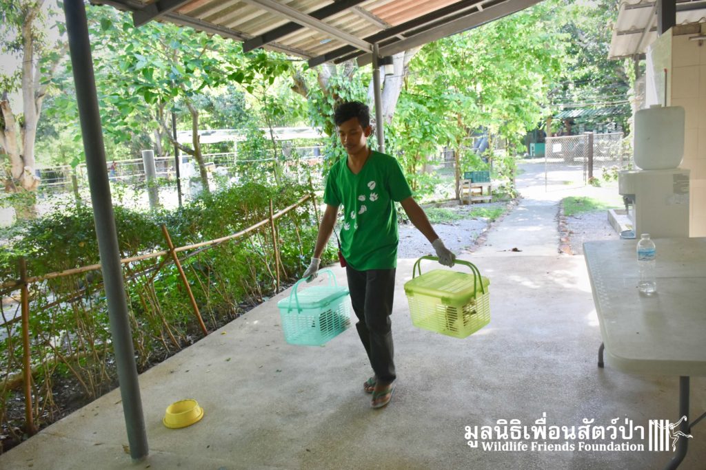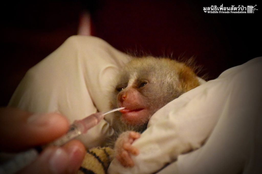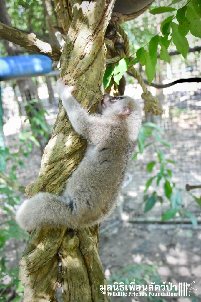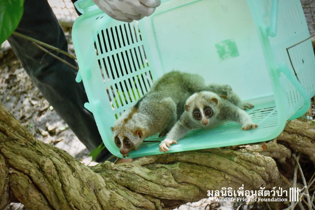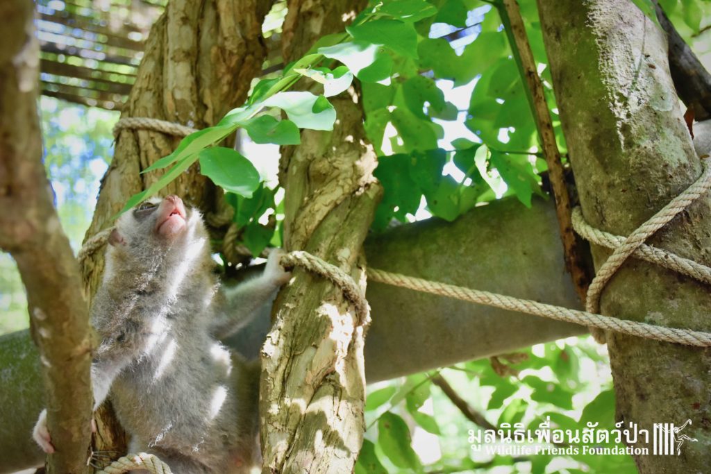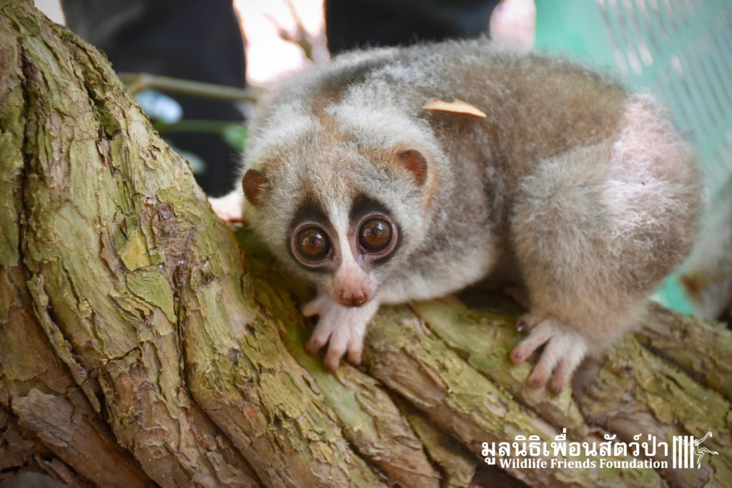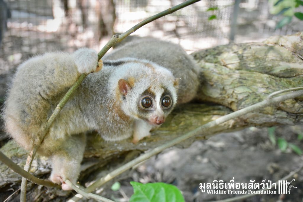 Two young rescued Bengal slow loris (Nycticebus bengalensis) have moved onto the next stage of rehabilitation, after spending the past few months under the intensive care of the WFFT Vet Team. Froggy and Makham have moved to one of WFFT’s Loris Rehabilitation cages in our forest area, both were orphaned babies when they arrived at WFFT.