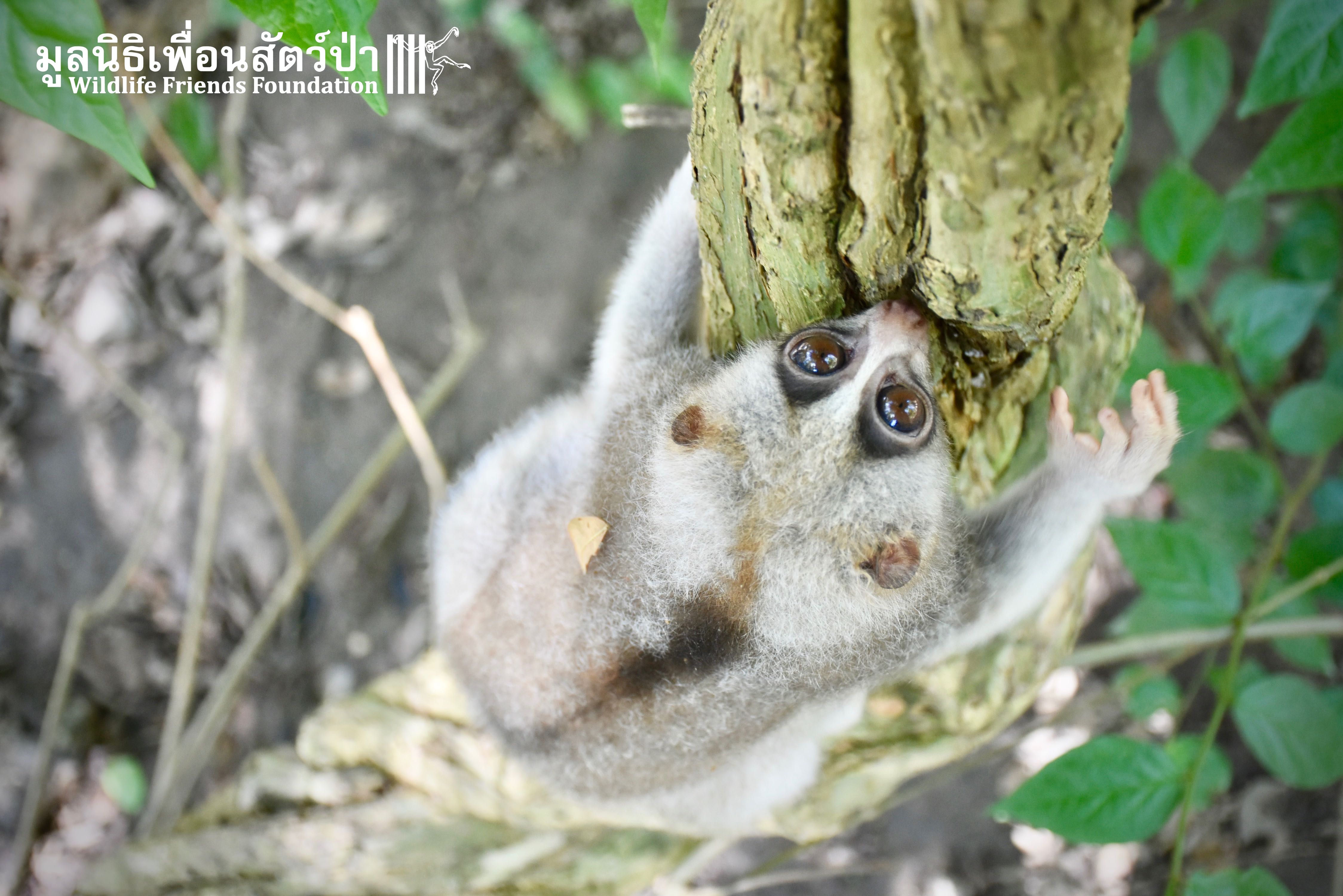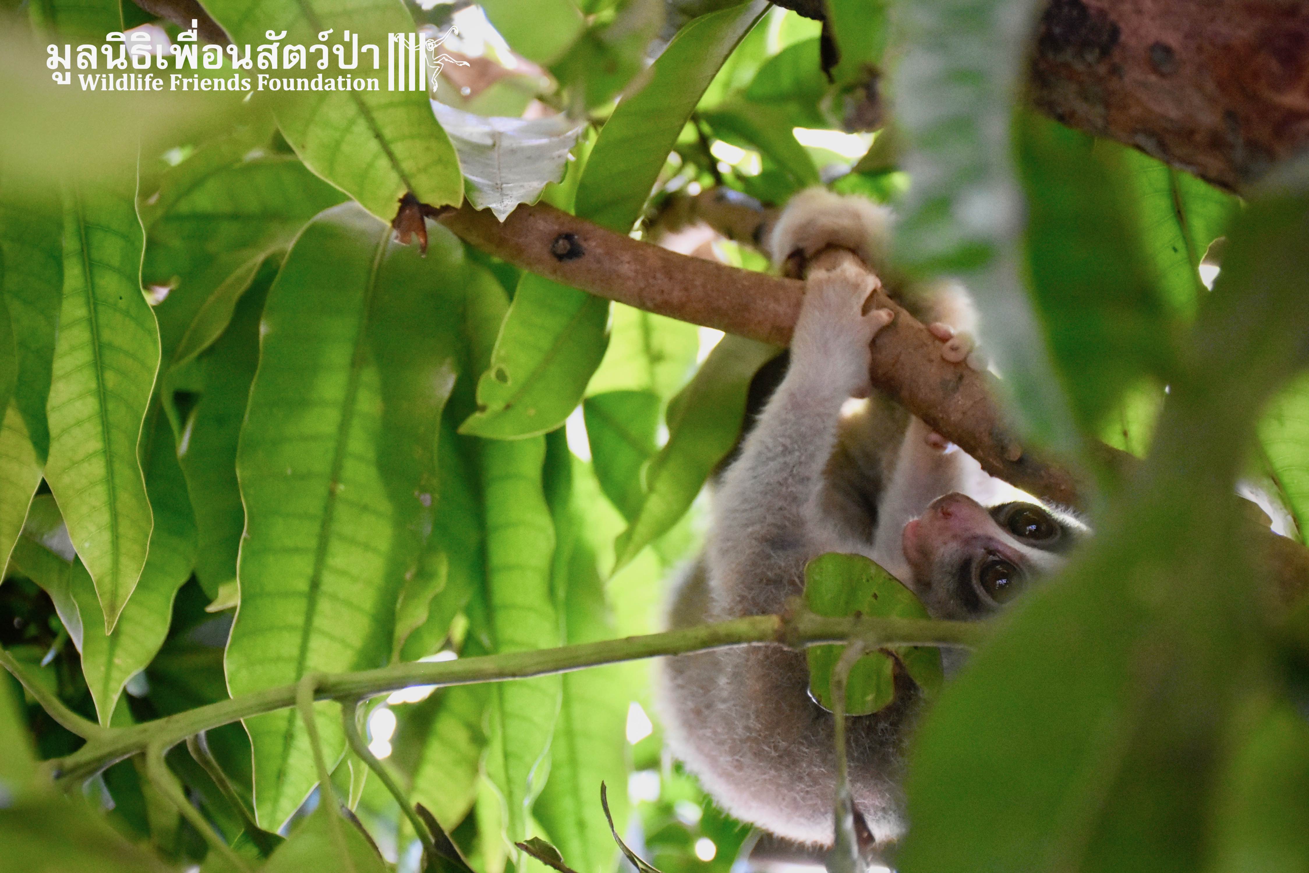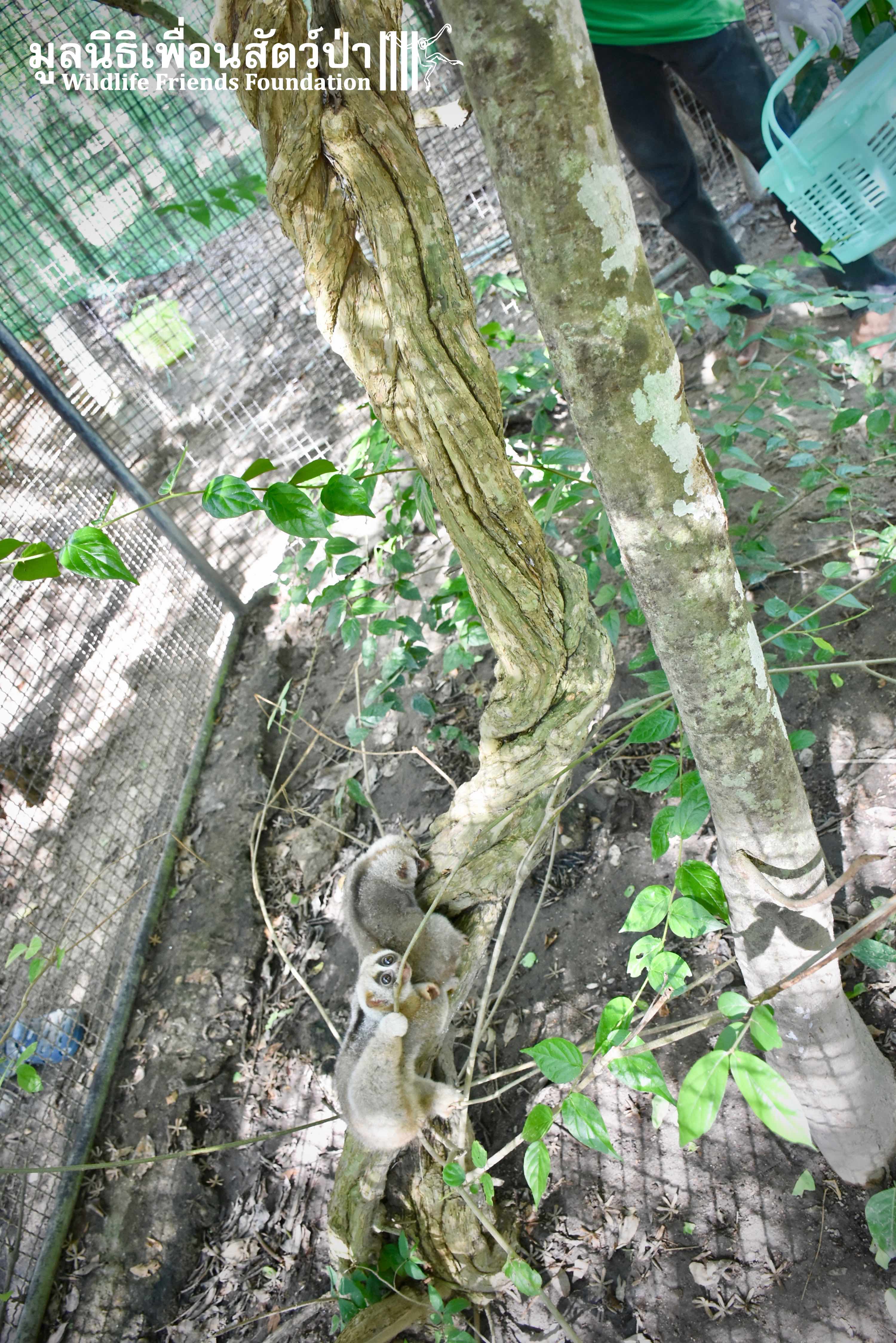 Two young rescued Bengal slow loris (Nycticebus bengalensis) have moved onto the next stage of rehabilitation, after spending the past few months under the intensive care of the WFFT Vet Team. Froggy and Makham have moved to one of WFFT’s Loris Rehabilitation cages in our forest area, both were orphaned babies when they arrived at WFFT.