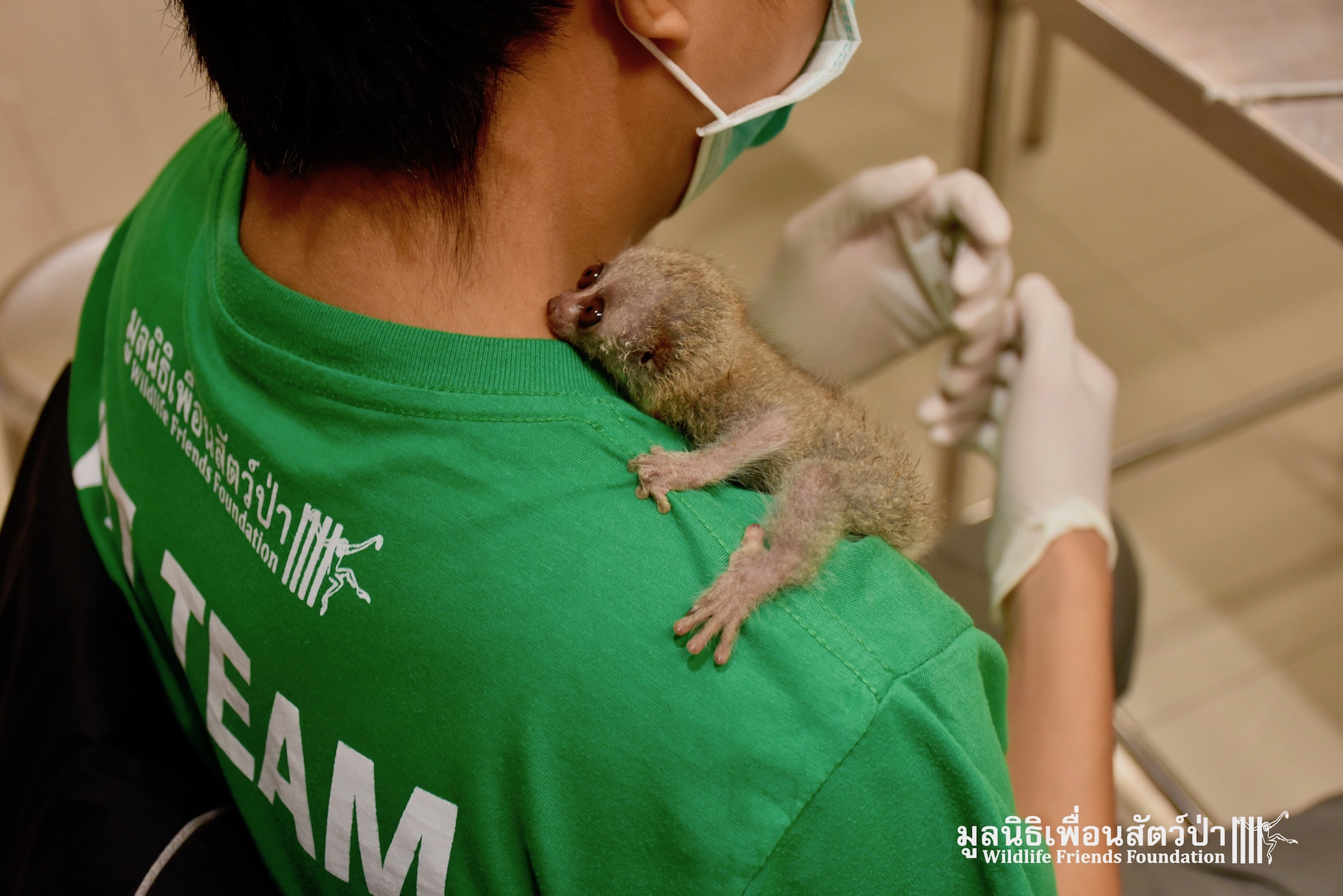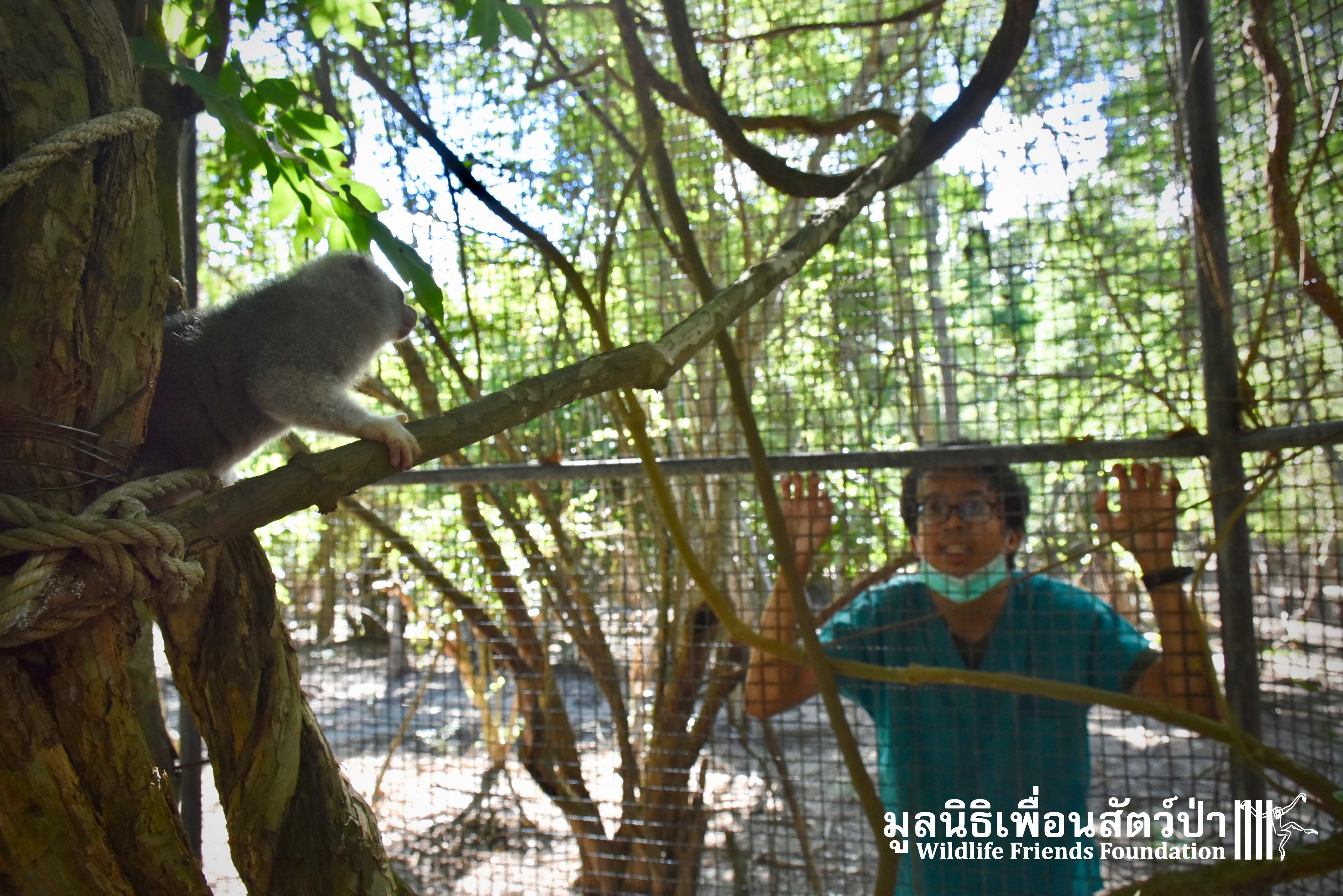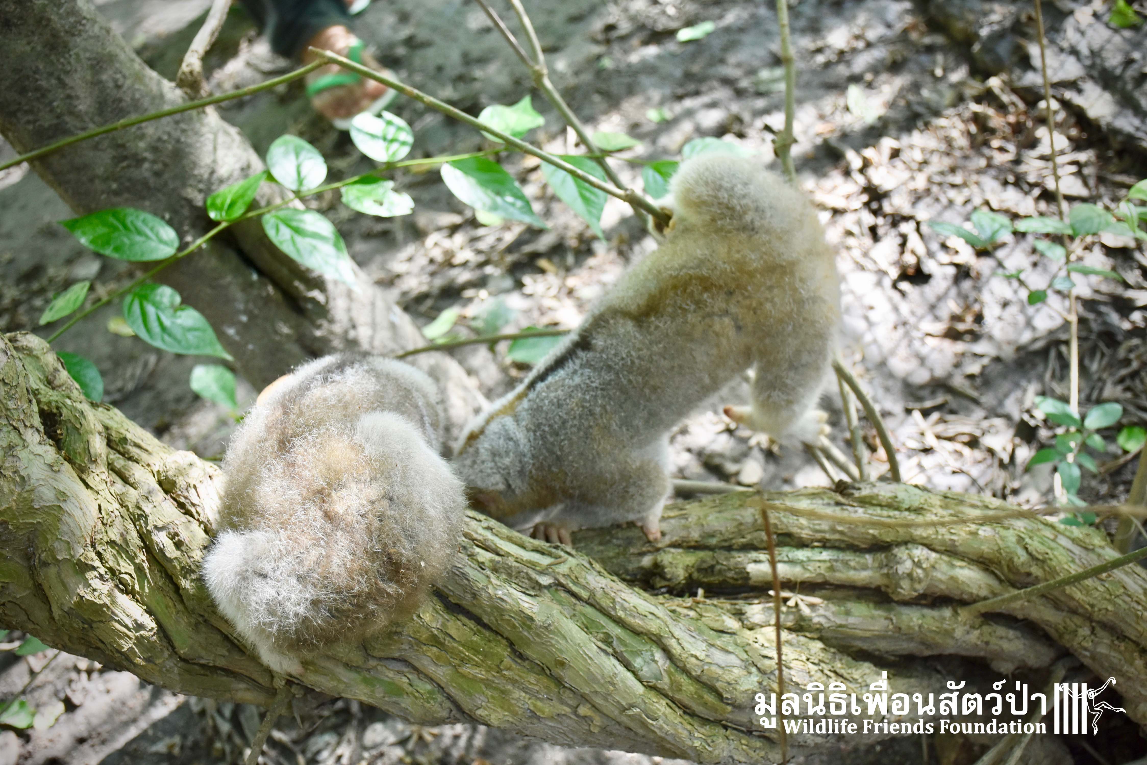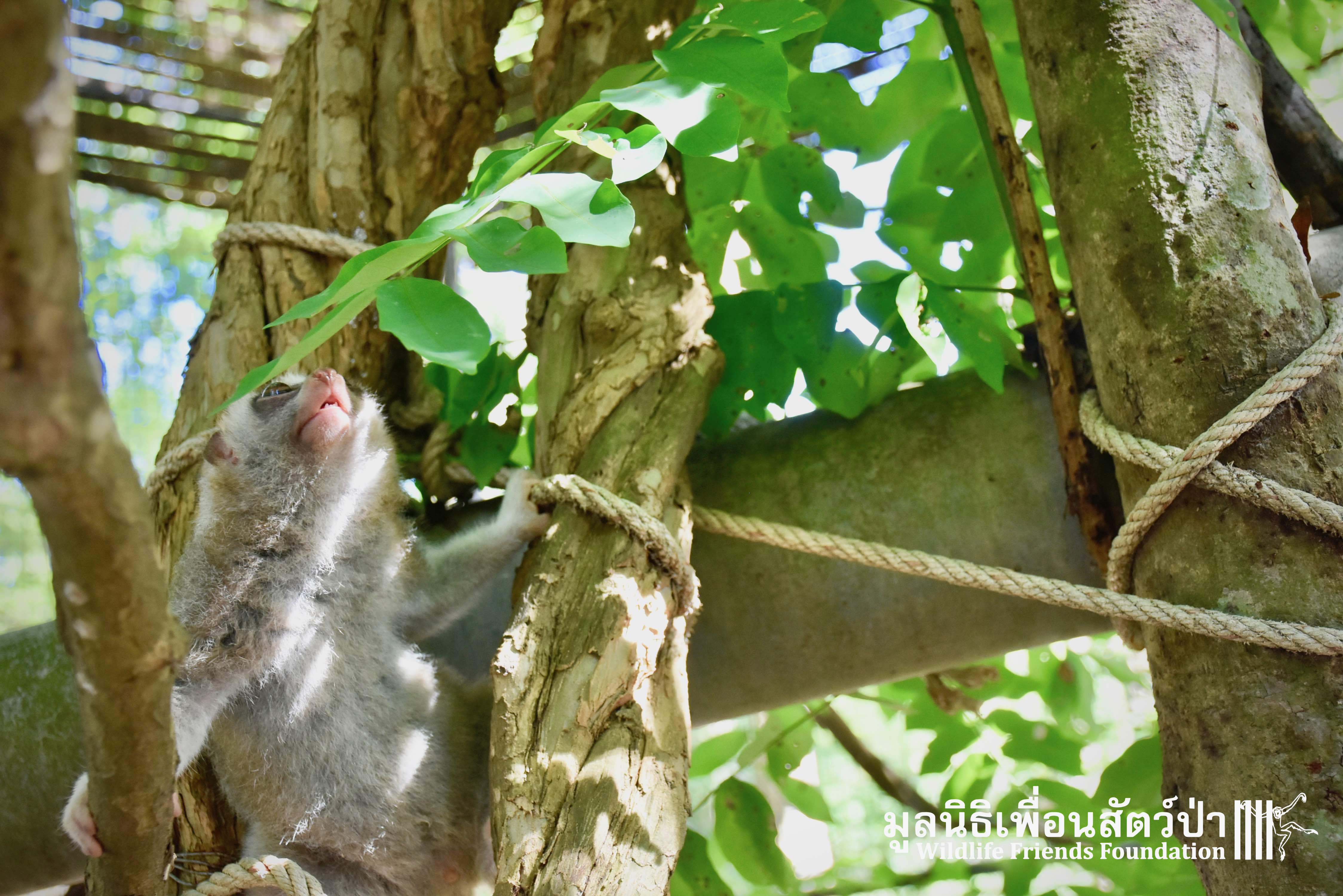 Two young rescued Bengal slow loris (Nycticebus bengalensis) have moved onto the next stage of rehabilitation, after spending the past few months under the intensive care of the WFFT Vet Team. Froggy and Makham have moved to one of WFFT’s Loris Rehabilitation cages in our forest area, both were orphaned babies when they arrived at WFFT.