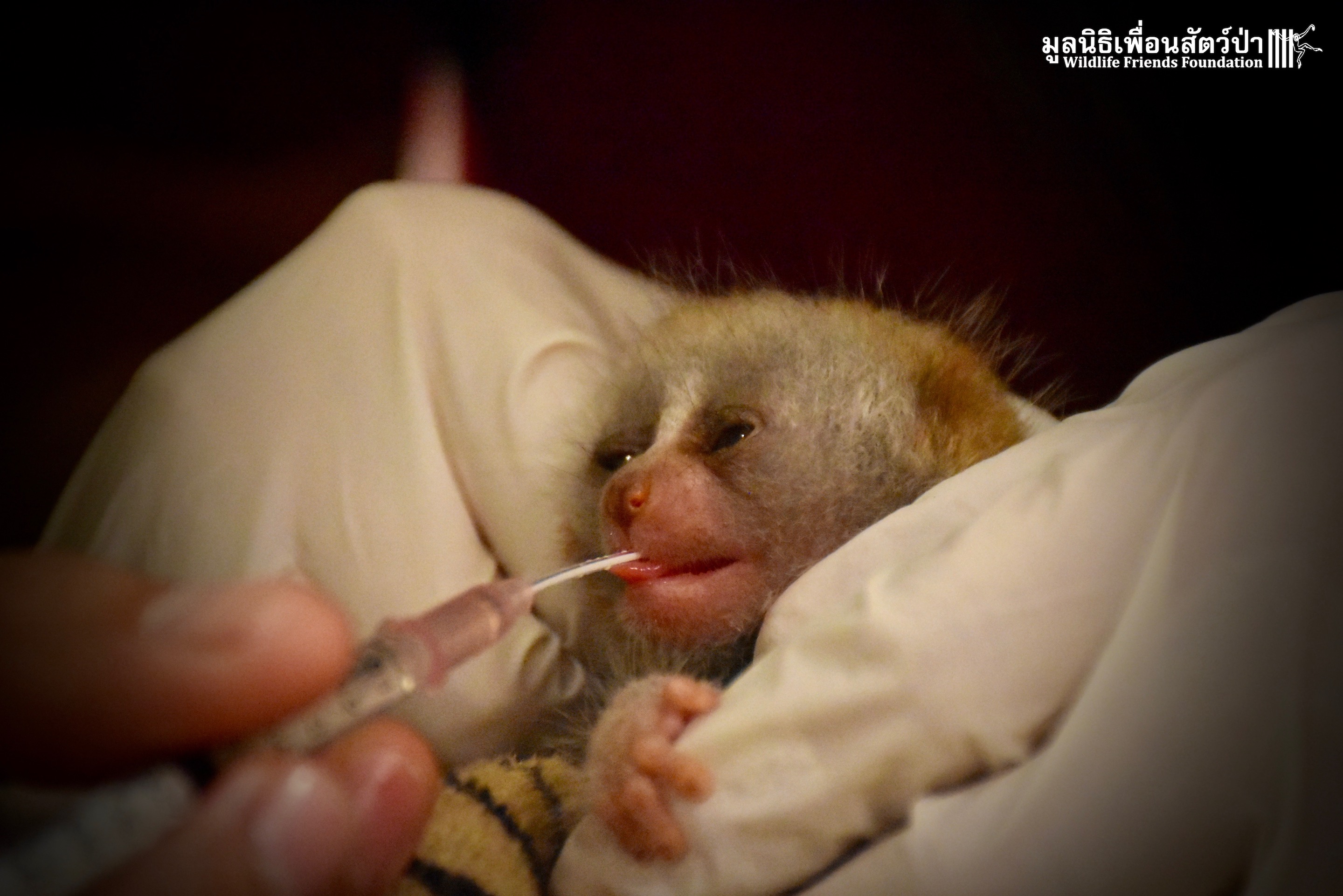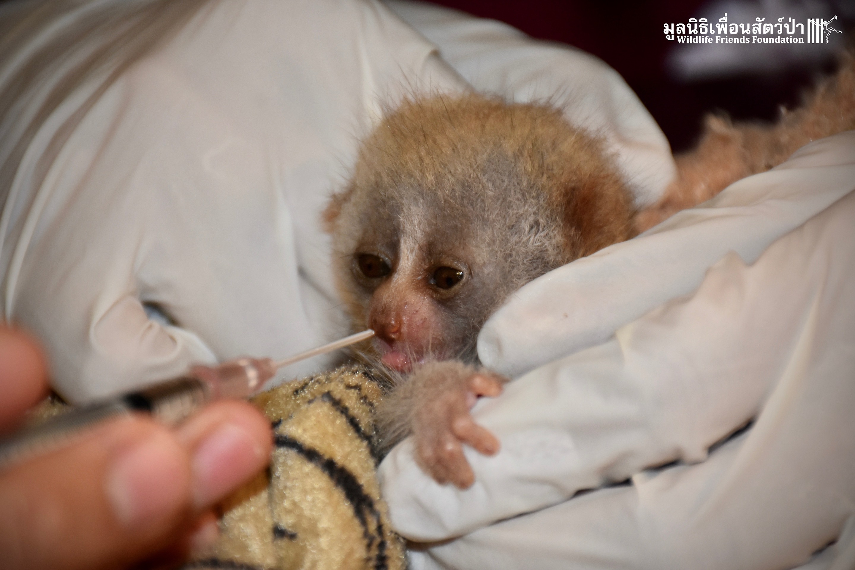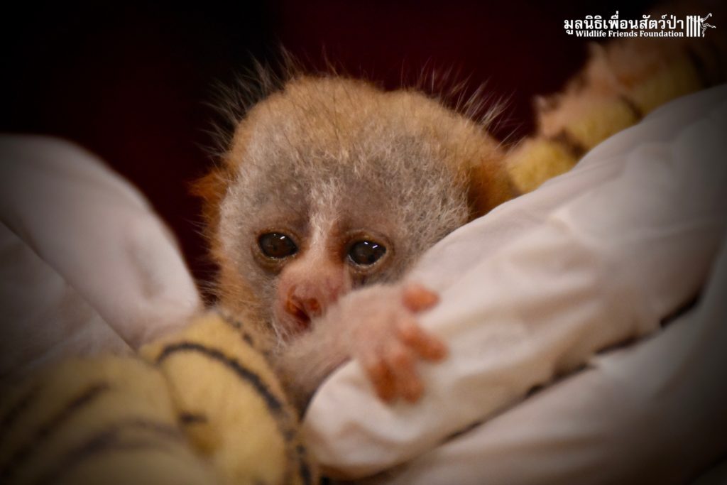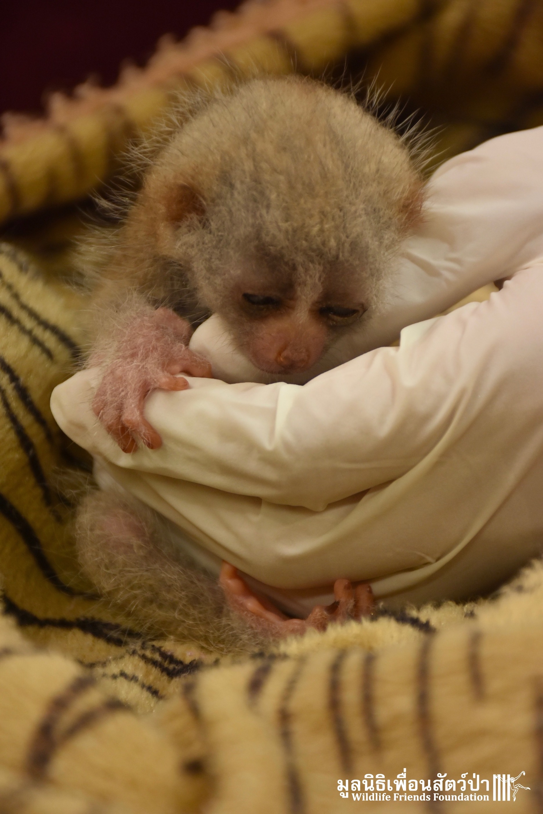 Meet little Froggy the infant Bengal slow loris (Nycticebus bengalis) who brought into the WFFT Wildlife Hospital yesterday evening. He had been found on the floor outside a temple in Phetchaburi by a monk, he was saved from being eaten by the dogs at the temple. It seems he had fallen out of a tree, we do not know why this happened. Upon arrival to WFFT little Froggy was was cold and in need of some warmth and food. He was immediately given electrolytes and fluids to build up his strength. He was under the intensive care of our head veterinarian throughout the night.