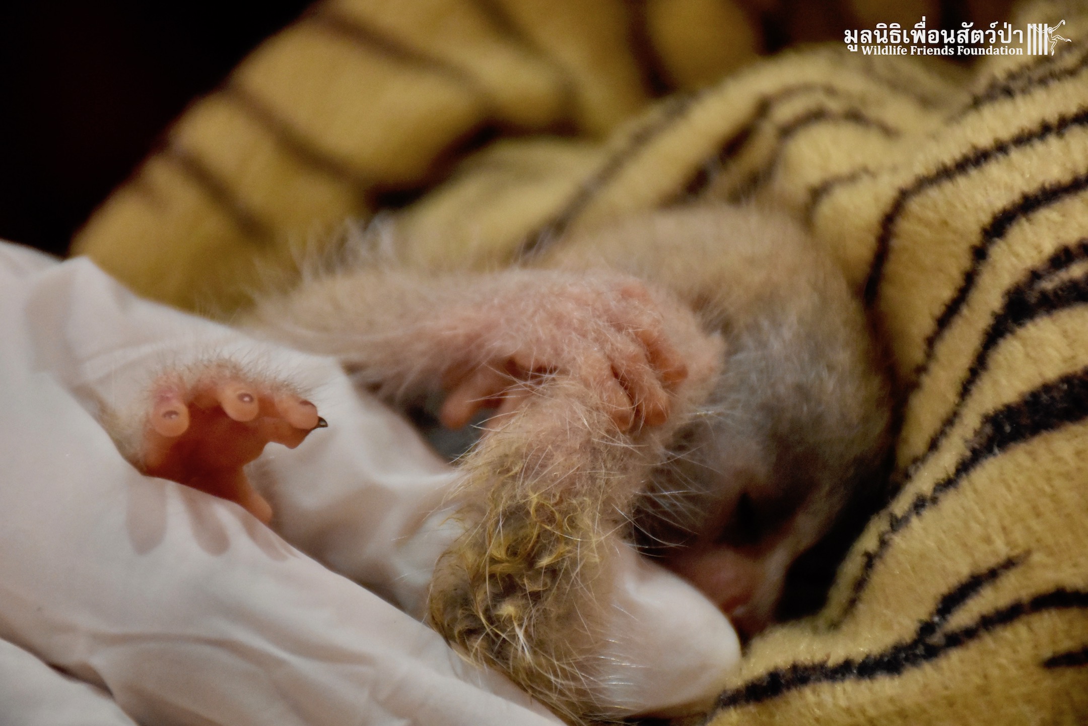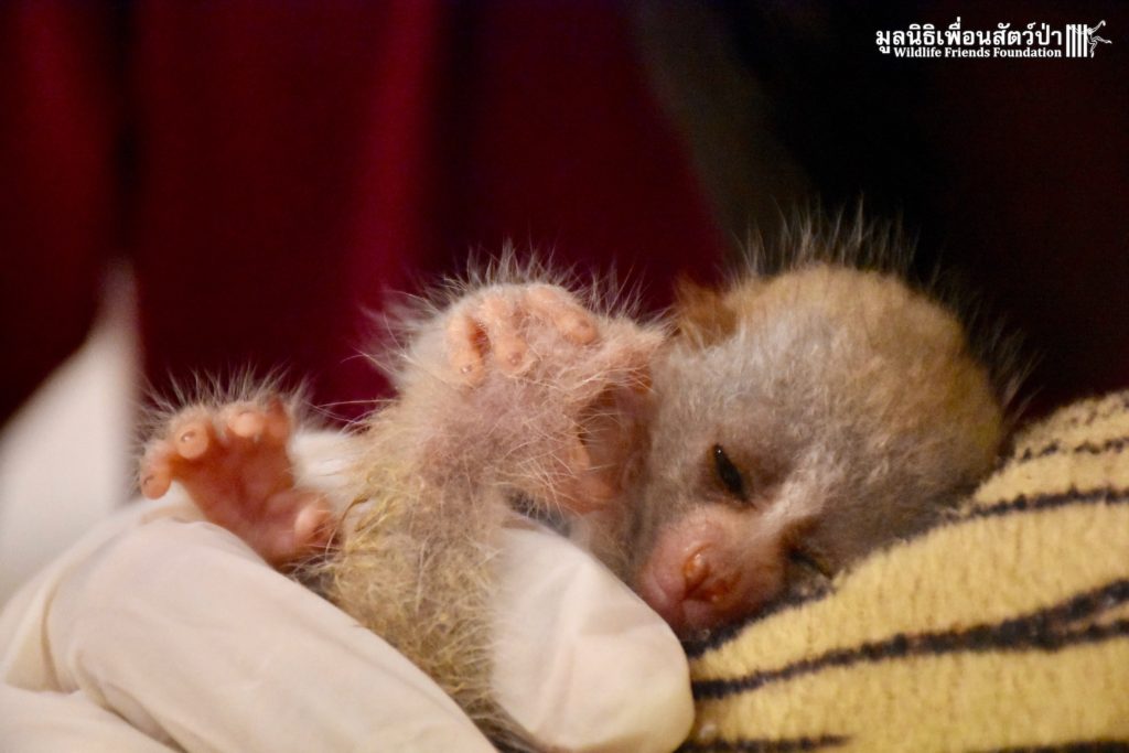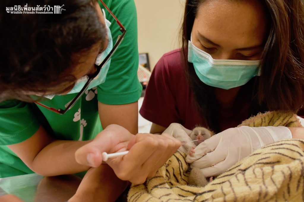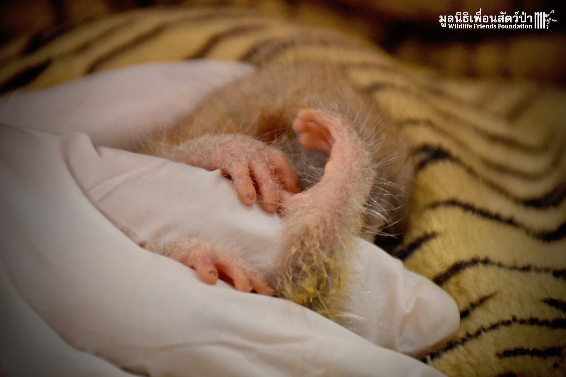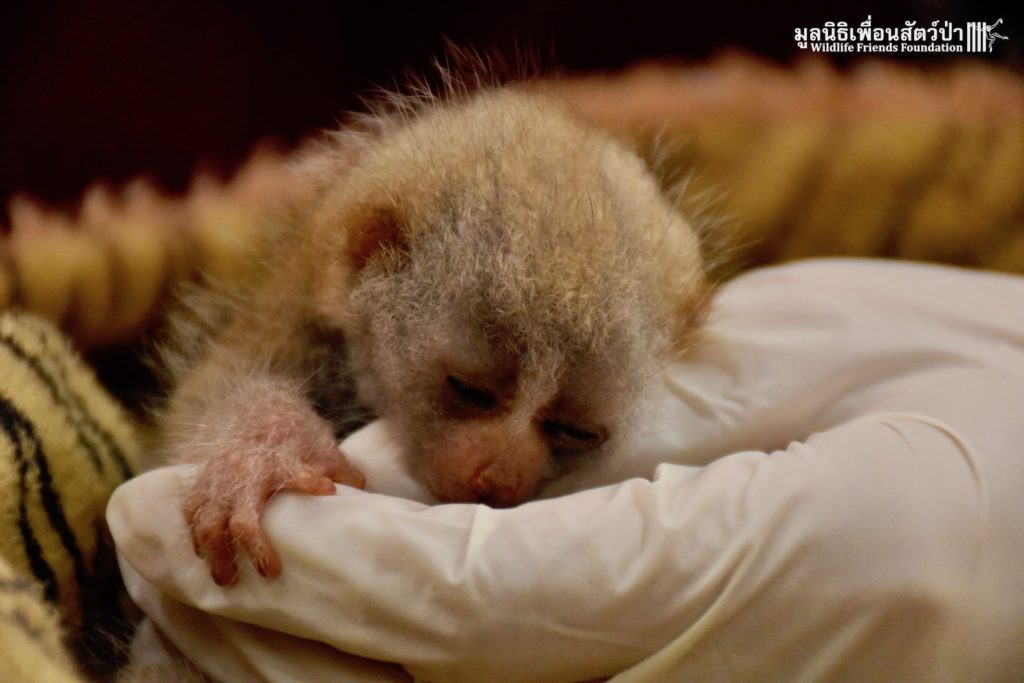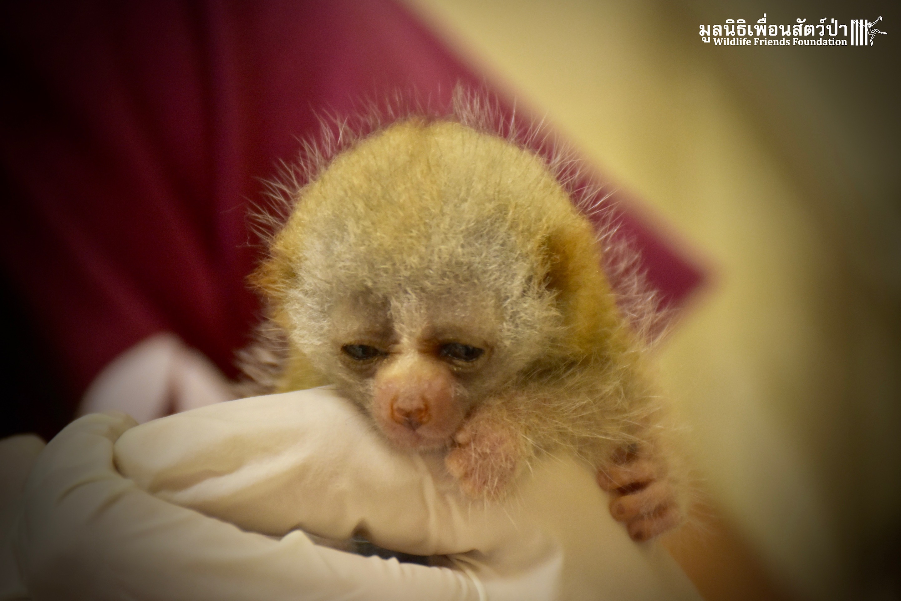 Meet little Froggy the infant Bengal slow loris (Nycticebus bengalis) who brought into the WFFT Wildlife Hospital yesterday evening. He had been found on the floor outside a temple in Phetchaburi by a monk, he was saved from being eaten by the dogs at the temple. It seems he had fallen out of a tree, we do not know why this happened. Upon arrival to WFFT little Froggy was was cold and in need of some warmth and food. He was immediately given electrolytes and fluids to build up his strength. He was under the intensive care of our head veterinarian throughout the night.