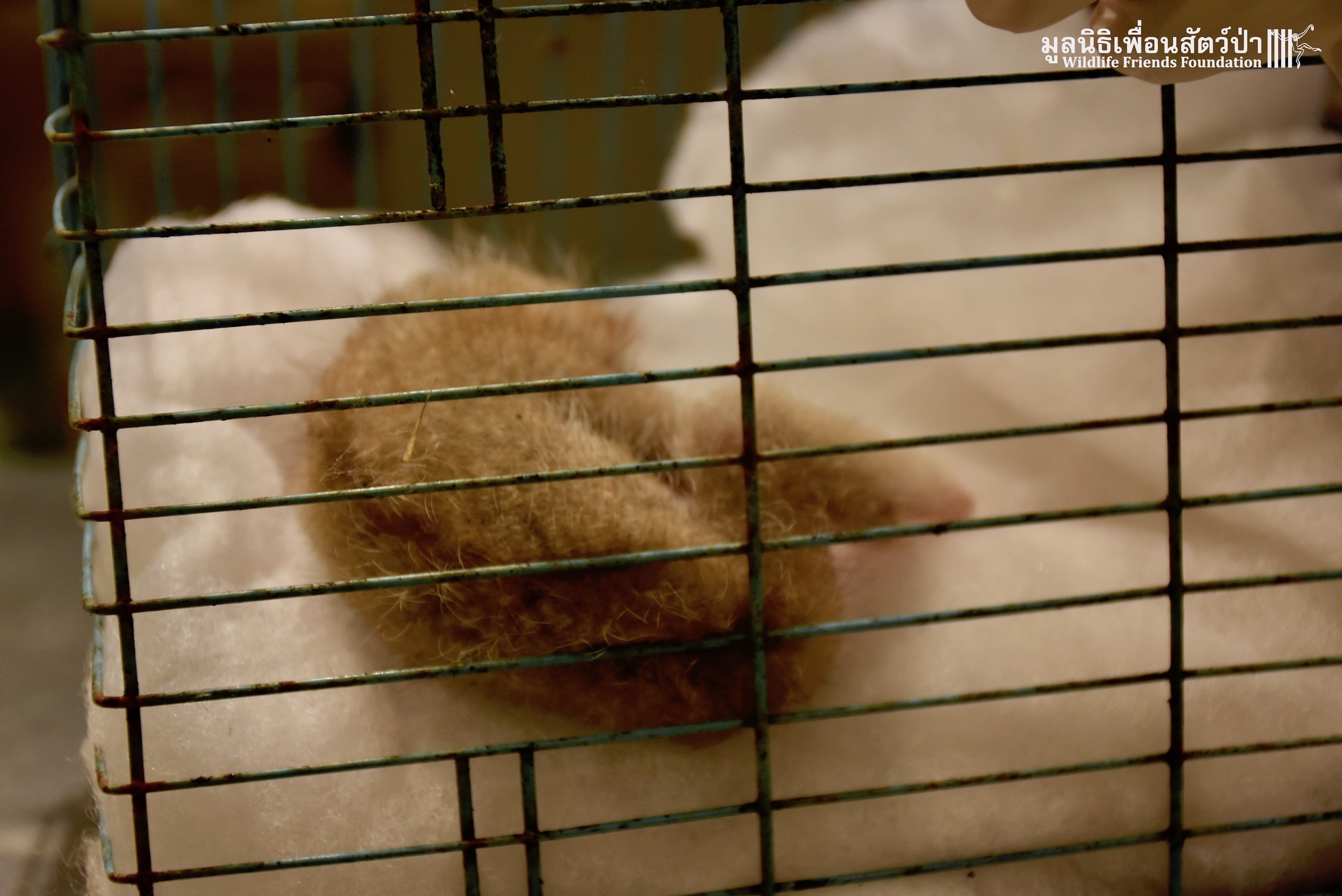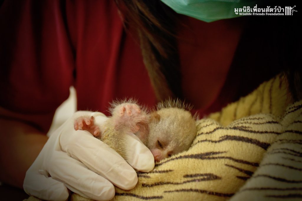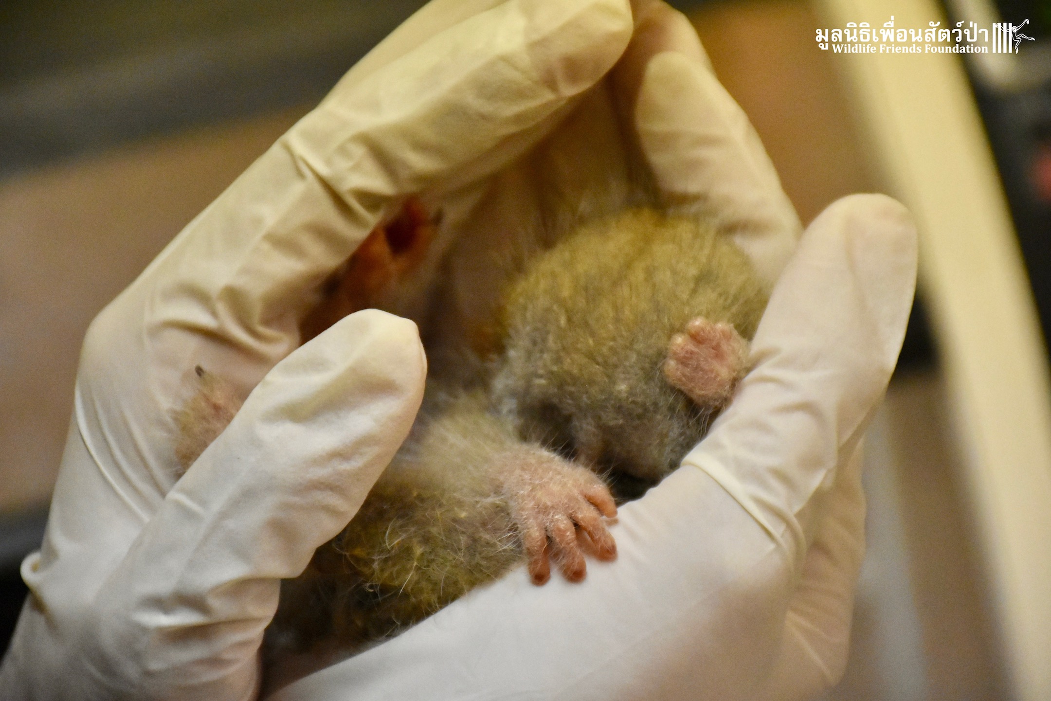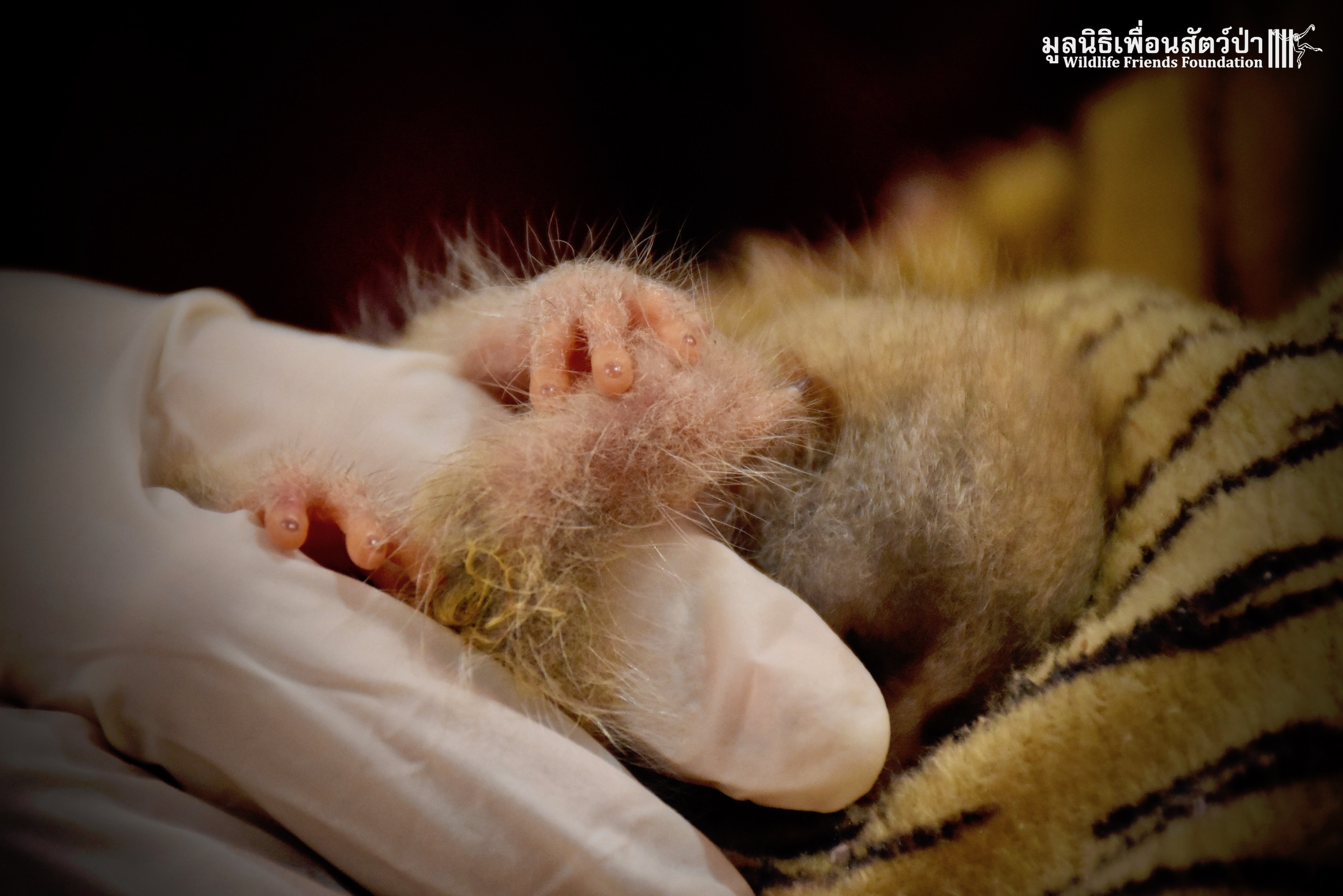 Meet little Froggy the infant Bengal slow loris (Nycticebus bengalis) who brought into the WFFT Wildlife Hospital yesterday evening. He had been found on the floor outside a temple in Phetchaburi by a monk, he was saved from being eaten by the dogs at the temple. It seems he had fallen out of a tree, we do not know why this happened. Upon arrival to WFFT little Froggy was was cold and in need of some warmth and food. He was immediately given electrolytes and fluids to build up his strength. He was under the intensive care of our head veterinarian throughout the night.