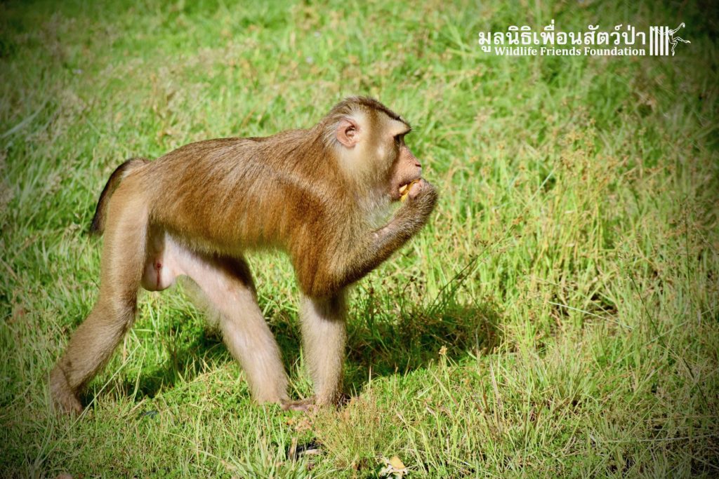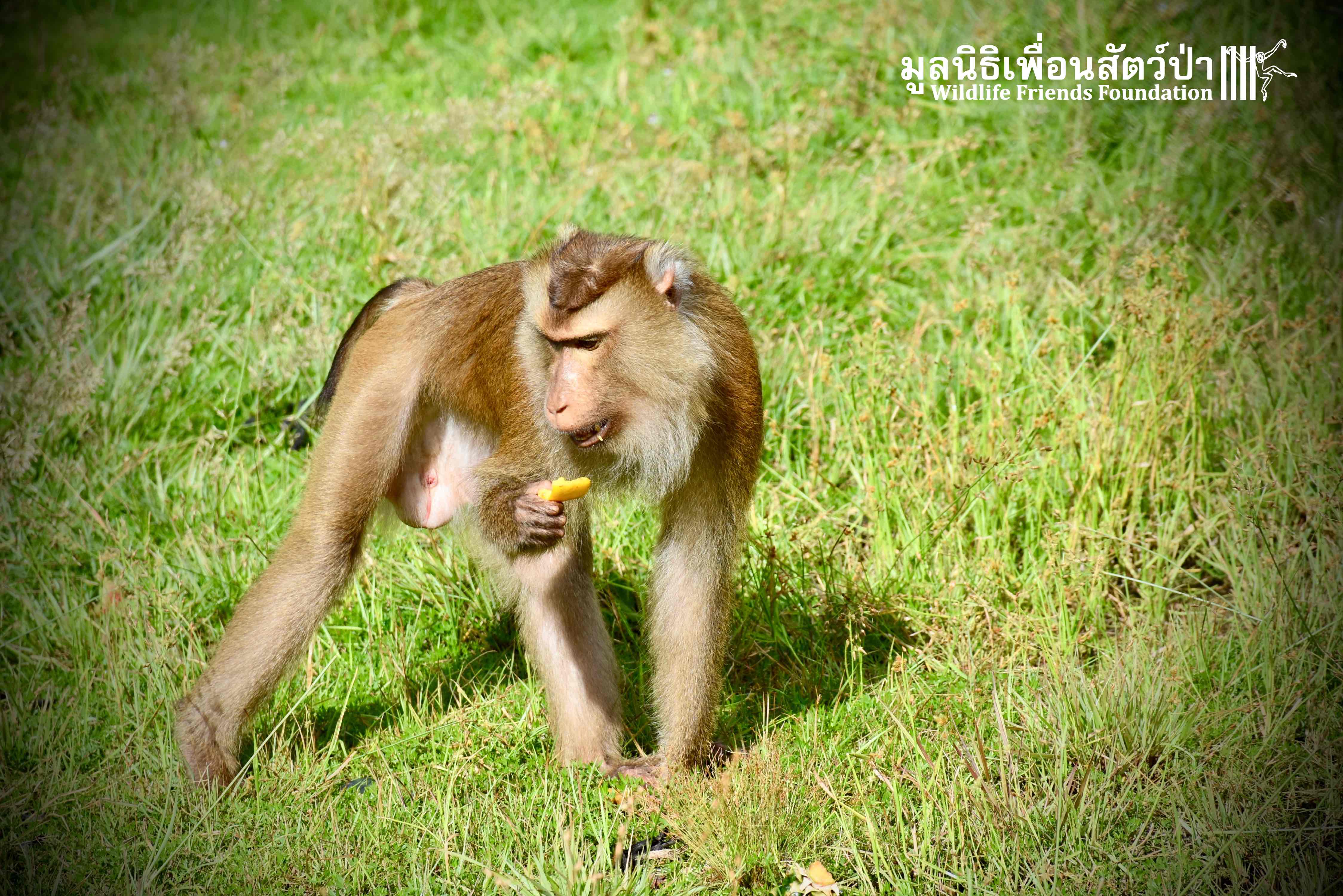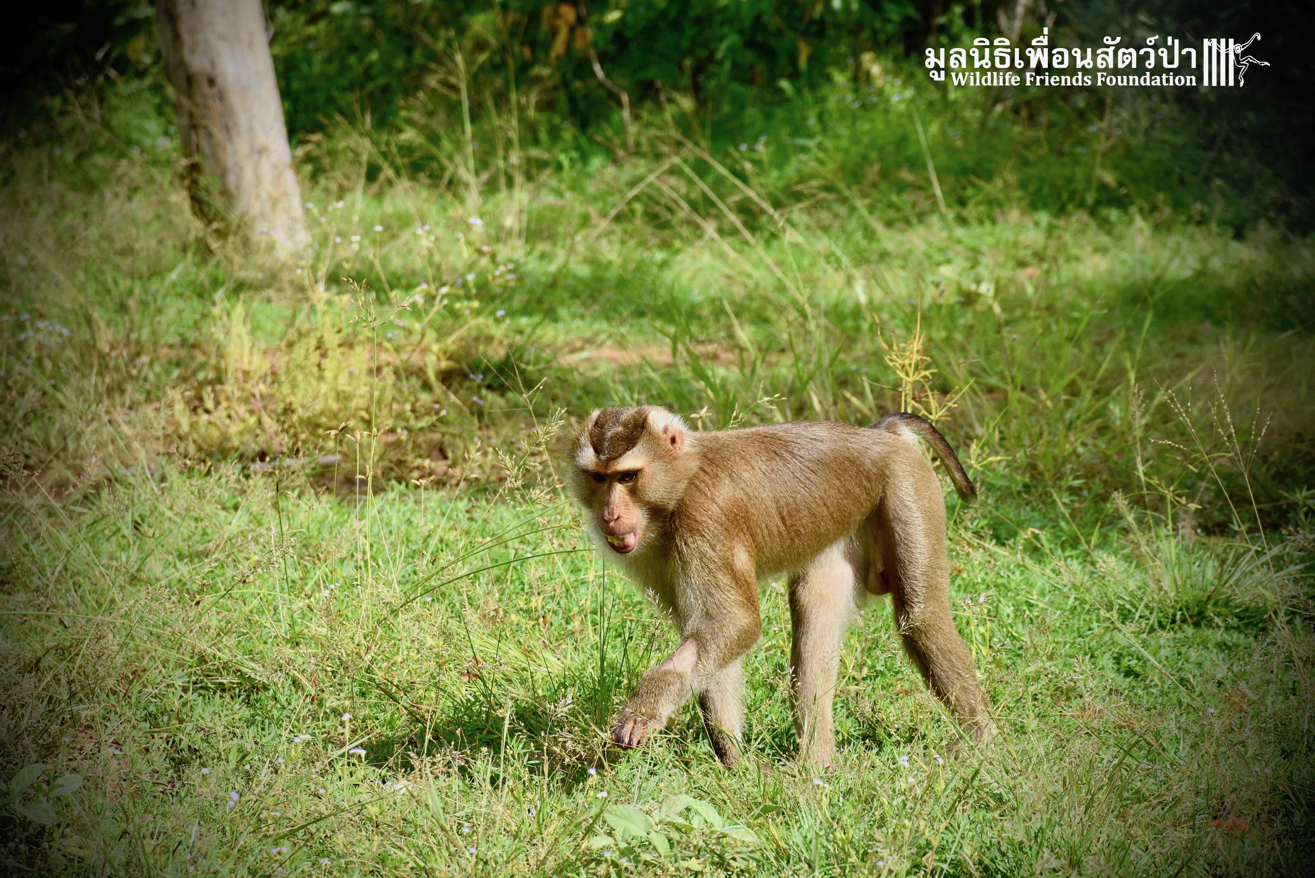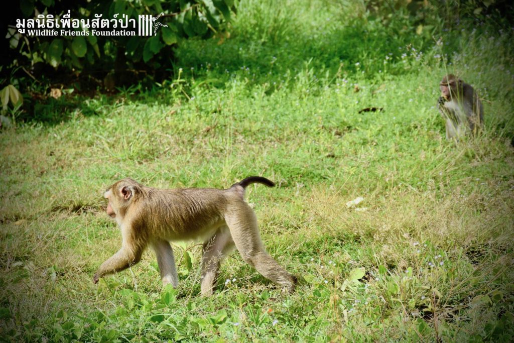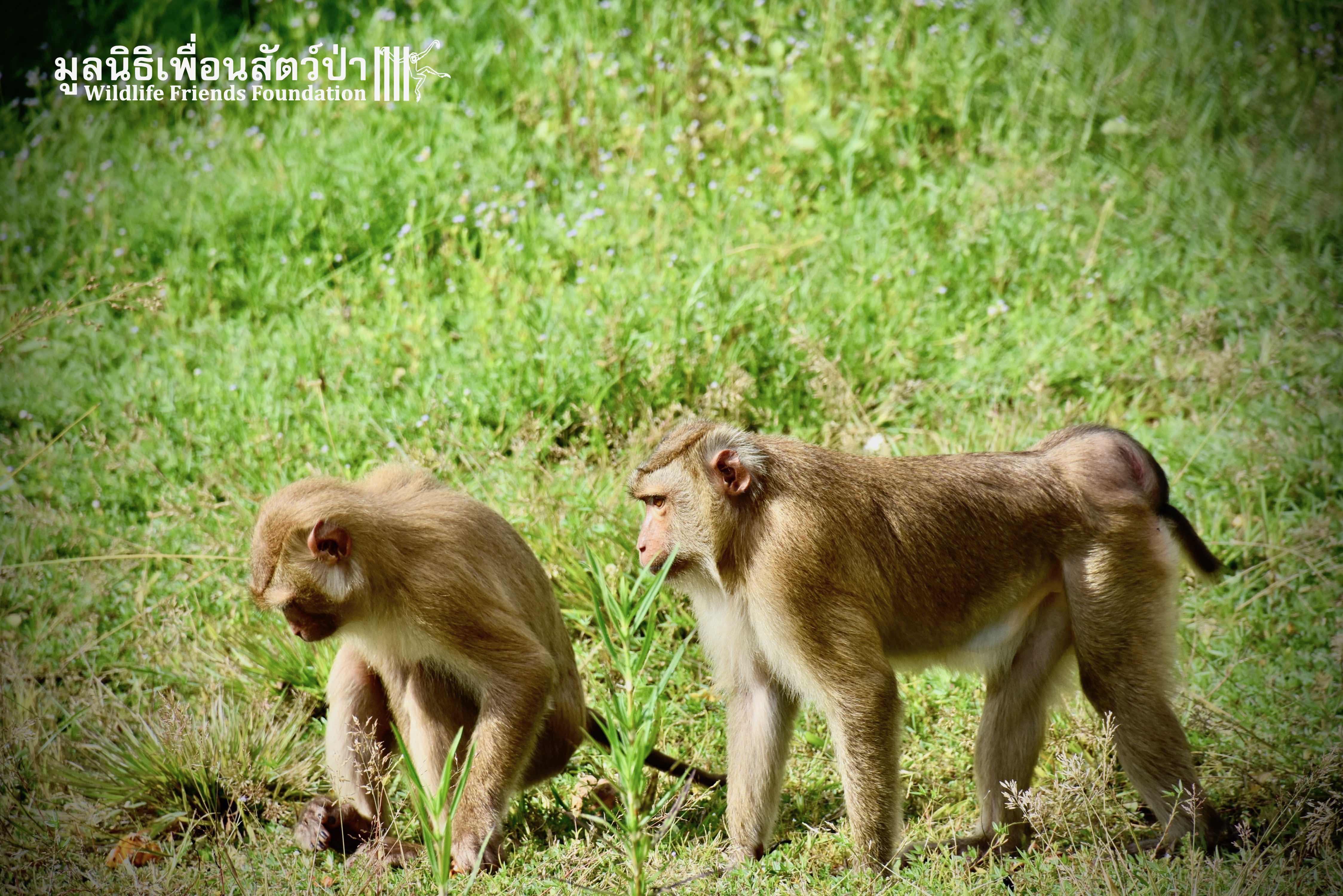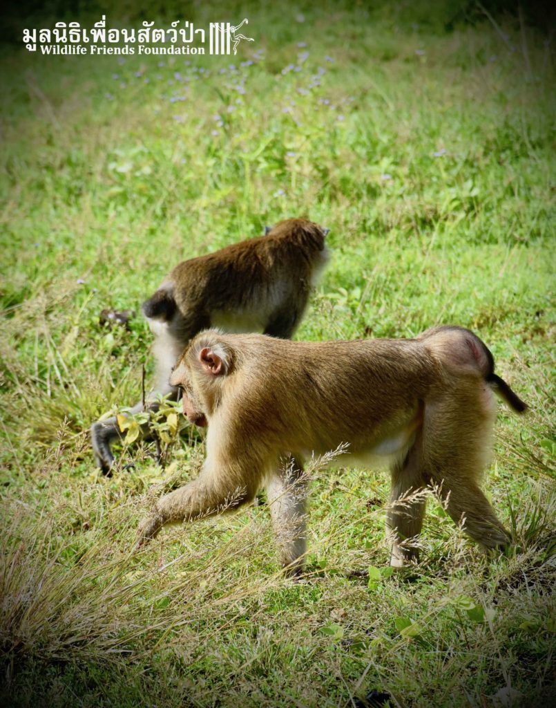 Two young male Northern pig-tailed macaques (Macaca leonina) who were rescued just over a year ago have been successfully integrated into a troop of 17 other macaques, and now call a huge open field their home.