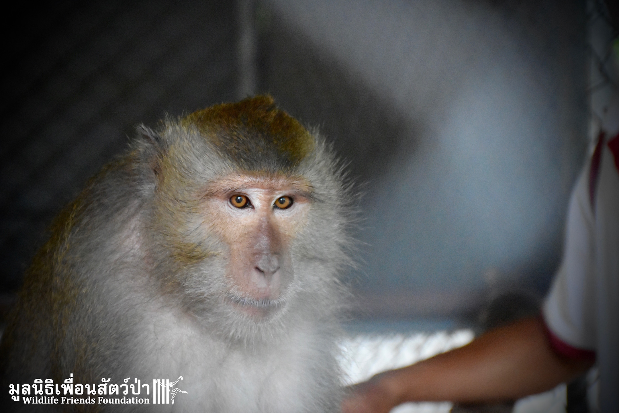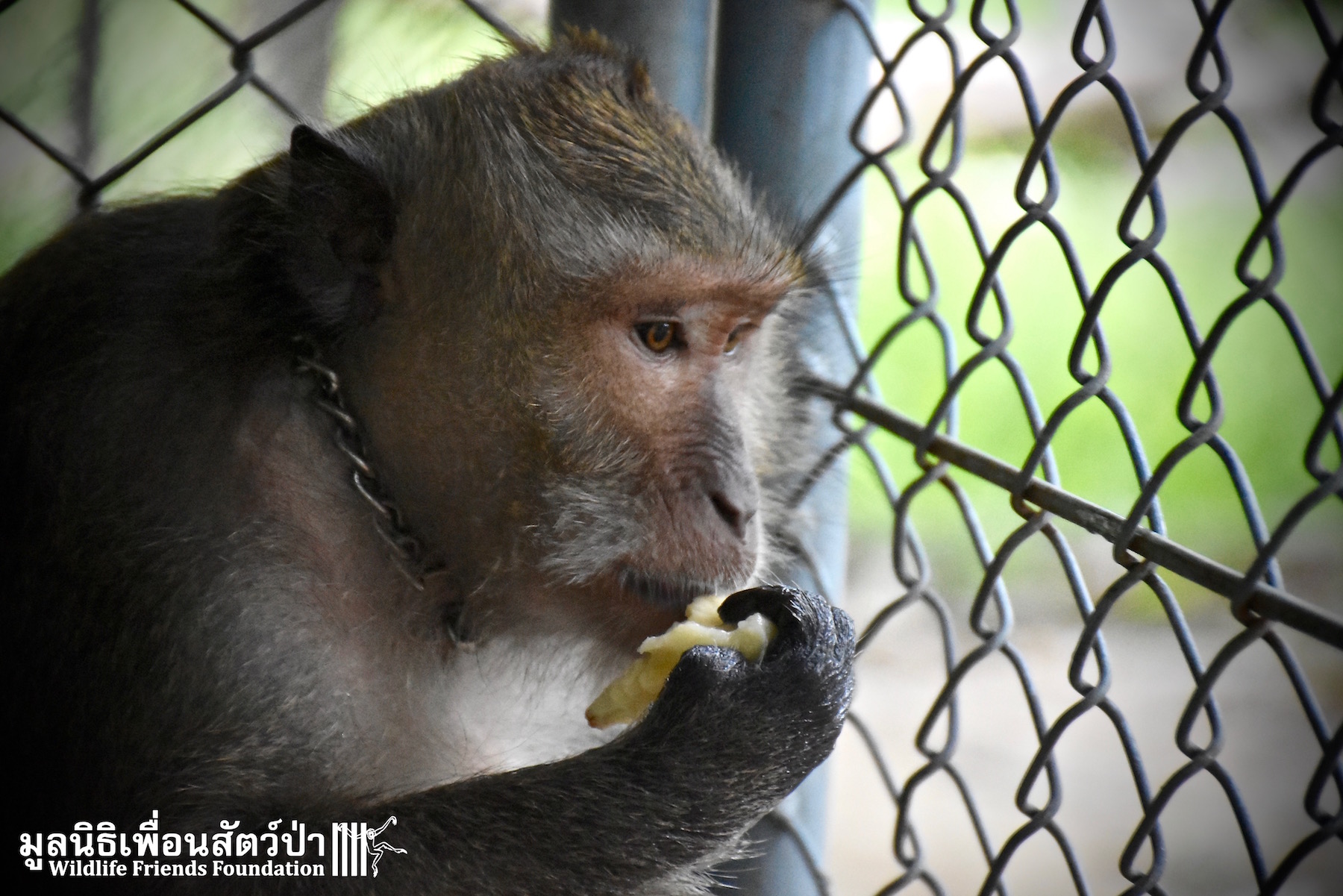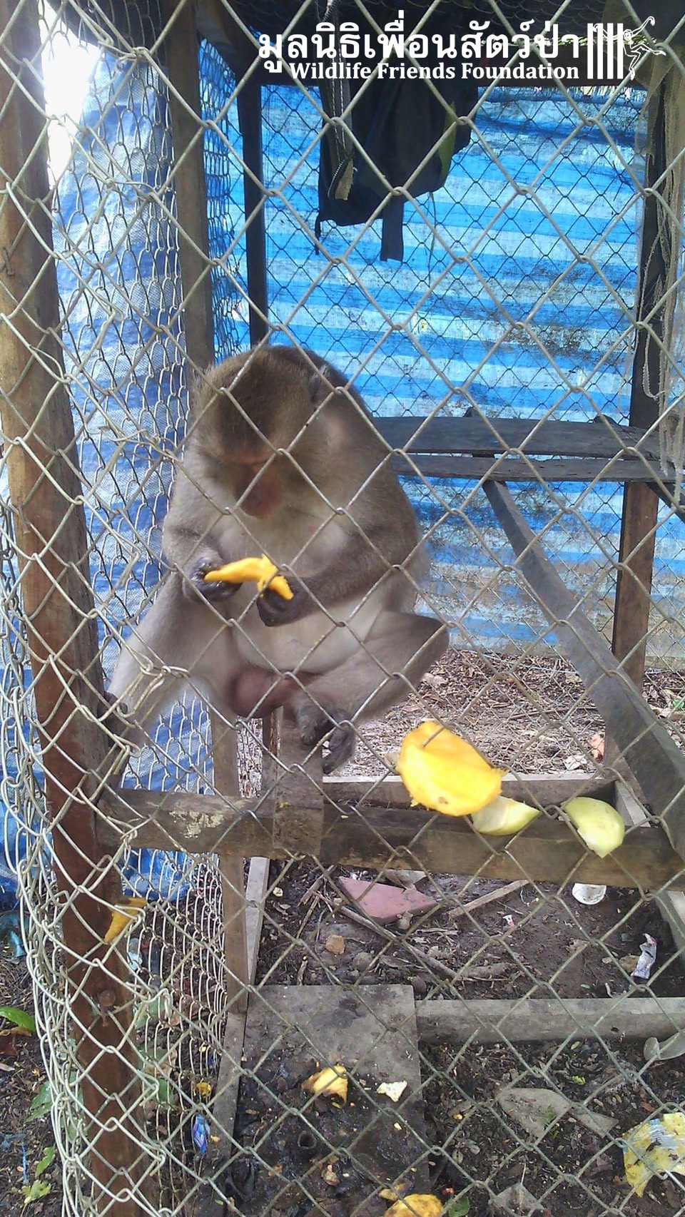 Warnorn the five-year-old male long-tailed macaque (Macaca fascicularis) is free from chains after spending the first five years of his life with humans after his mother was butchered and eaten. Warnorn was found in March 2011 on an island in southern Thailand when he was a young baby. We are told that an alcoholic man killed Warnorn’s mother and ate her. Warnorn was taken into the care of a local family after they found that the man that had killed his mother was keeping him. As Warnorn grew he became aggressive and needed to be kept locked in a cage, this further reduced his quality of life. He recently escaped from his cage, then attacked and injured someone. It is not uncommon for strong frustrated wild animals to retaliate after years in captivity. The people in the village near to where Warnorn was being kept threatened to release into the forest or kill him. His owners than contacted us to help before irresponsible actions were taken.
