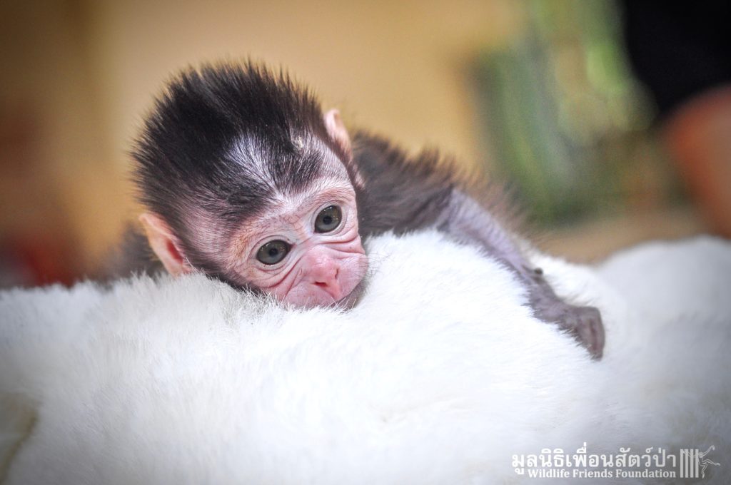 We received a call from person who had recently acquired a very young infant long-tailed macaque (Macaca fascicularis) after her mother had been killed by hunters. The person in question has decided that keeping a wild animal as pet was not a good idea and asked us for help. Let us introduce you too ‘Ma Kood” she is approximately 4 weeks’ old, having witnessed her mother being butchered she was sold on as a pet. She should still be with mother and would be very reliant on her care until she is around 1-year-old.