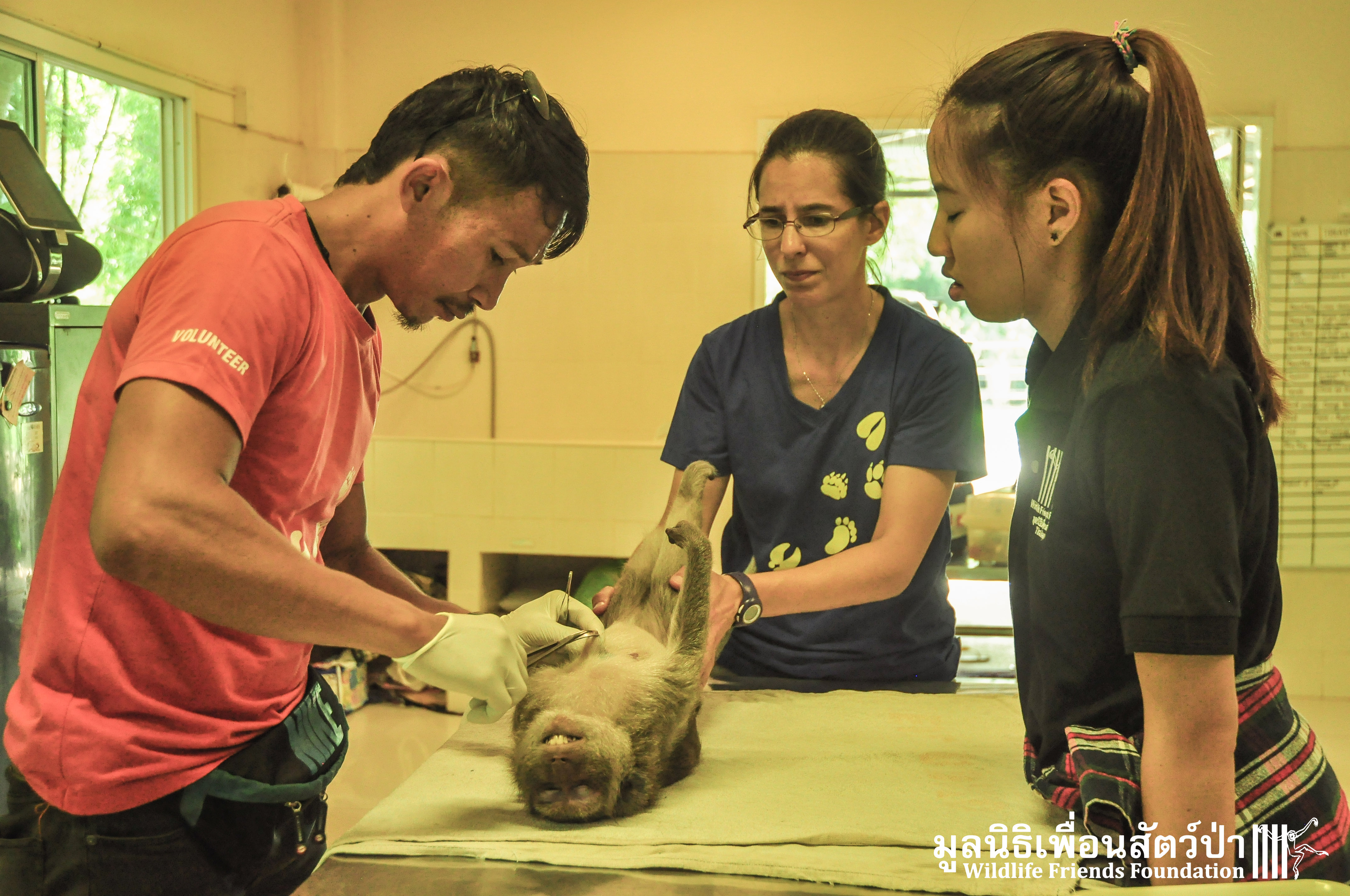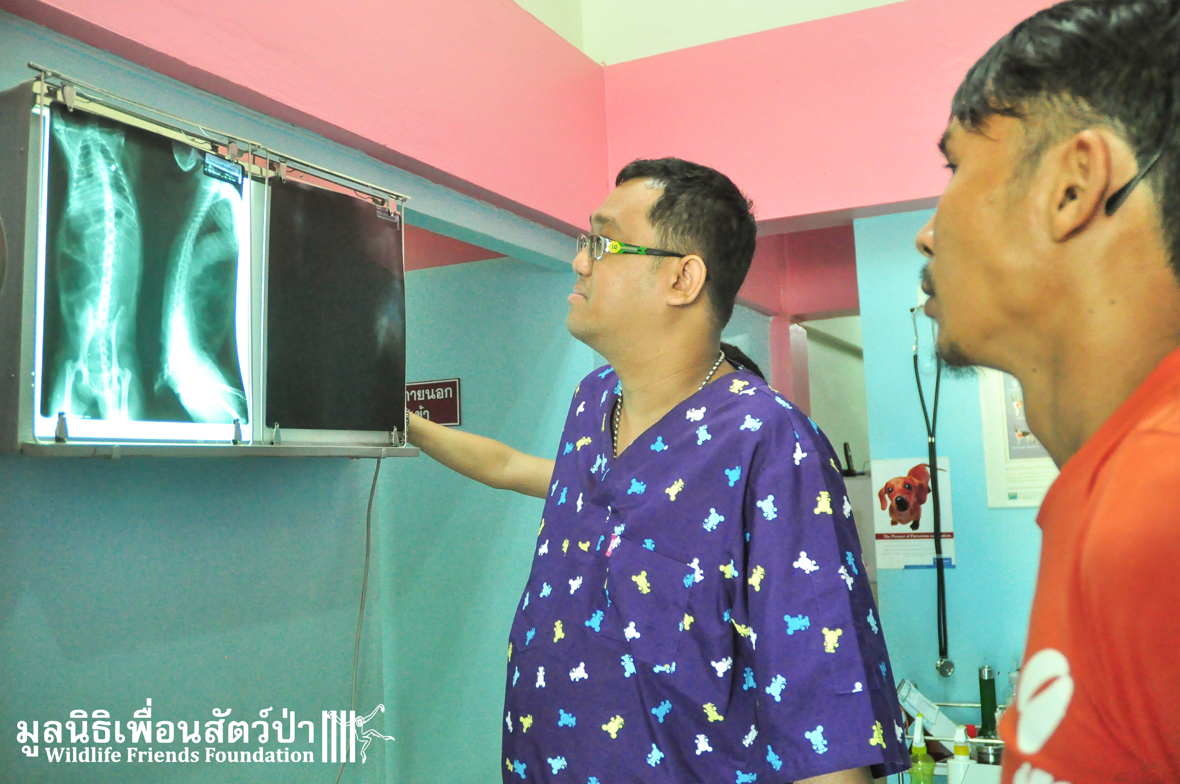 We received a call from the Petchaburi Livestock Department for assistance with an injured long-tailed macaque. A concerned monk had brought the injured macaque to the livestock dept. from Wat Khao Wang in Petchaburi for urgent veterinary treatment. Someone had shot this adult male macaque, the WFFT Rescue Team rushed to the aid of this macaque. Sadly he passed away before reaching the WFFT Wildlife Rescue Centre. We found numerous bullets in his body; it appears that he died from infections due to the bullet wounds. The concerned monks collected the macaque to take him back to the temple, to perform a ceremony and burry him. Human-wildlife conflict is increasing at an alarming rate here in Thailand, particularly with urban macaque populations.