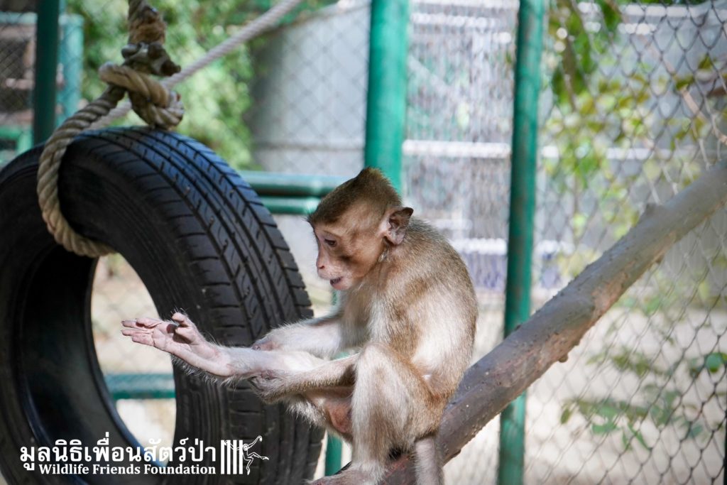 John was bought by a Russian living in Thailand two years ago as a pet. They now could not deal with him as a pet as he tended to bite when handled and was destructive and messy. No fault of John. As a young macaque he has a lot of energy to burn off and is a wild animal not a cuddly living doll to be mollycoddled.