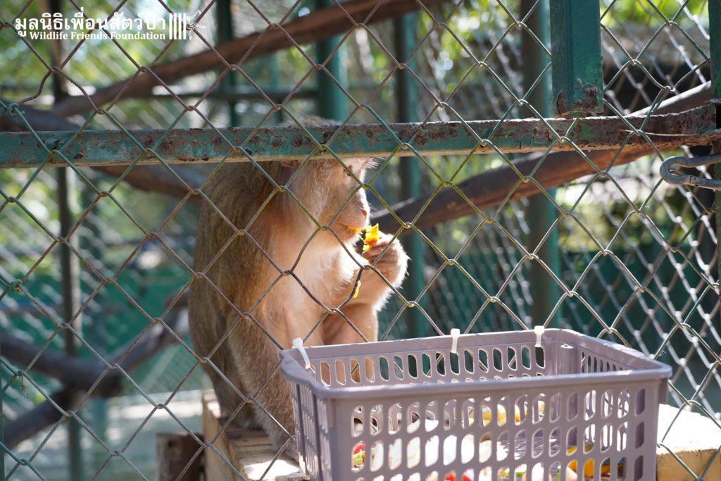 As they can inflict severe injury and major damage to property they were captured and placed in a cage at the temple. However as they were not a natural pair the smaller female was constantly being intimidated by the presence of the male and this caused her severe stress. The small cage offered no enrichment for the two and was somewhat dilapidated and dangerous. It also could not be cleaned so was becoming more of a heath risk the longer they spent there.
