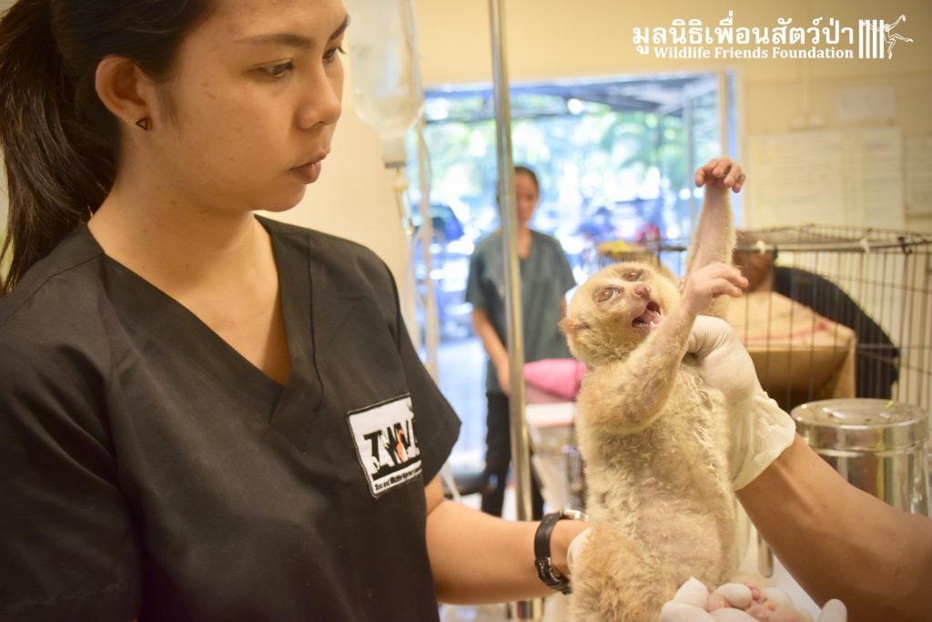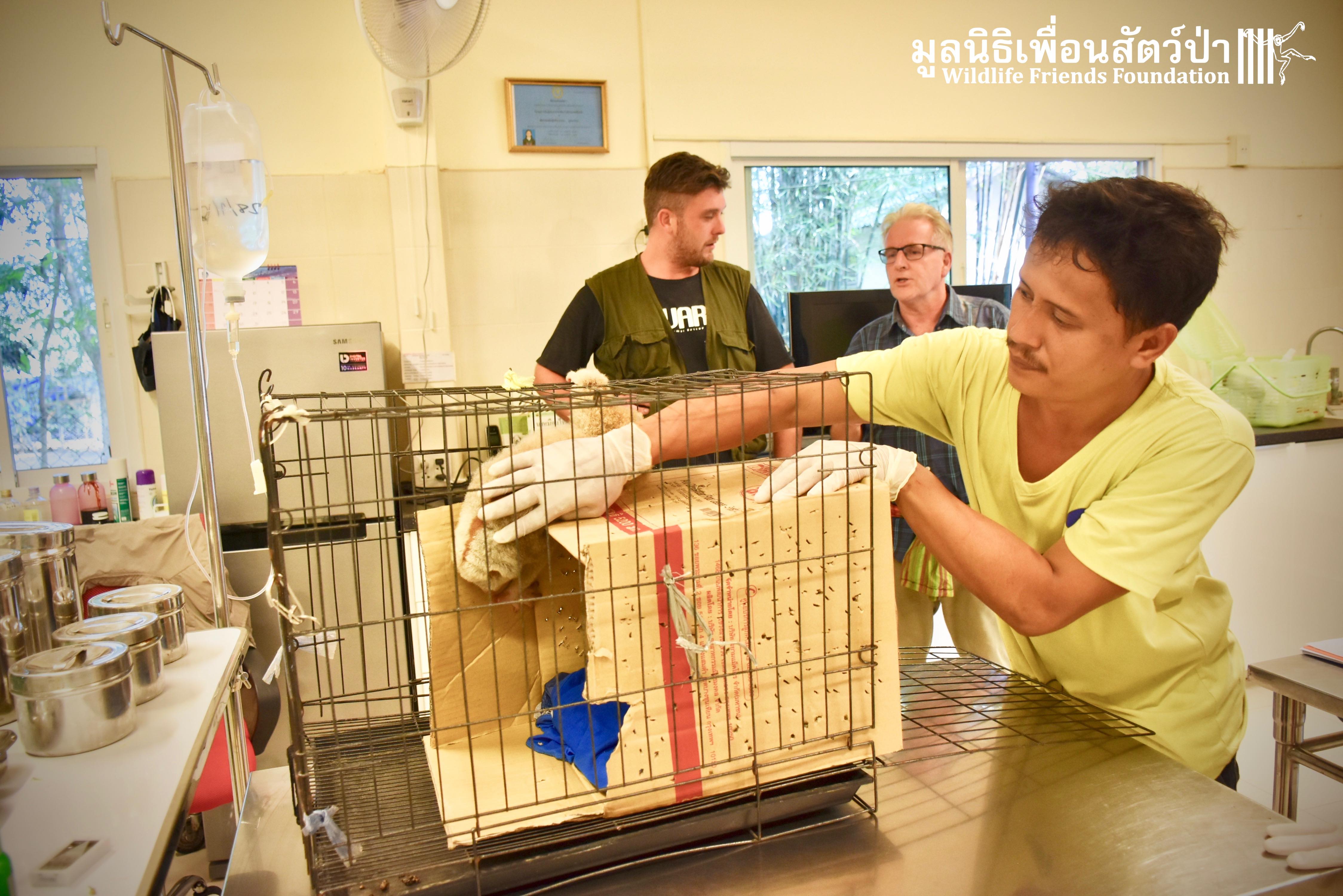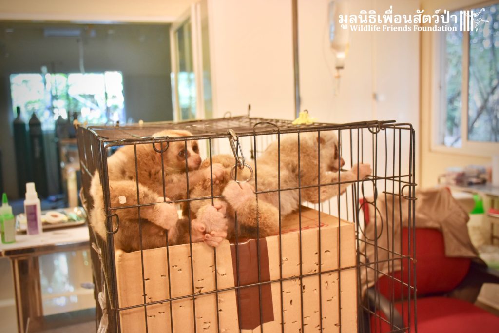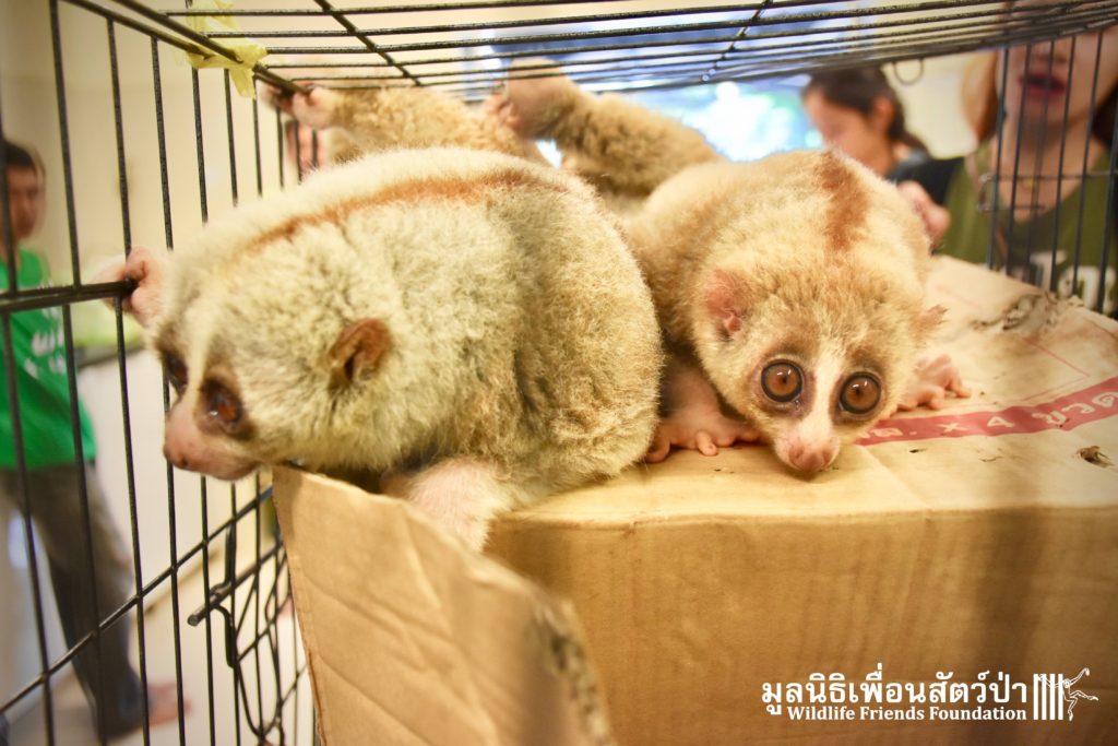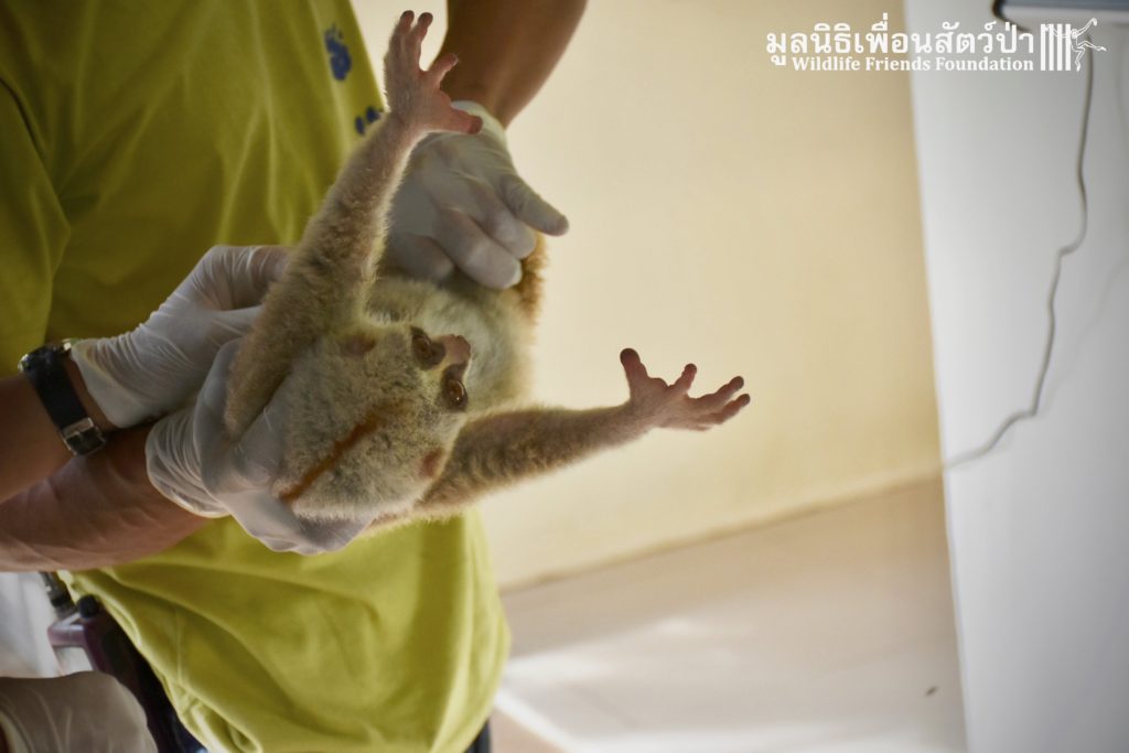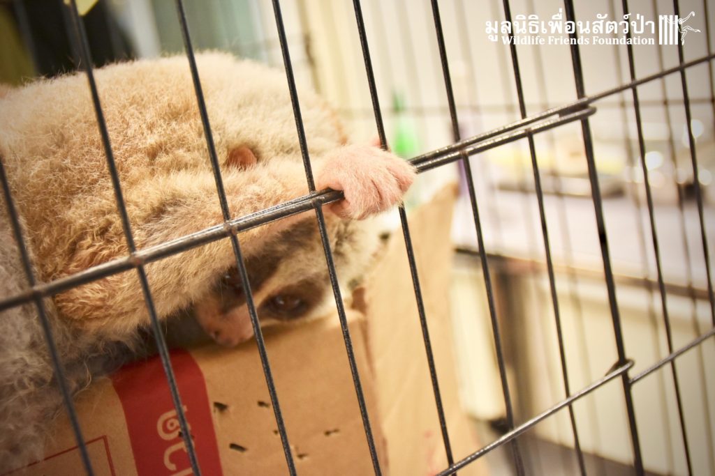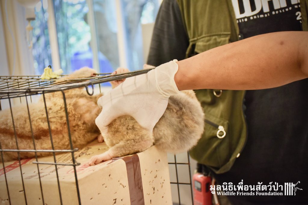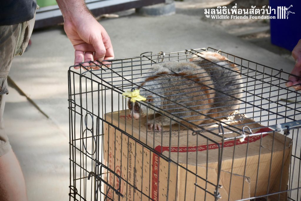 A few days ago 2 new residents, Ling-Ling & La La arrived at the WFFT Wildlife Rescue Centre. These rather large Bengal slow lorises (Nycticebus bengalensis) were previously kept as pets. The first owners were Russian ex-pats who had illegally purchased them. They initially had a male and female (Ling-Ling), who had a baby (La La), one day while being let out in their garden the male loris disappeared. One year ago the owners left the country to go back home and needed to find a solution for the loris. Ling-Ling and La La were then handed over to some friends of friends who then cared for them until contacted WFFT for help.