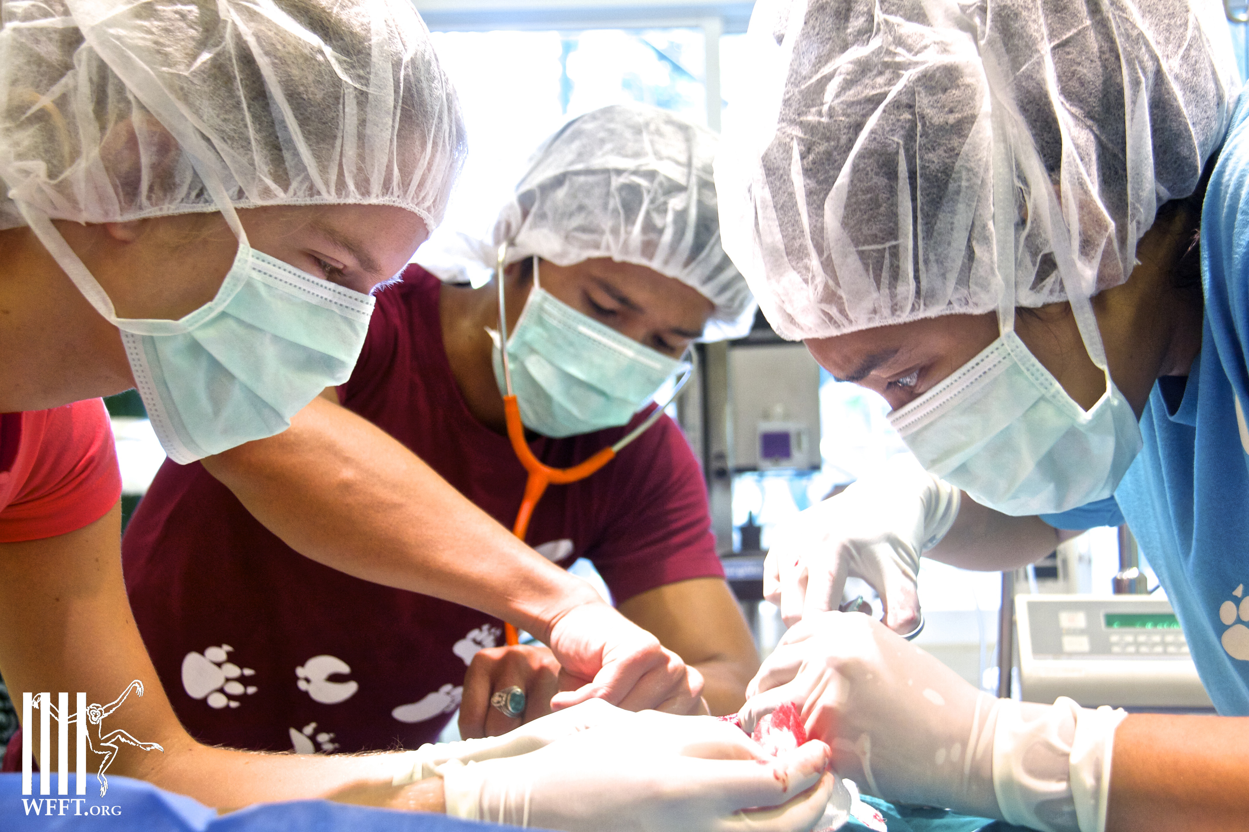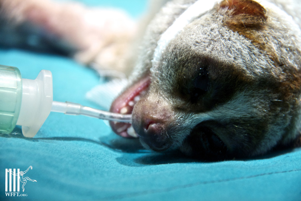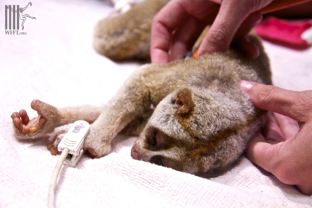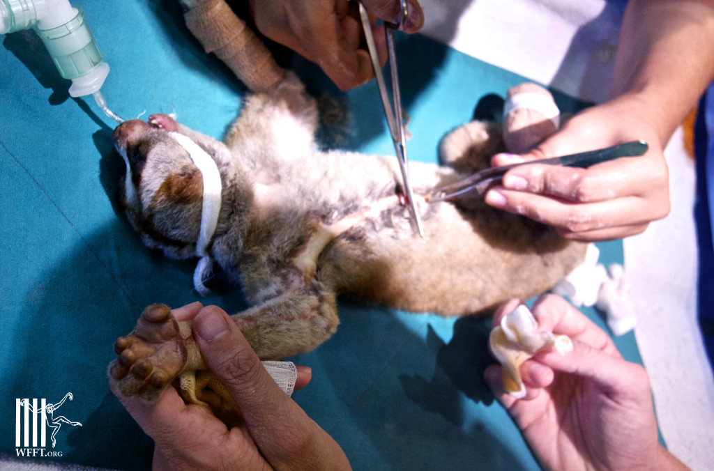 Two days ago we again received another loris with serious injuries, with half a leg missing and bones sticking out. Our veterinary team however was sure they could save the live of this little loris and therefor put it on anti-biotics for two days before starting surgery to remove the leg and treat other open wounds. This surgery today went well and it was already the 47th loris this year that was brought in.