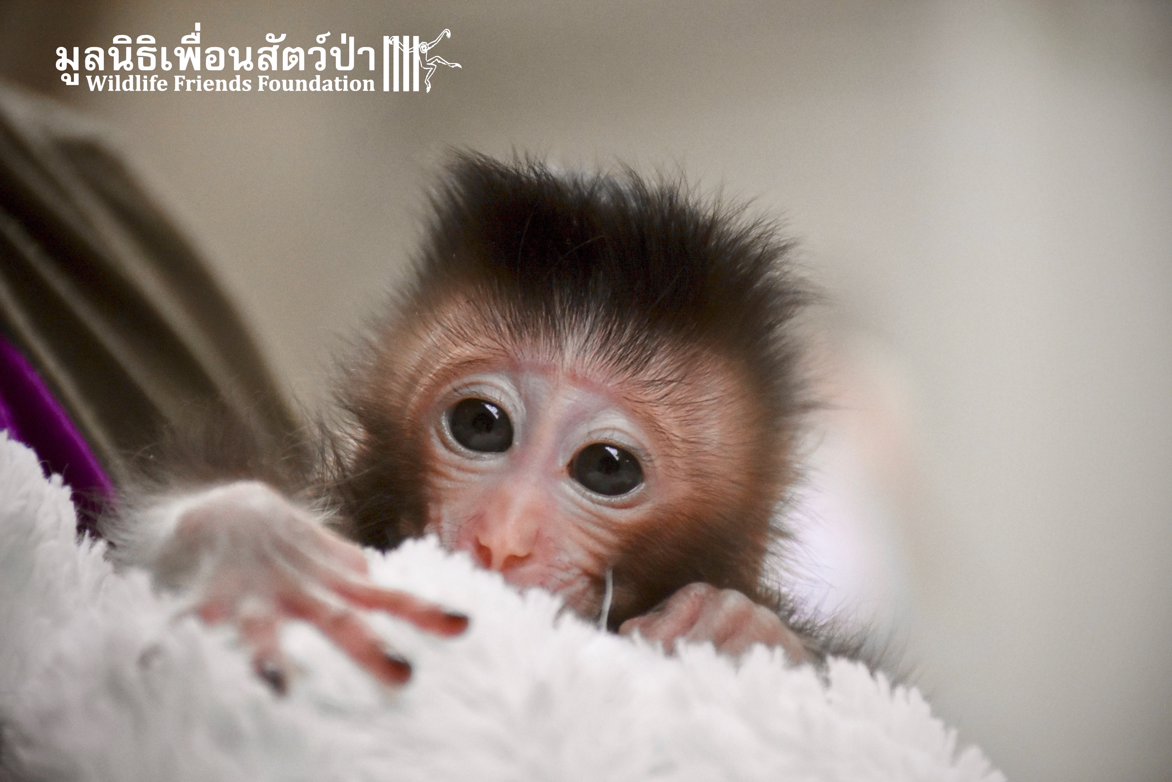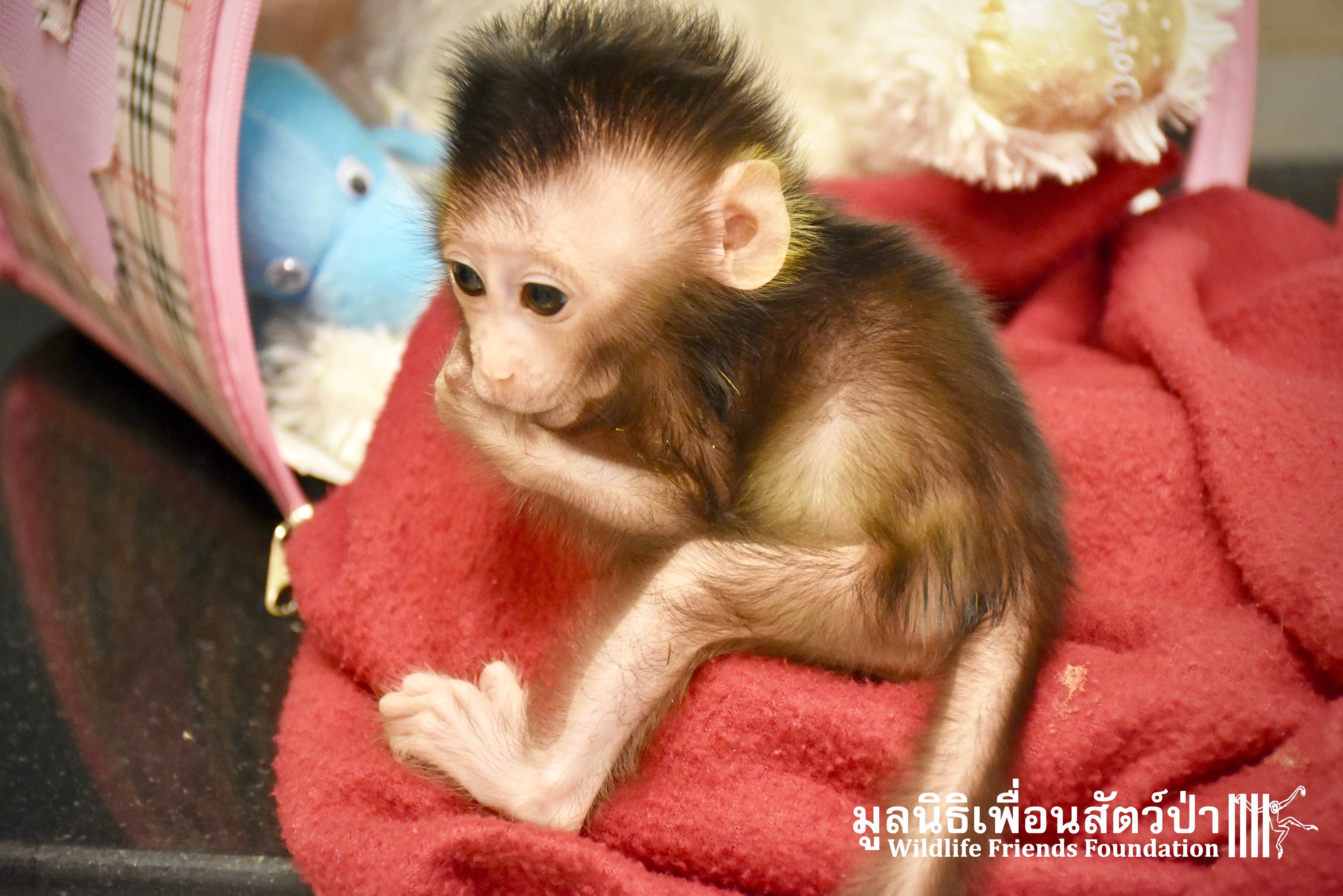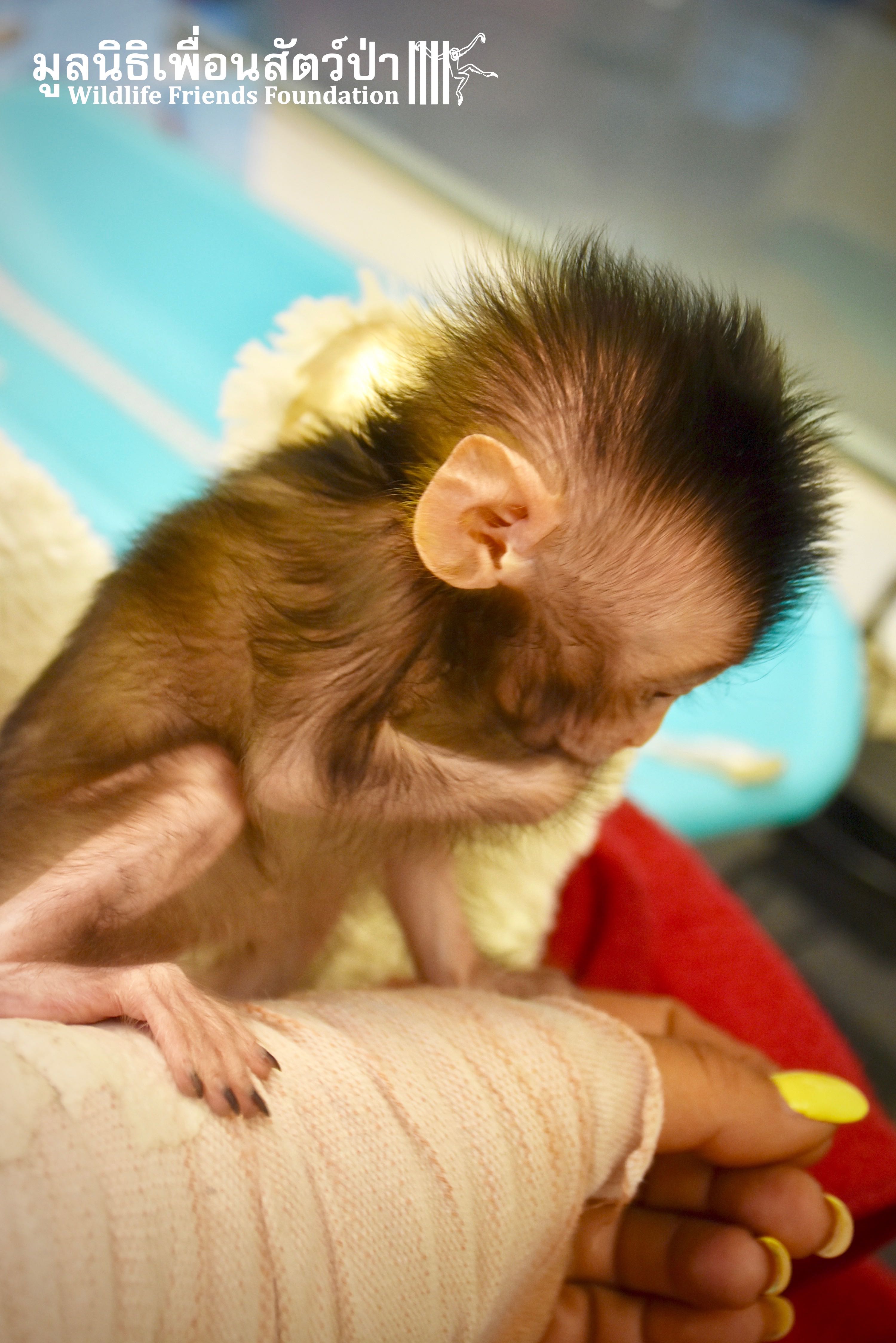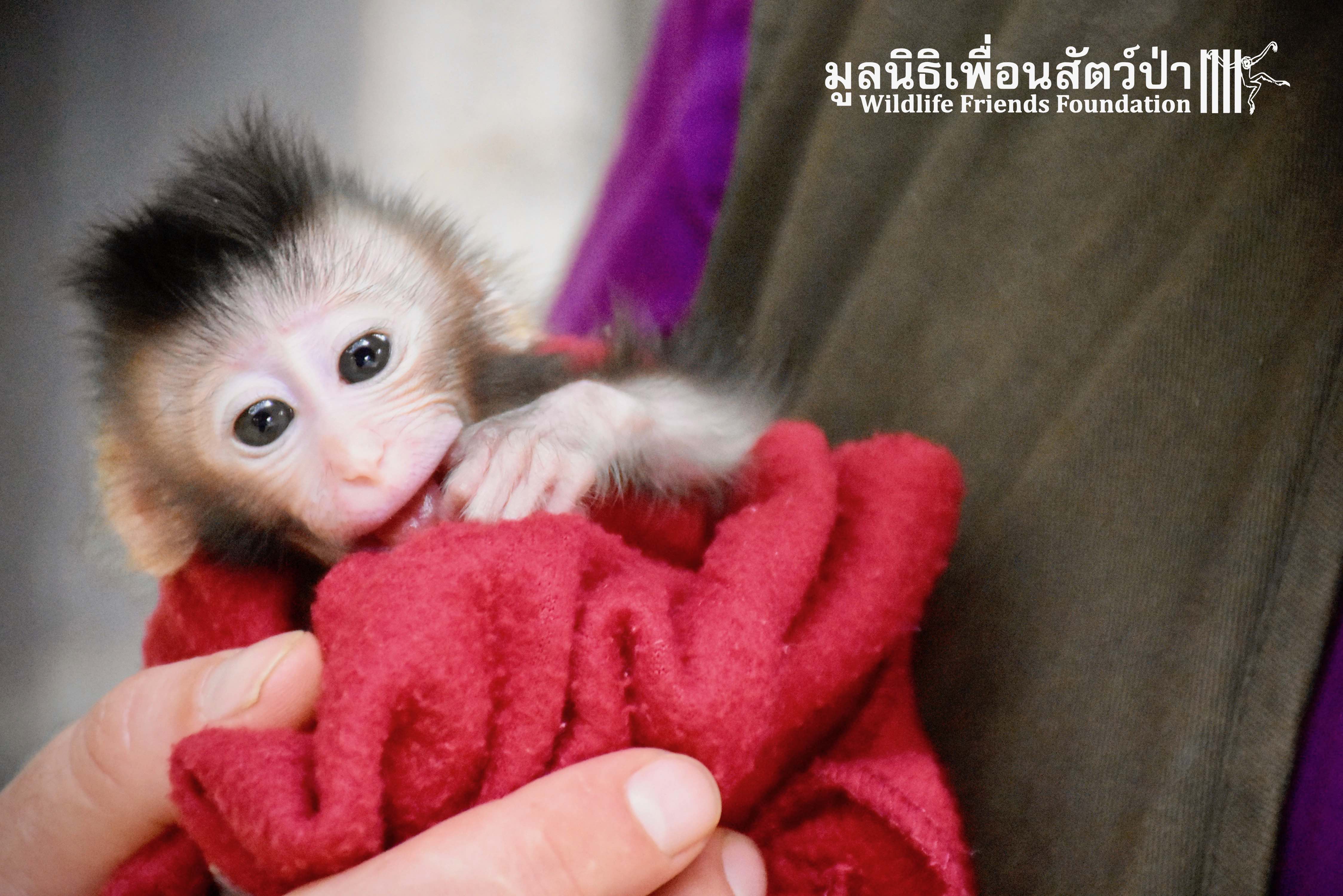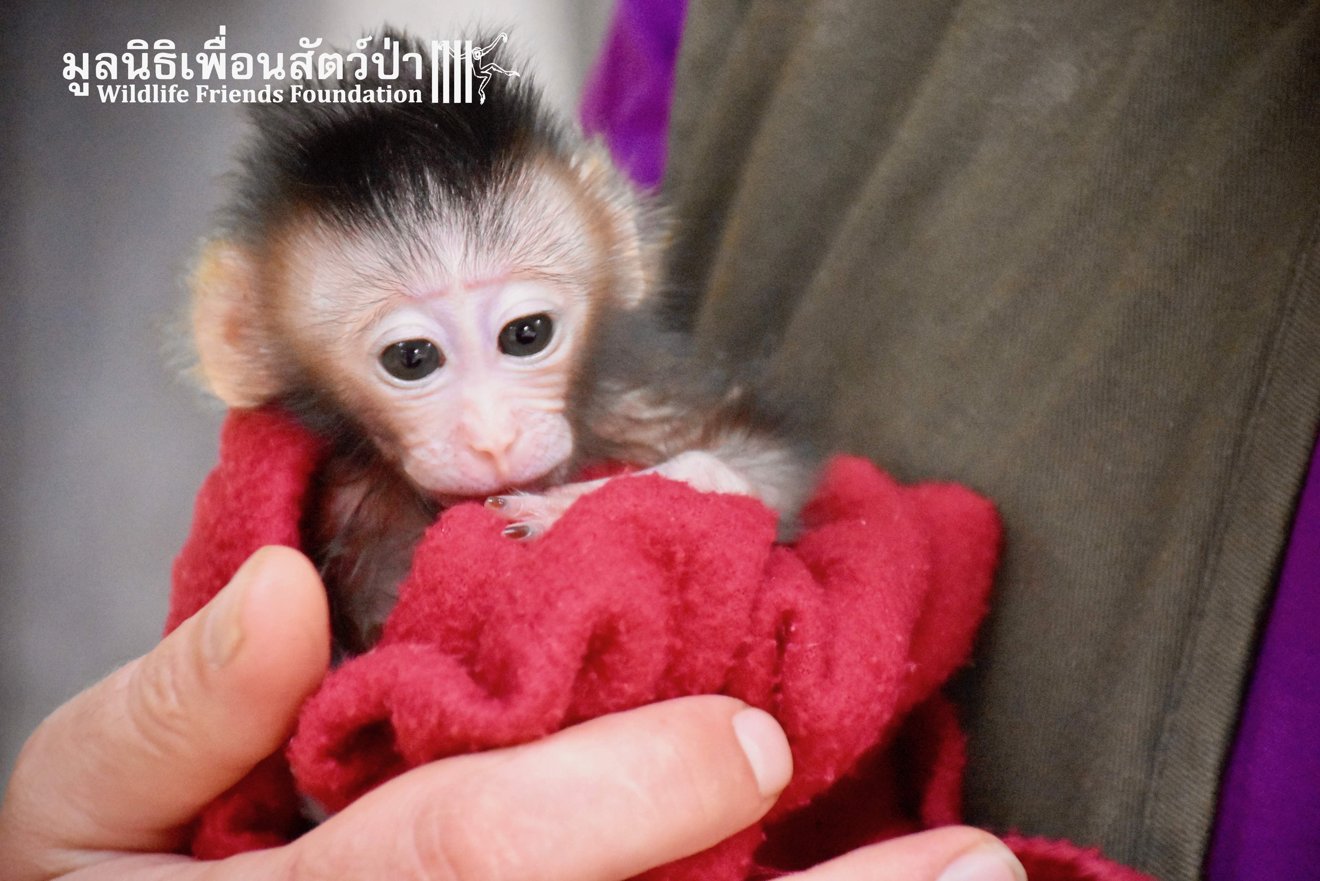 What we can say is… Meet “Pearl”. A sad baby girl, bought on a night market in Pattaya for 9000 Baht. Her owner kept her only 10 days, feeding her with some mashed banana mixture (Pearl would still have been breastfeeding in a normal life), before she decided to have the WFFT Rescue Team come to collect her. But we are happy to announce to you that, now, we are going to offer this sweet and hurt soul a chance for a better life. A chance to have a monkey life. A chance to be correctly loved, with proper care & attention, to meet others like her, and to have, later, when she will be a little older and autonomous, a life with her own species.