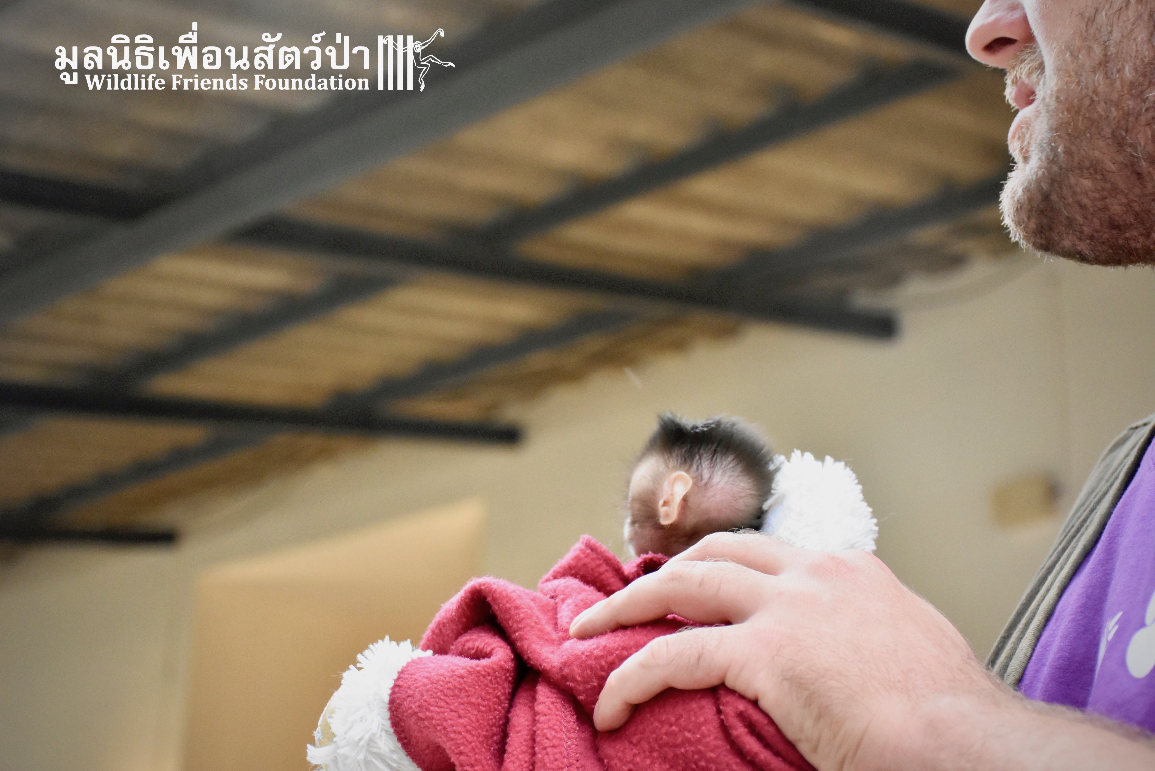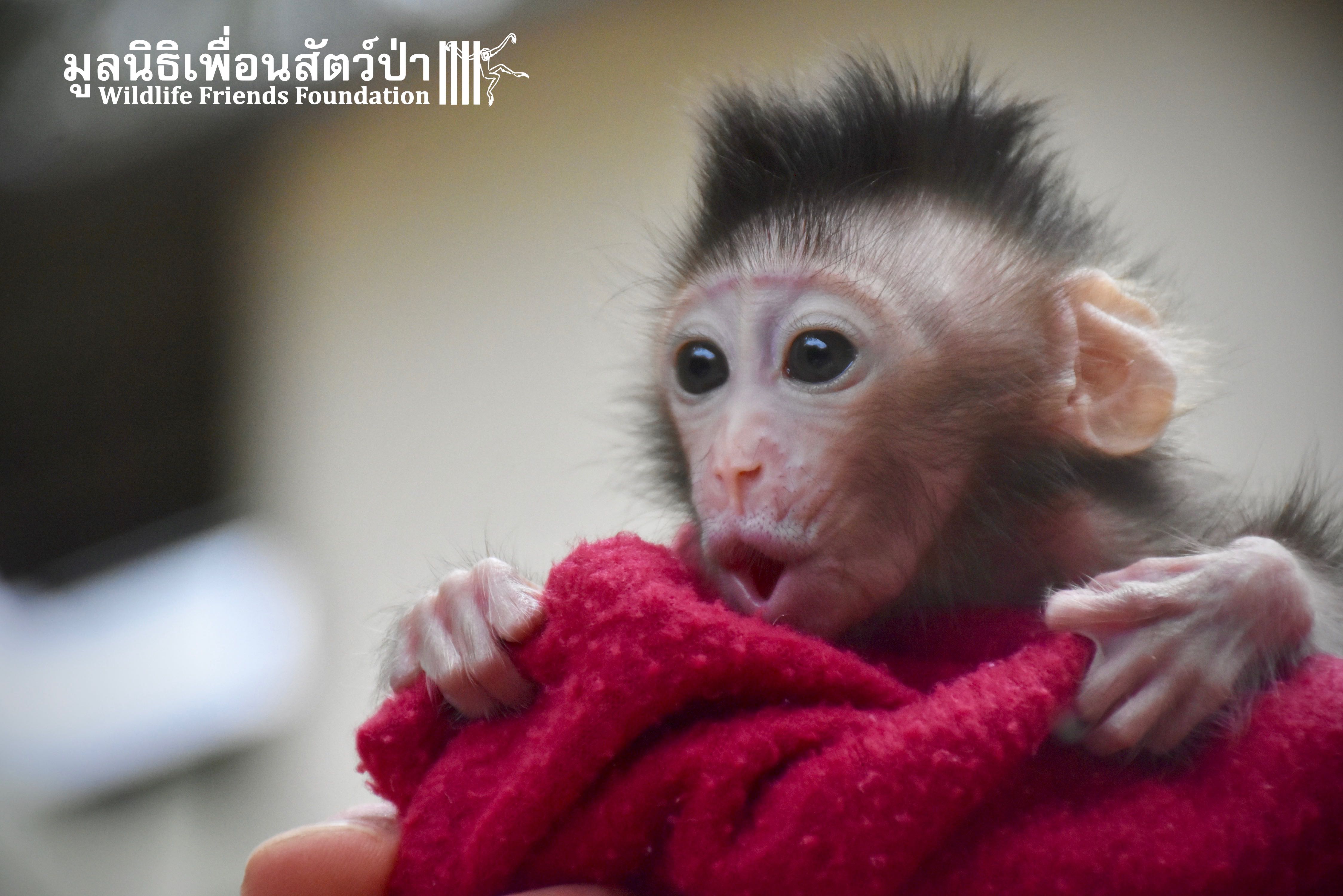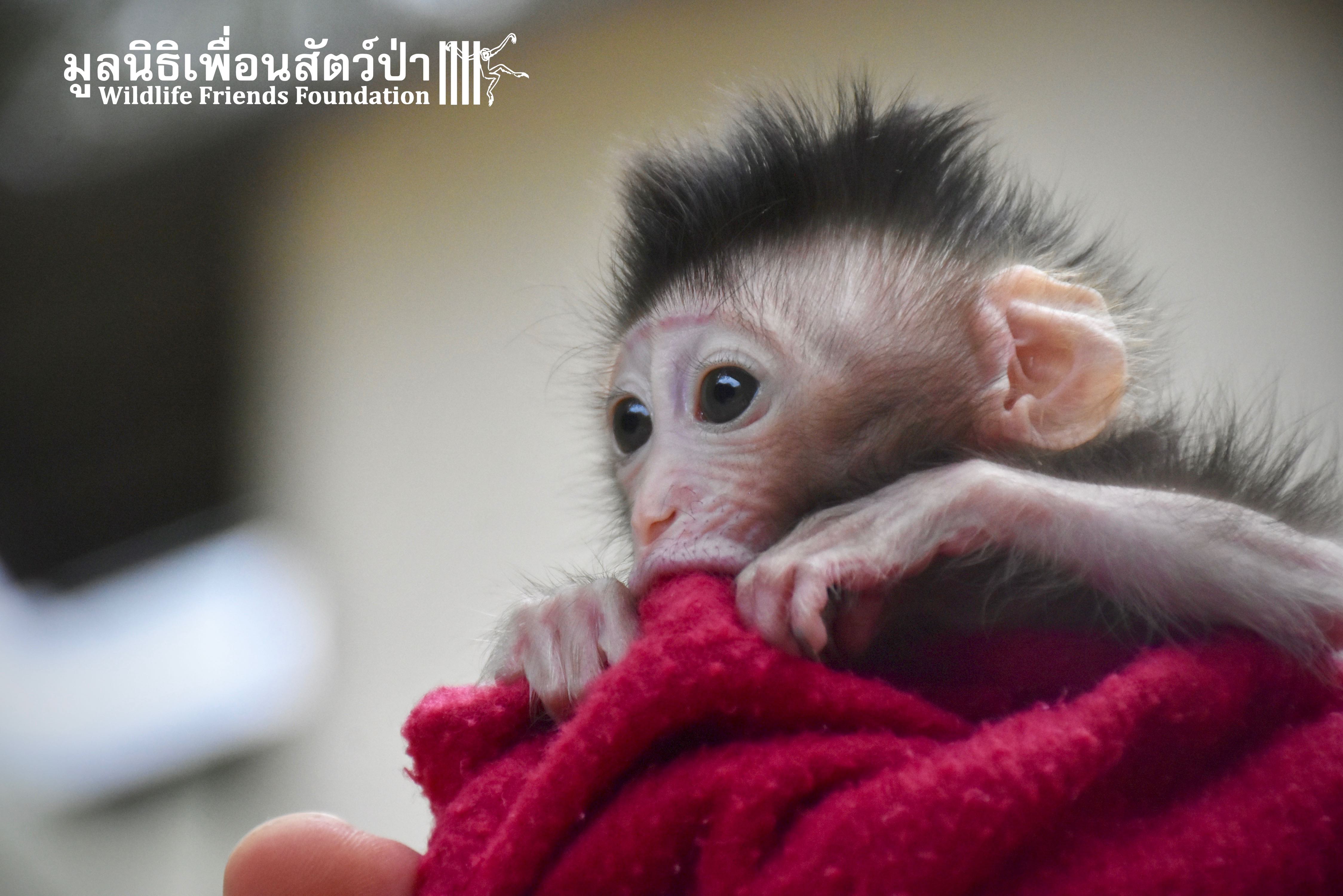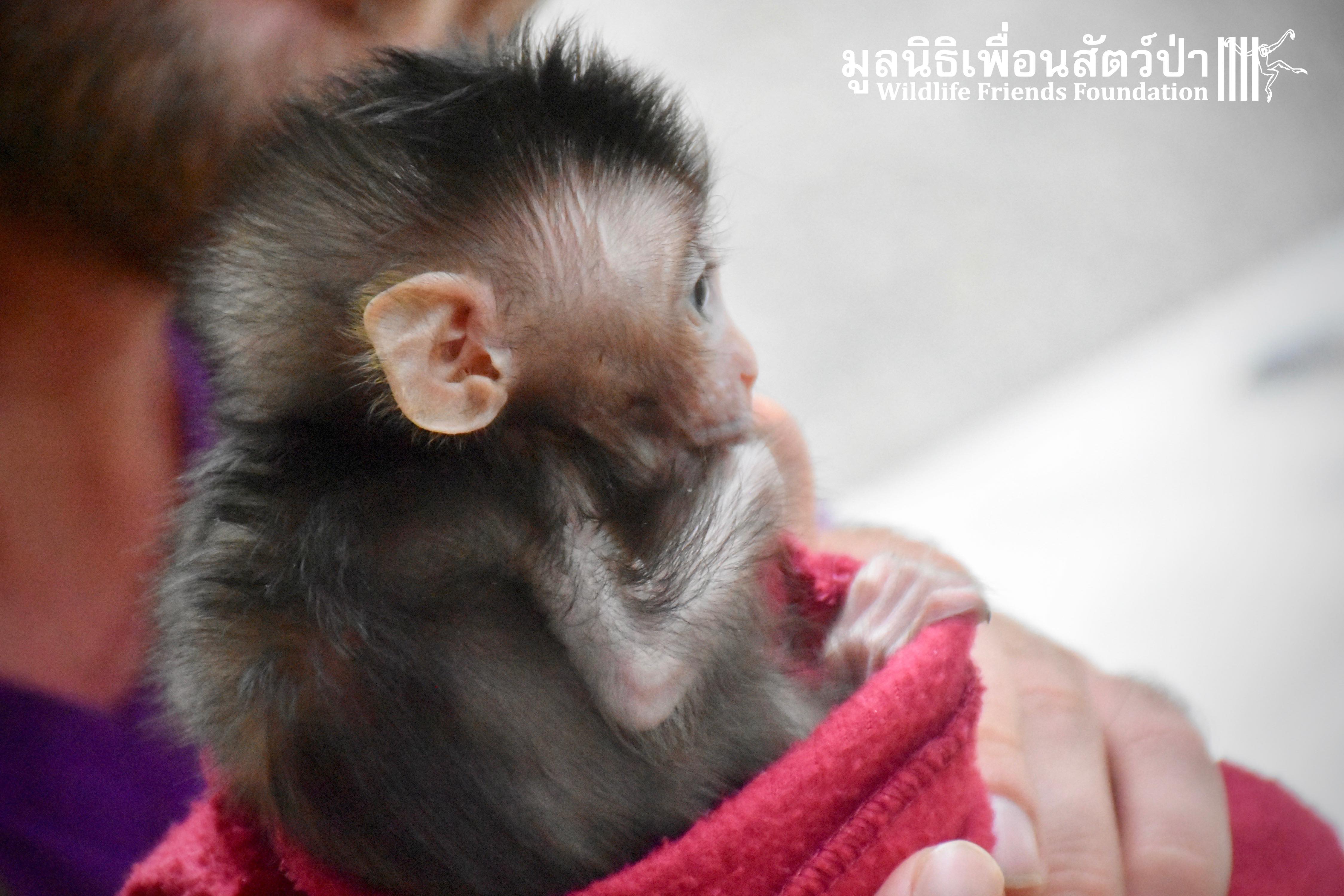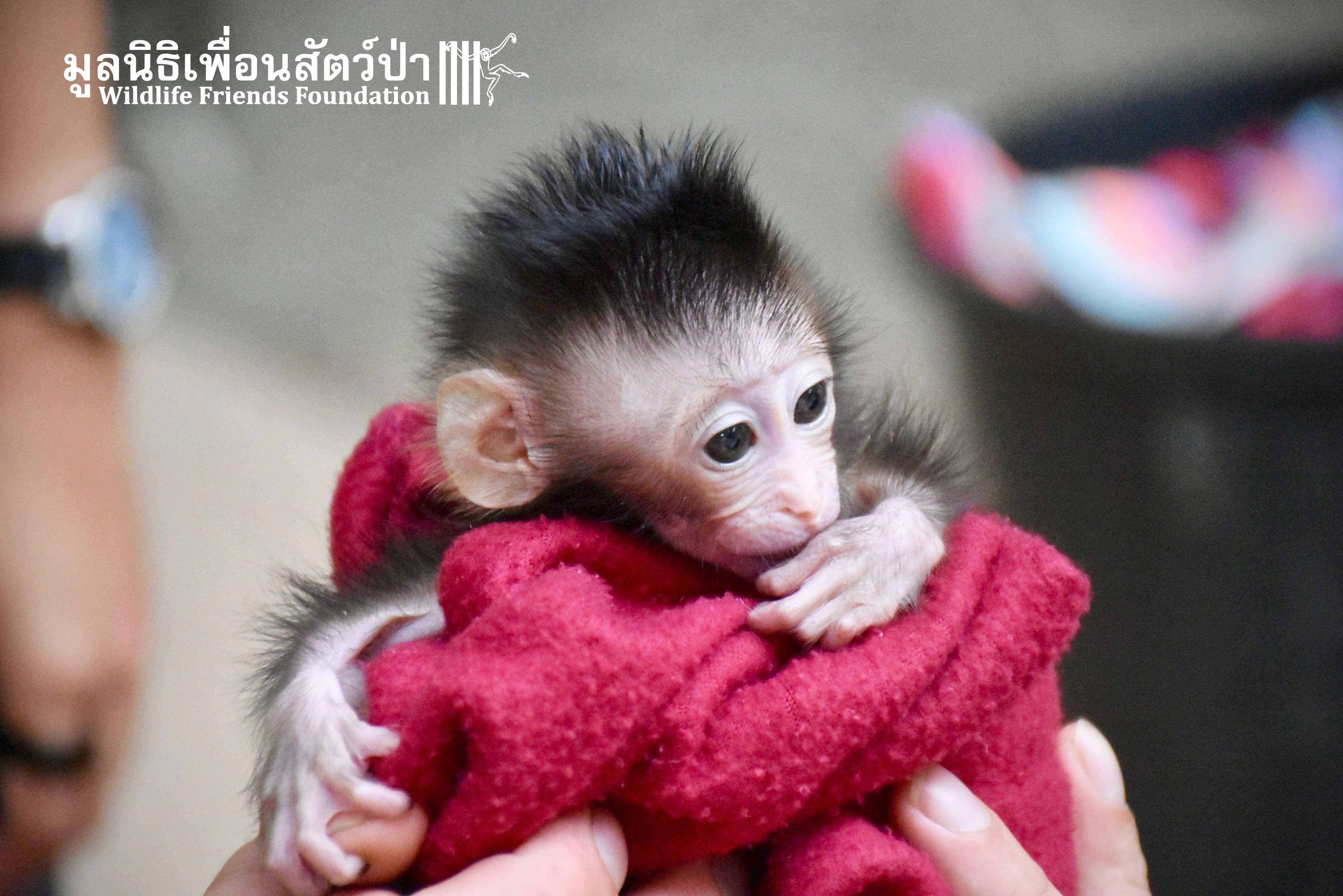 What we can say is… Meet “Pearl”. A sad baby girl, bought on a night market in Pattaya for 9000 Baht. Her owner kept her only 10 days, feeding her with some mashed banana mixture (Pearl would still have been breastfeeding in a normal life), before she decided to have the WFFT Rescue Team come to collect her. But we are happy to announce to you that, now, we are going to offer this sweet and hurt soul a chance for a better life. A chance to have a monkey life. A chance to be correctly loved, with proper care & attention, to meet others like her, and to have, later, when she will be a little older and autonomous, a life with her own species.
