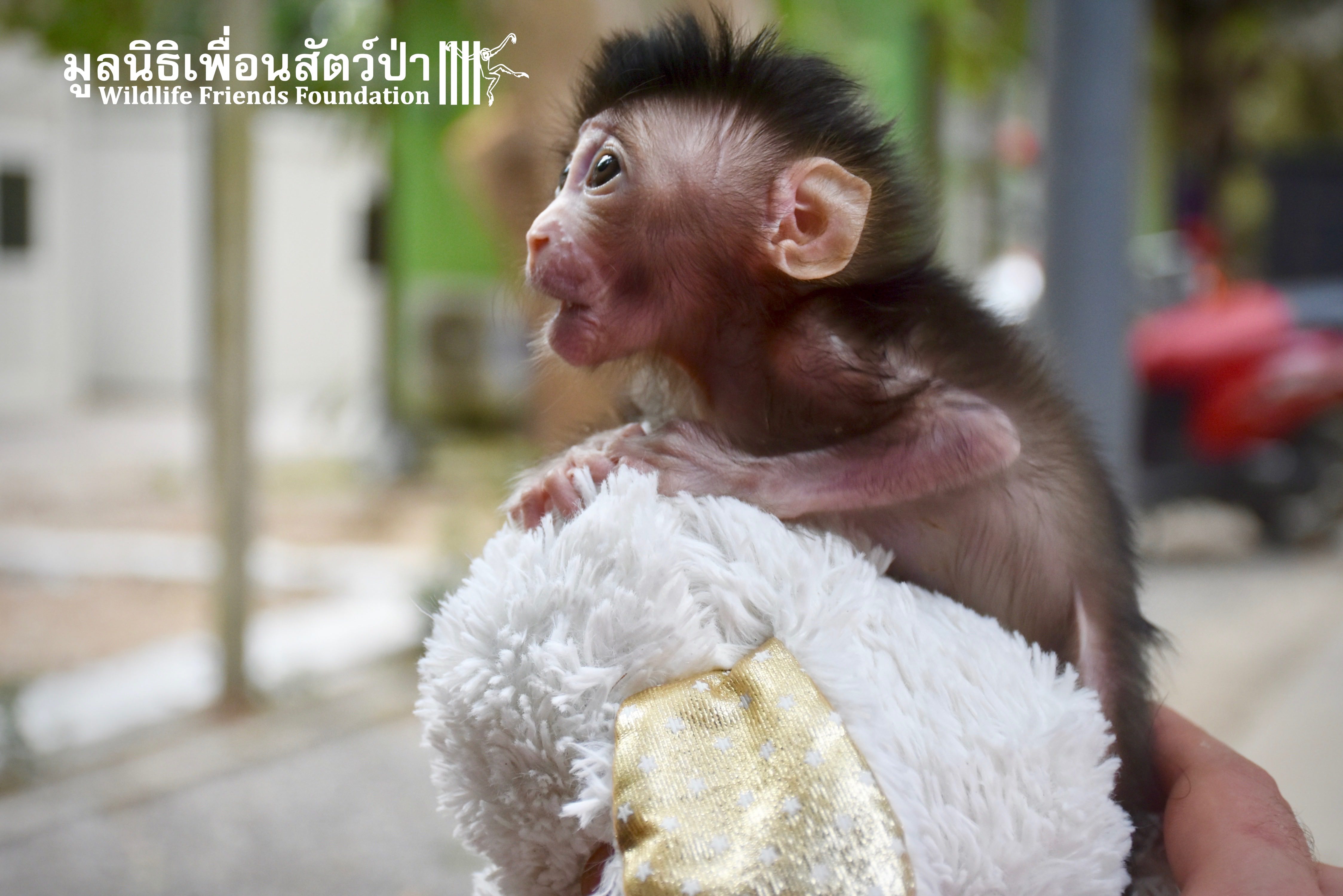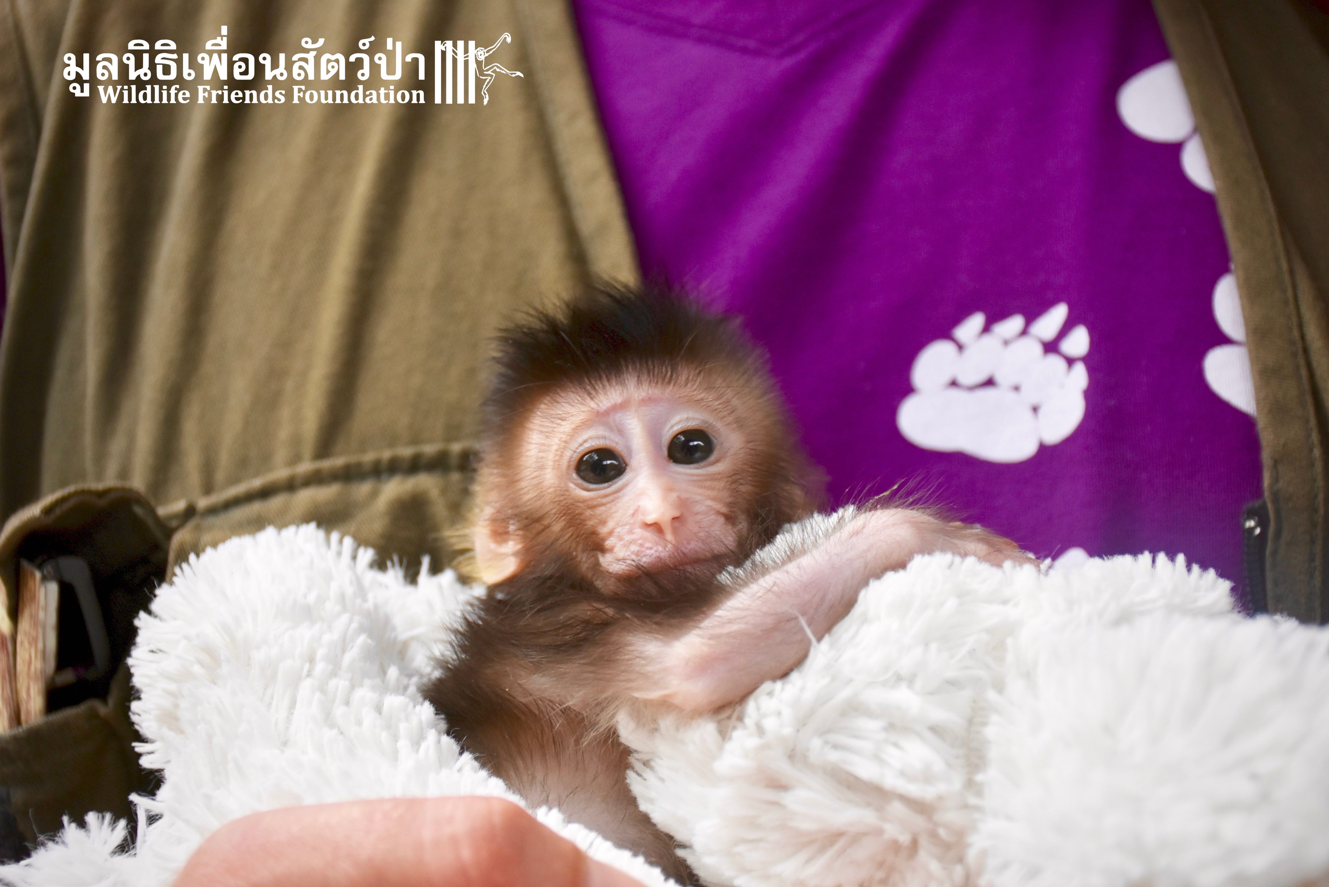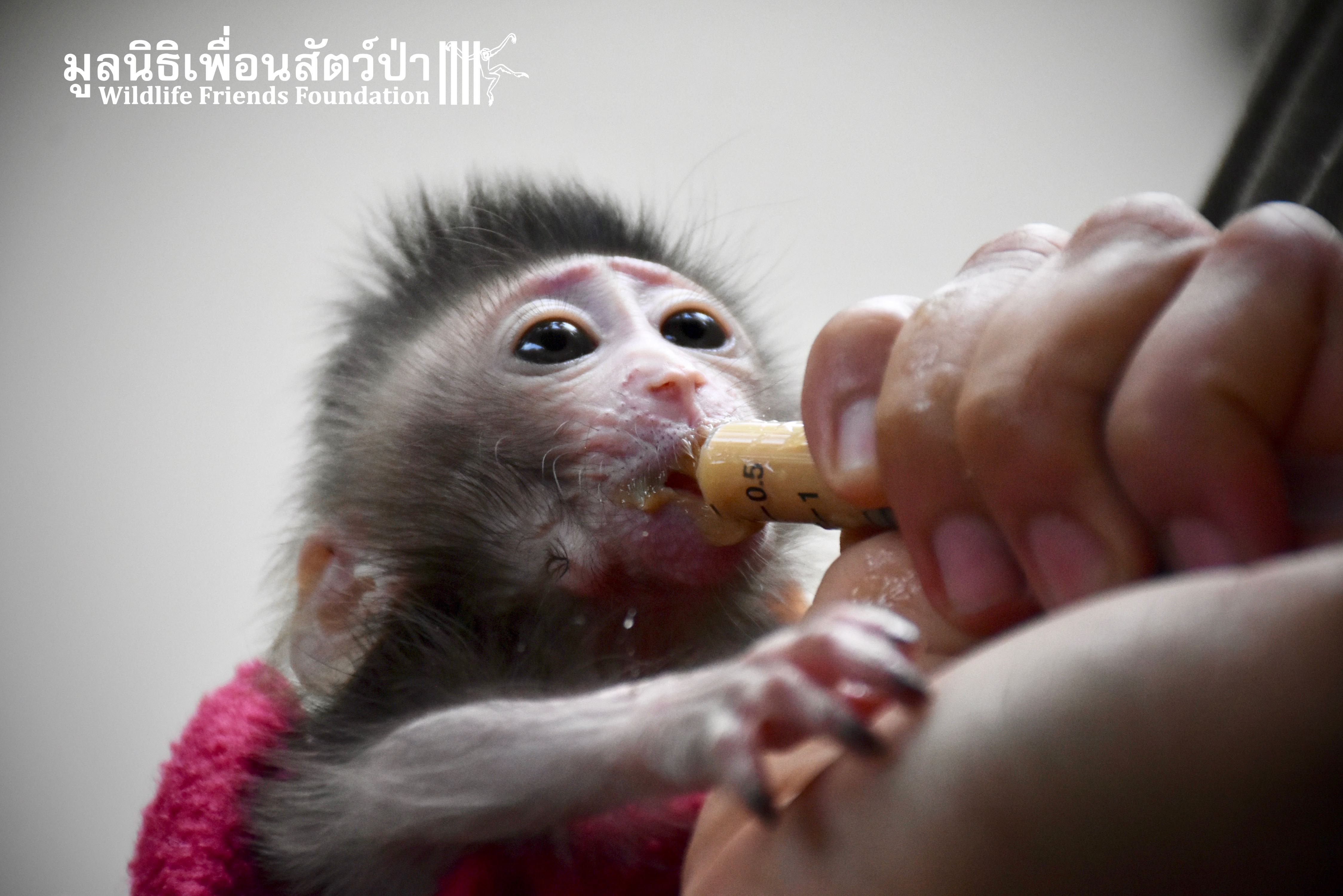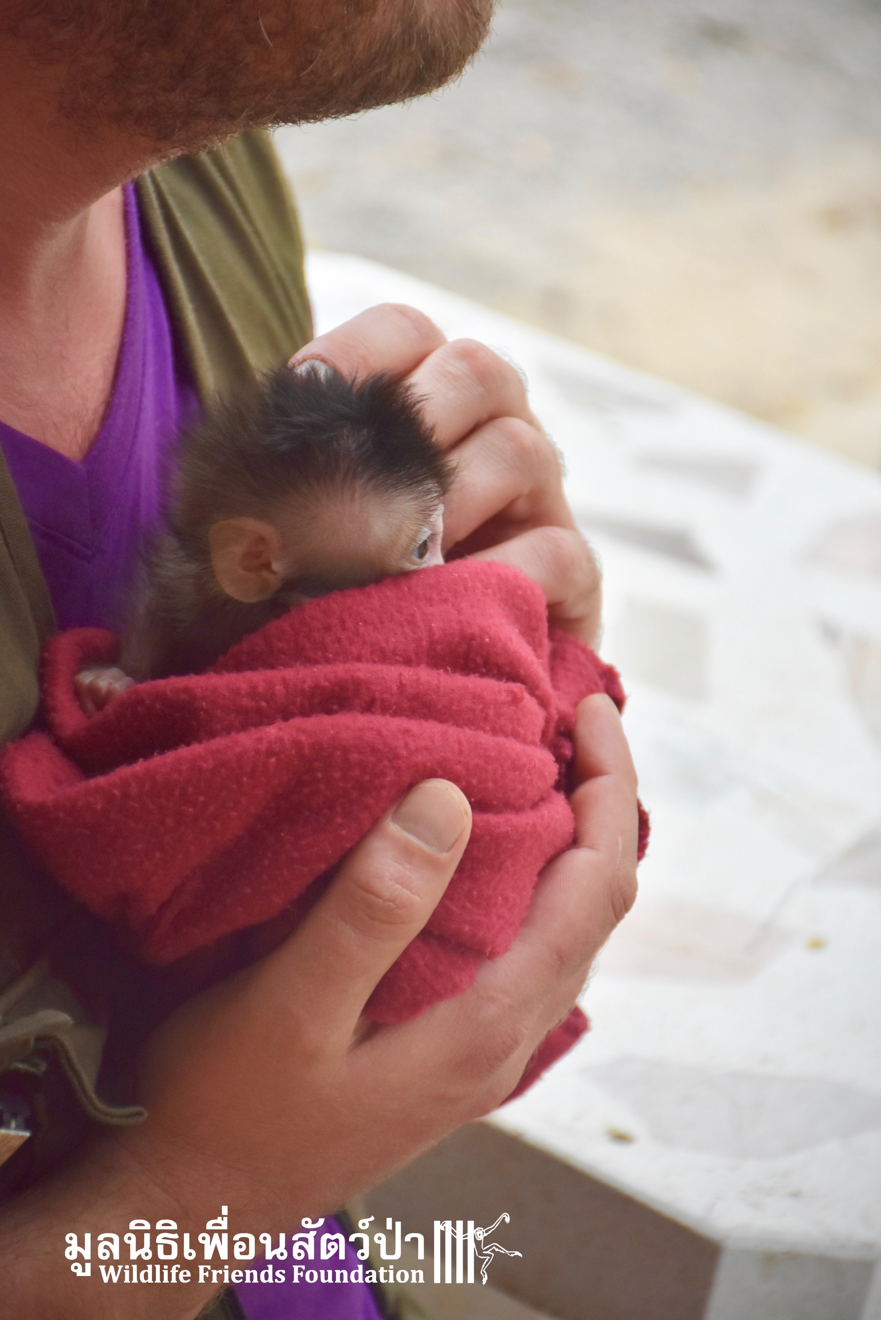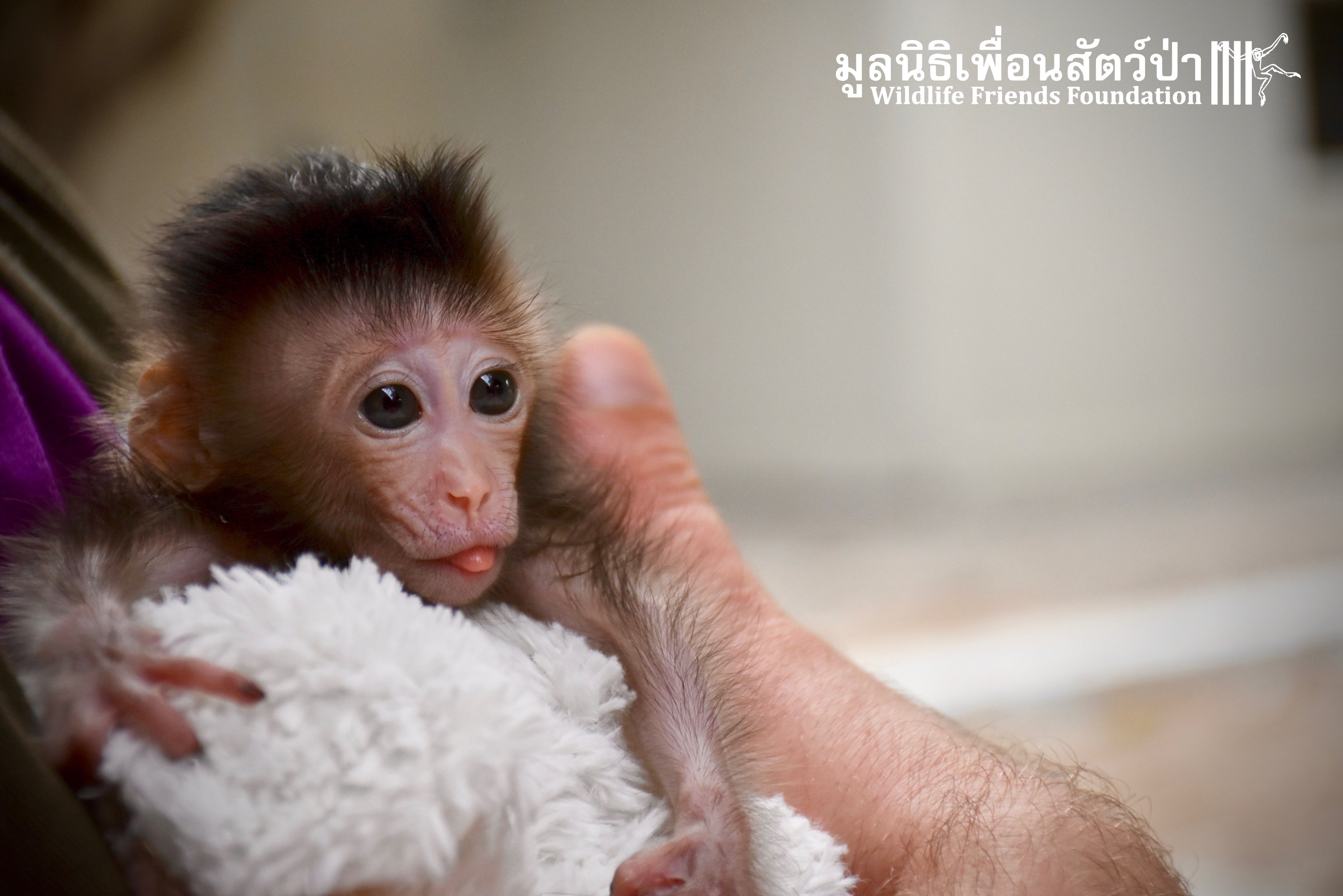 What we can say is… Meet “Pearl”. A sad baby girl, bought on a night market in Pattaya for 9000 Baht. Her owner kept her only 10 days, feeding her with some mashed banana mixture (Pearl would still have been breastfeeding in a normal life), before she decided to have the WFFT Rescue Team come to collect her. But we are happy to announce to you that, now, we are going to offer this sweet and hurt soul a chance for a better life. A chance to have a monkey life. A chance to be correctly loved, with proper care & attention, to meet others like her, and to have, later, when she will be a little older and autonomous, a life with her own species.