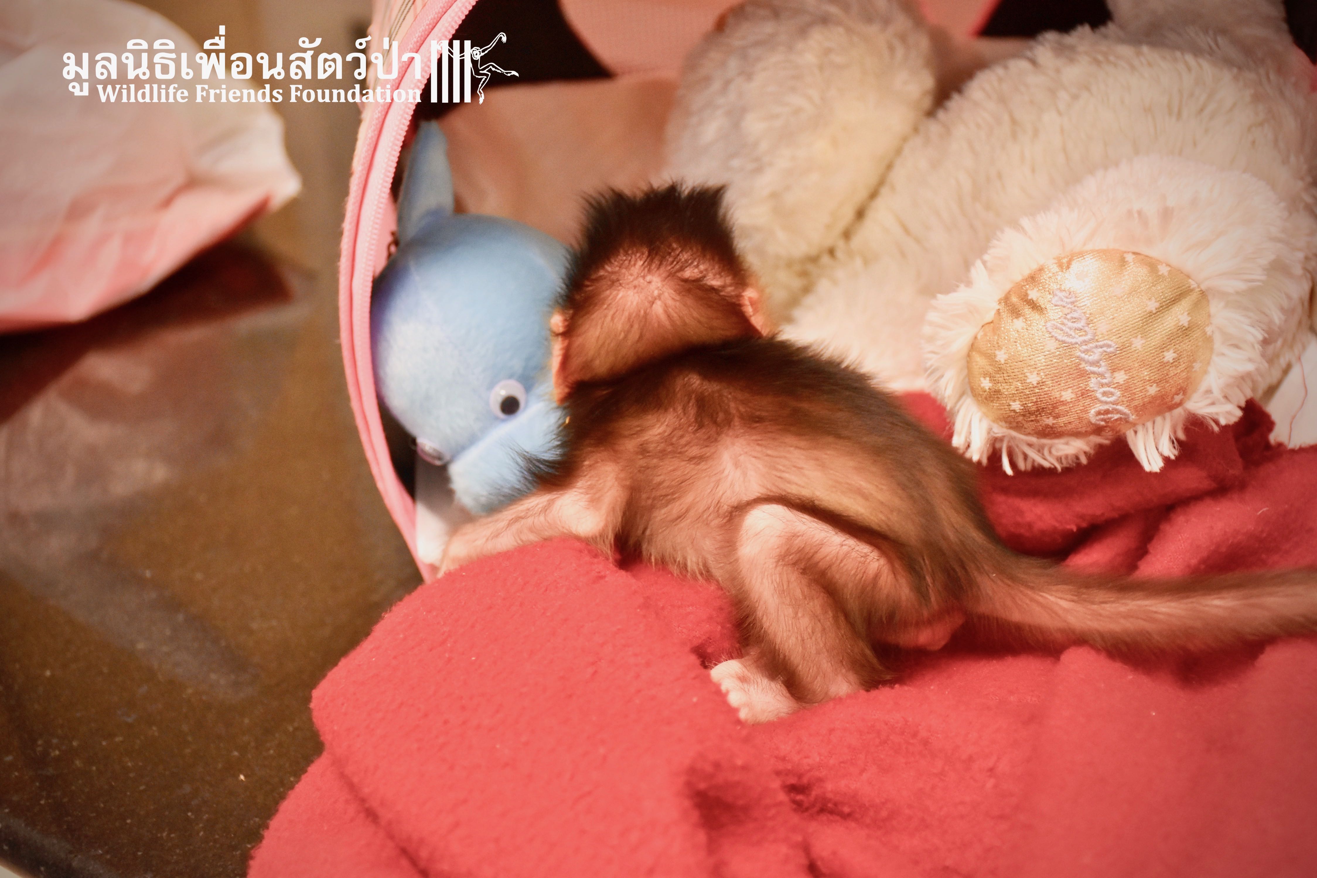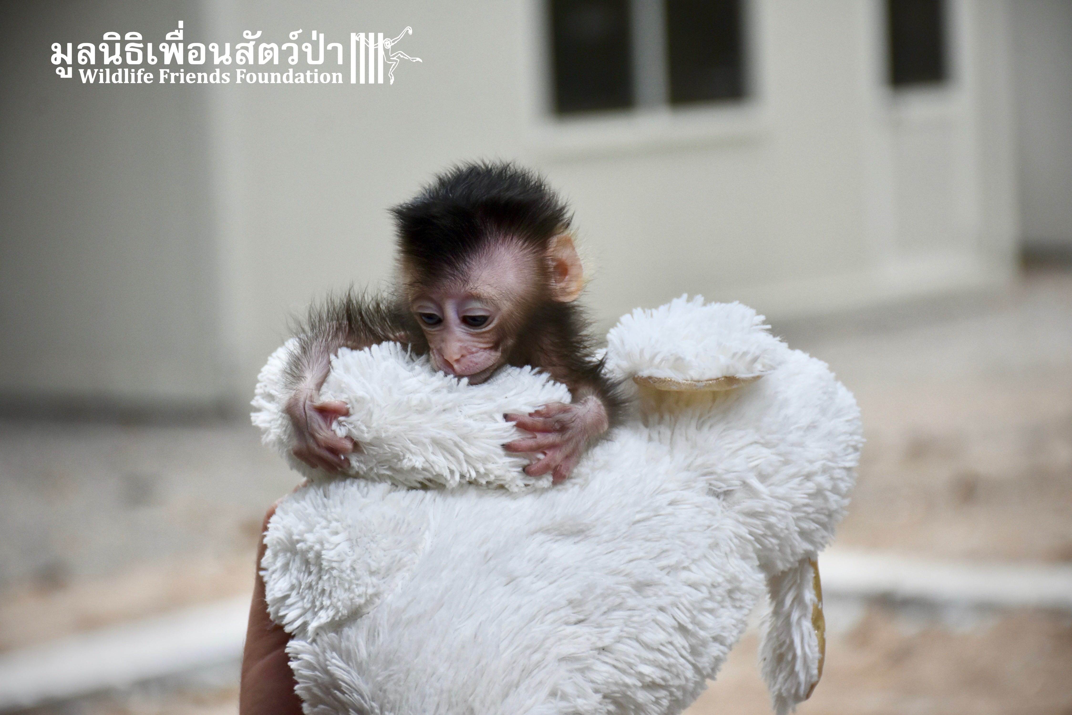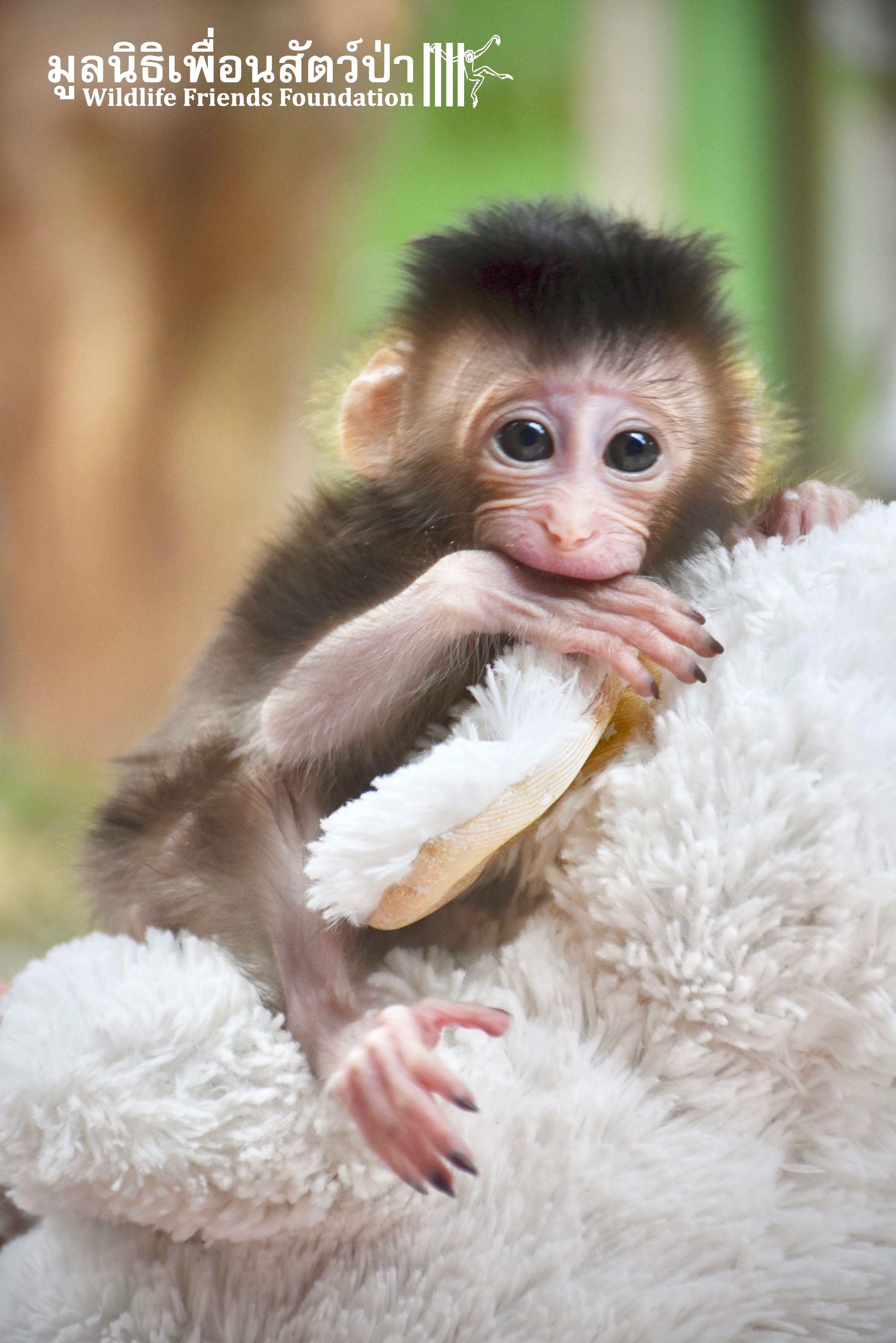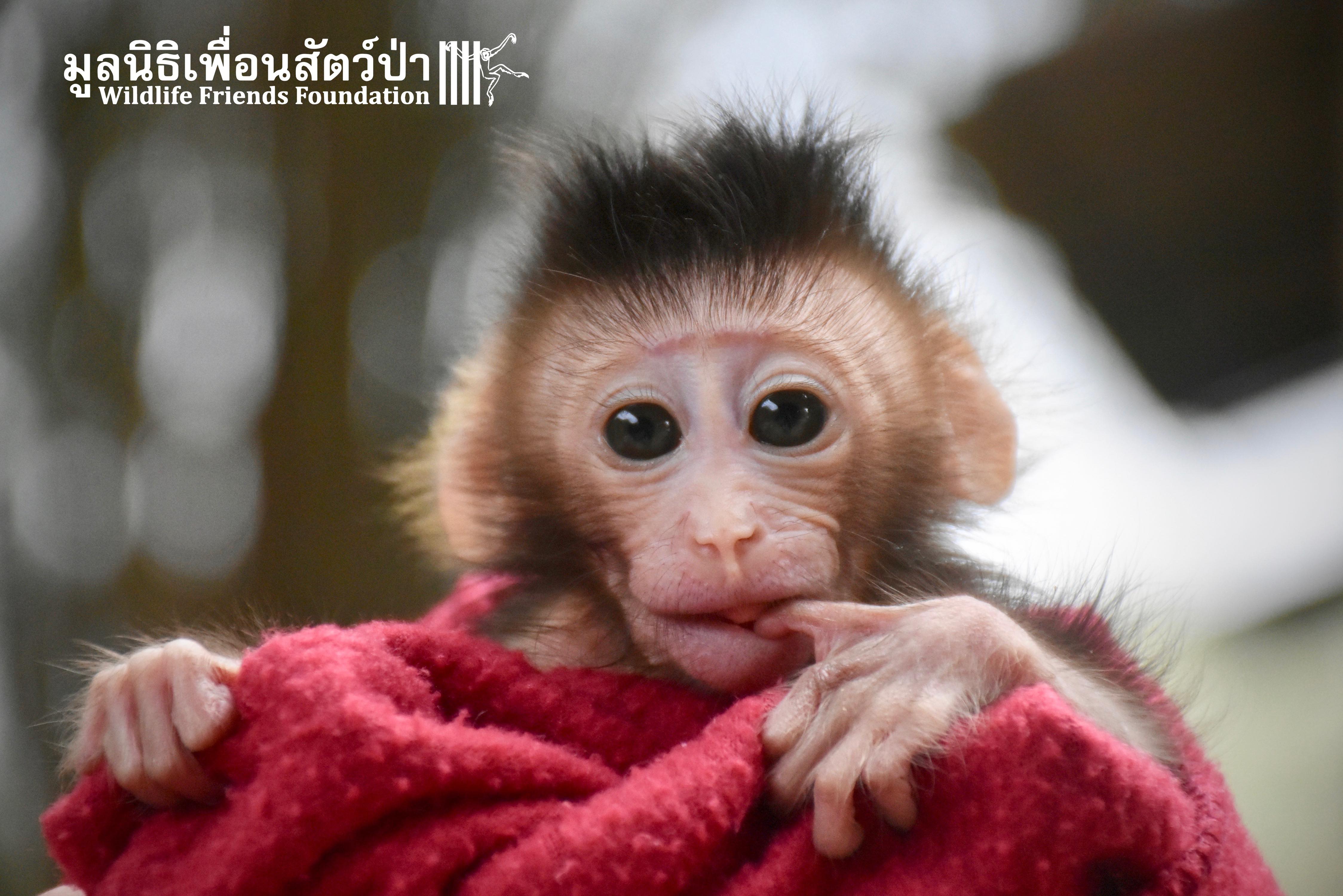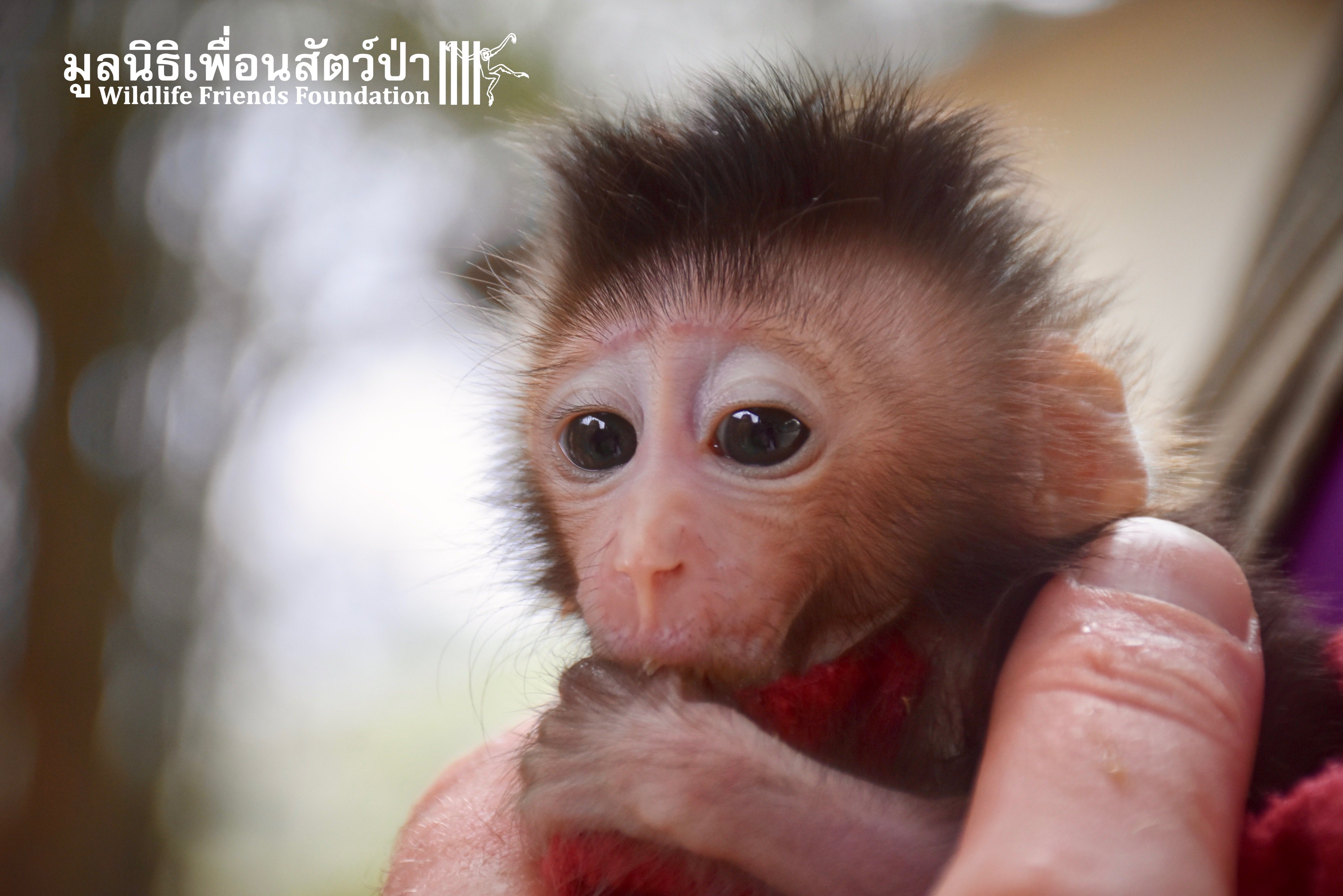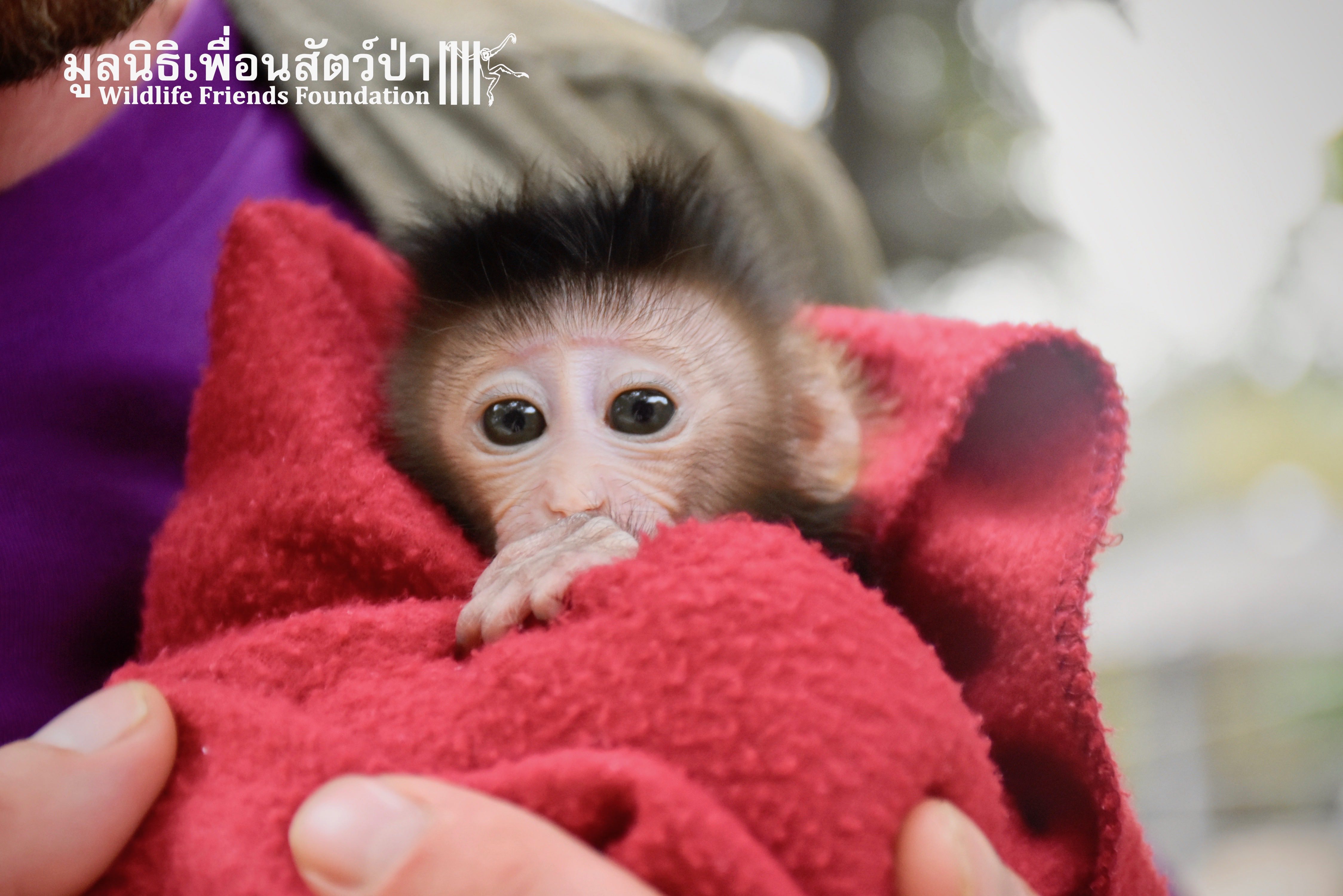 What we can say is… Meet “Pearl”. A sad baby girl, bought on a night market in Pattaya for 9000 Baht. Her owner kept her only 10 days, feeding her with some mashed banana mixture (Pearl would still have been breastfeeding in a normal life), before she decided to have the WFFT Rescue Team come to collect her. But we are happy to announce to you that, now, we are going to offer this sweet and hurt soul a chance for a better life. A chance to have a monkey life. A chance to be correctly loved, with proper care & attention, to meet others like her, and to have, later, when she will be a little older and autonomous, a life with her own species.