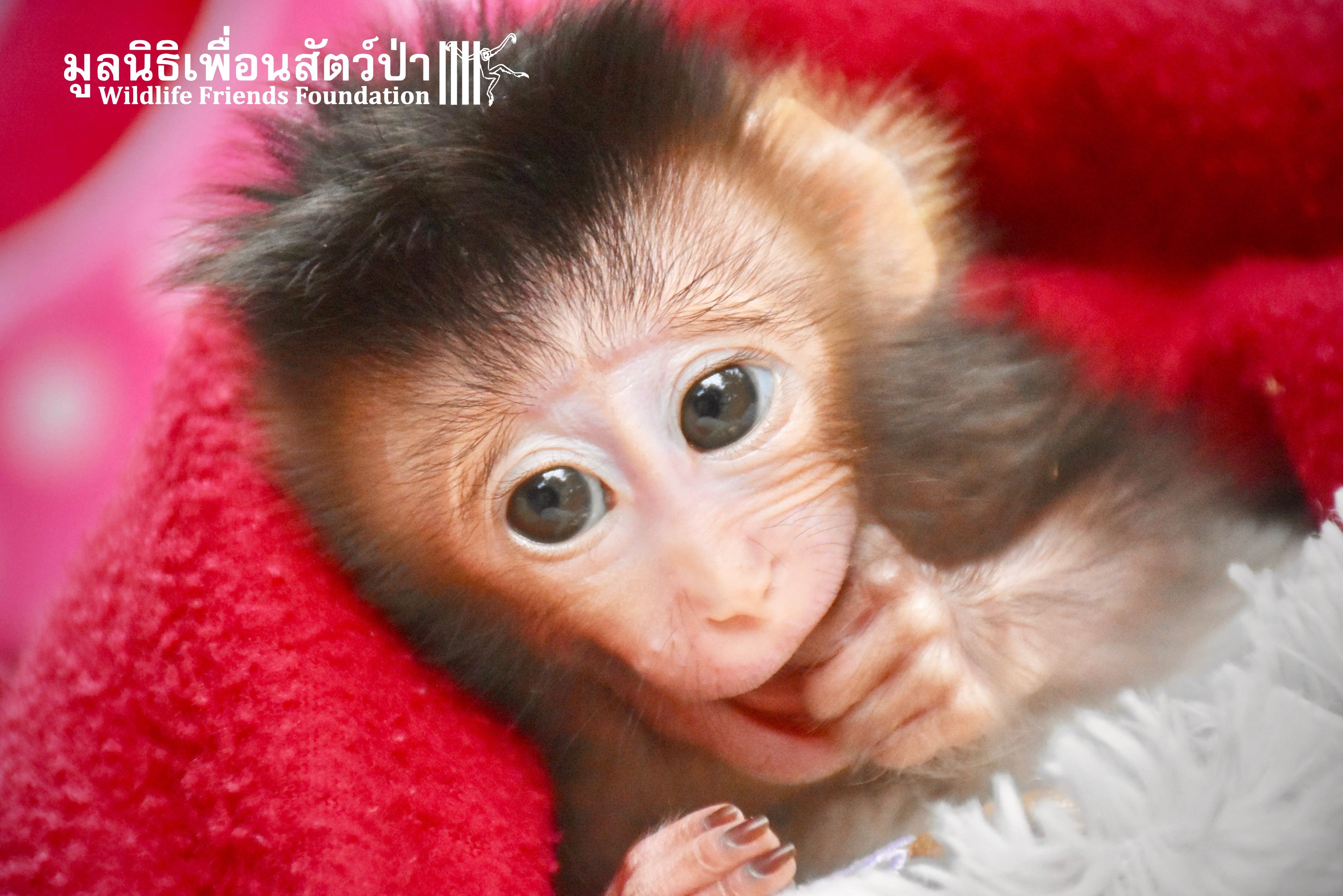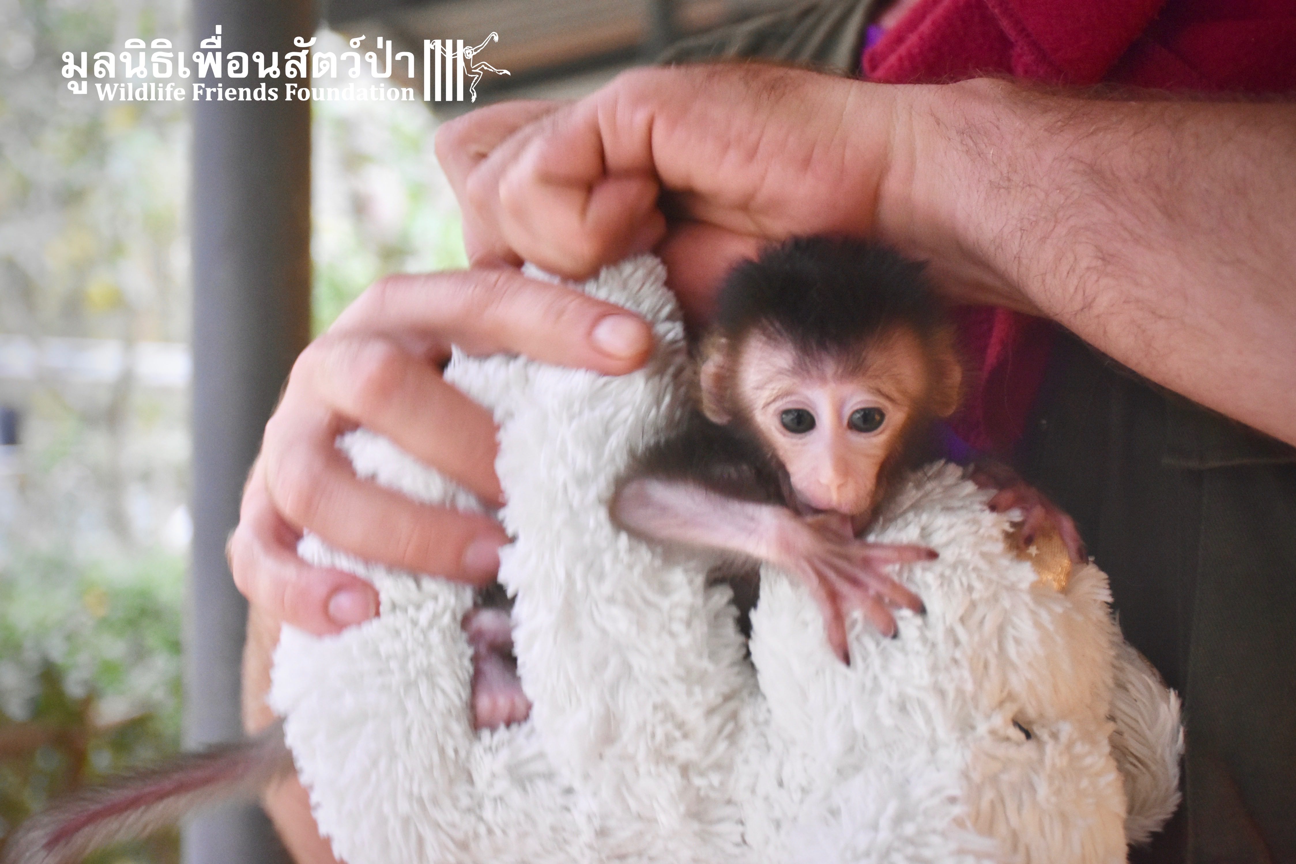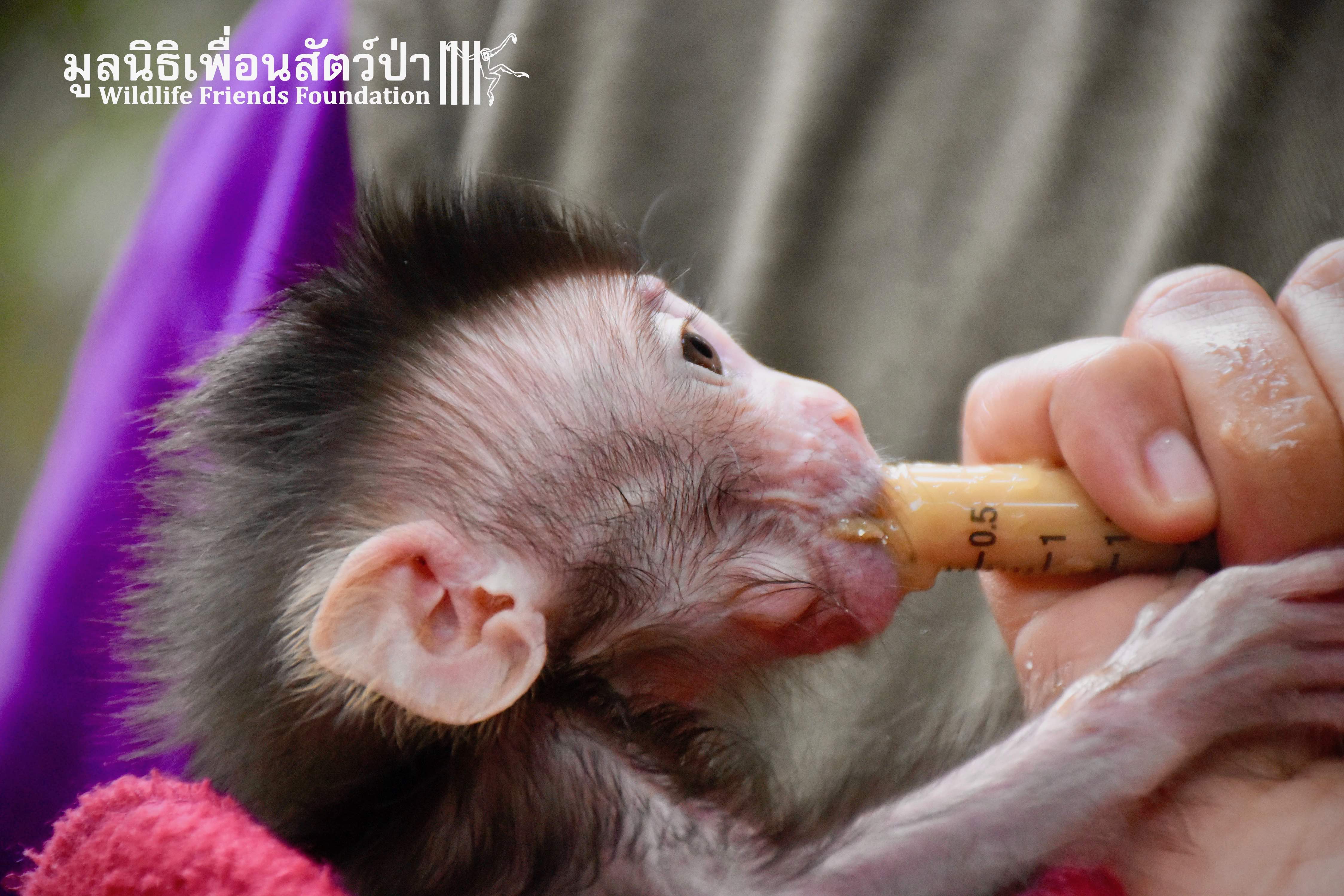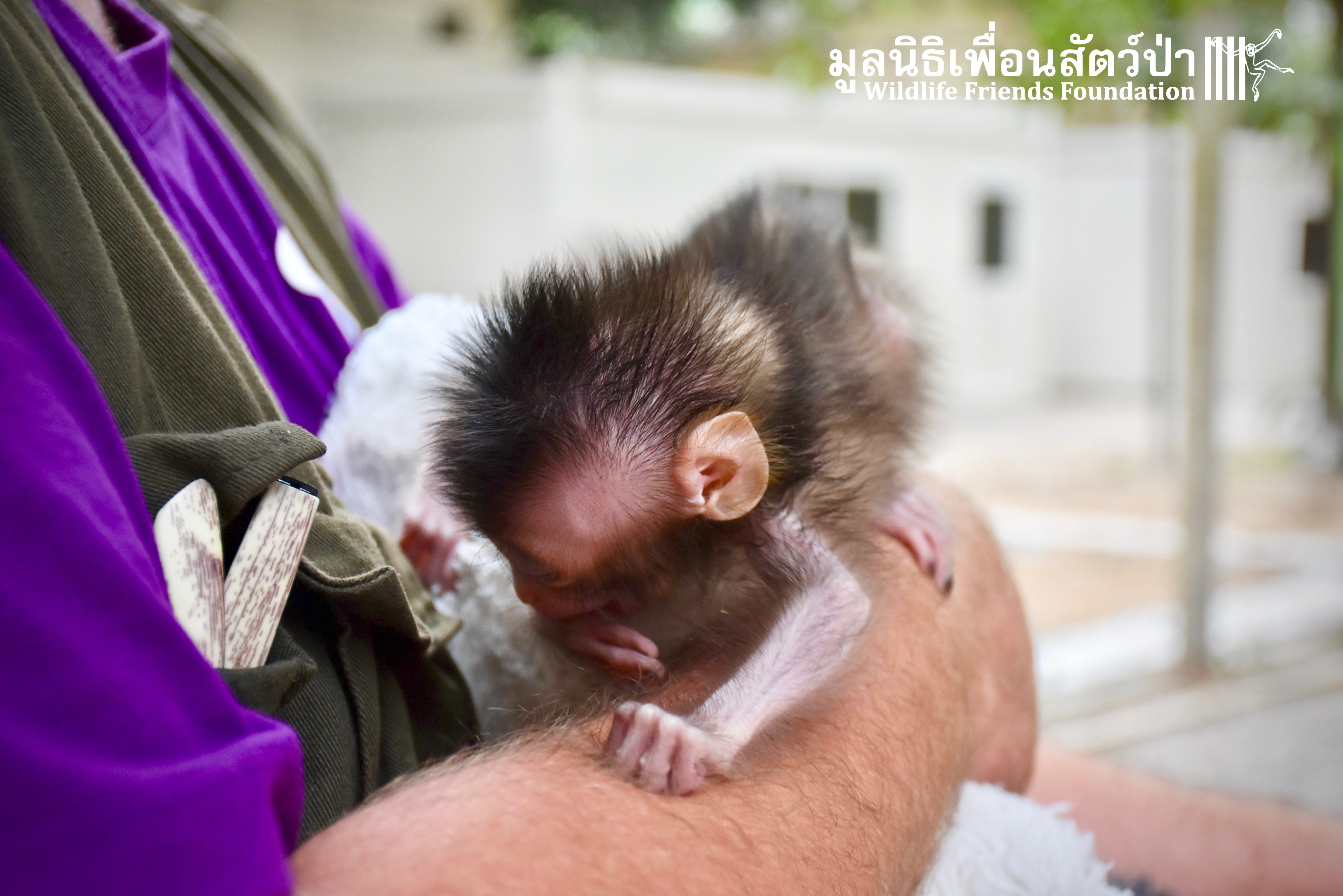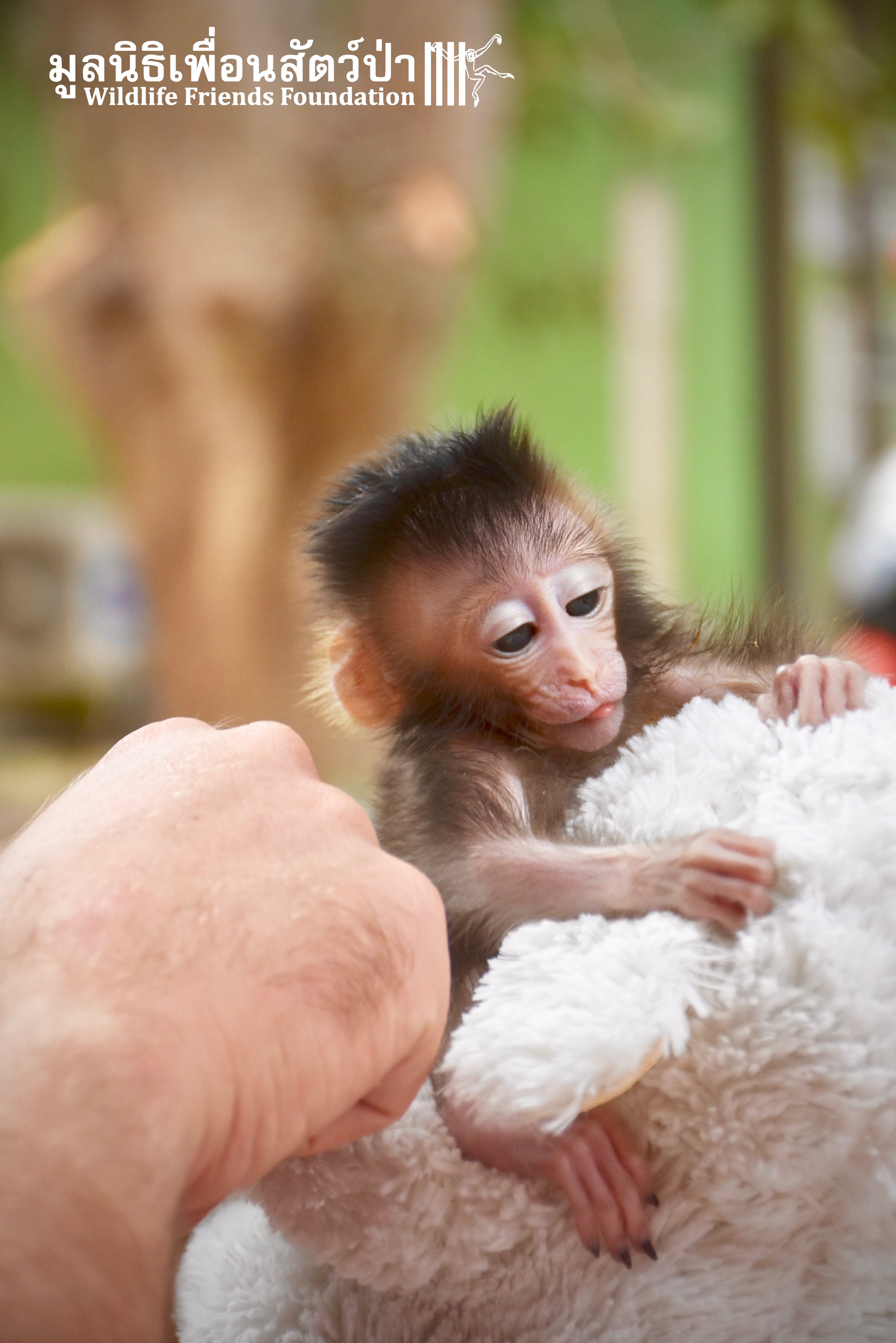 What we can say is… Meet “Pearl”. A sad baby girl, bought on a night market in Pattaya for 9000 Baht. Her owner kept her only 10 days, feeding her with some mashed banana mixture (Pearl would still have been breastfeeding in a normal life), before she decided to have the WFFT Rescue Team come to collect her. But we are happy to announce to you that, now, we are going to offer this sweet and hurt soul a chance for a better life. A chance to have a monkey life. A chance to be correctly loved, with proper care & attention, to meet others like her, and to have, later, when she will be a little older and autonomous, a life with her own species.