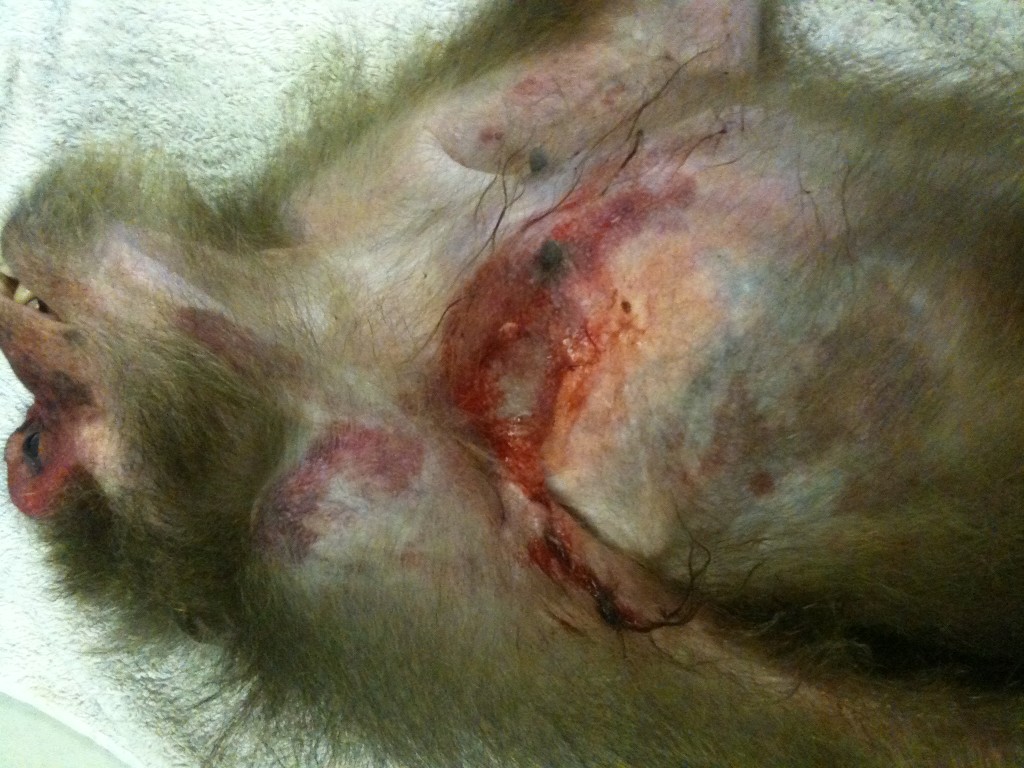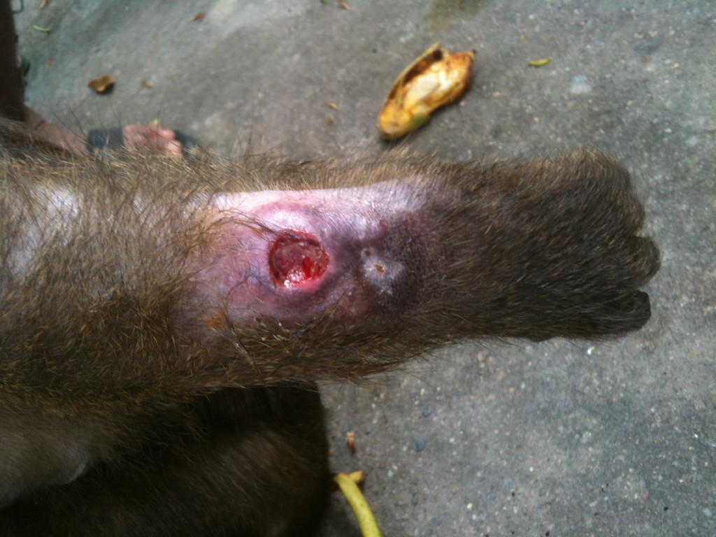 2012 brought challenging times for our veterinary team with the appearance of a serious bacterial disease in our resident group of stump tailed macaques. All 8 of our rescued stump tails were affected by the disease ‘Melioidosis’, a bacterial infection acquired from the soil in tropical regions which causes animals (and humans) to develop abscesses in the soft tissues, bones and organs accompanied by fever and weight loss. A few macaques had suffered from infected wounds over the preceding months but in February 2012, when illness started to appear with increasing frequency, a full investigation was warranted.