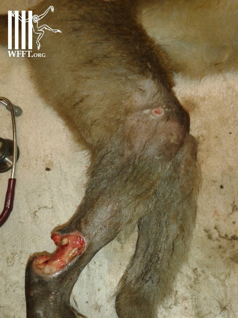 We received a long-tailed macaque last week that was kept as a pet in a temple. The monkey that was chained up was attacked by a group of dogs and was severely bitten by these dogs. As the monkey was chained up it could not fight back or run for its life, the wounds tell it all…