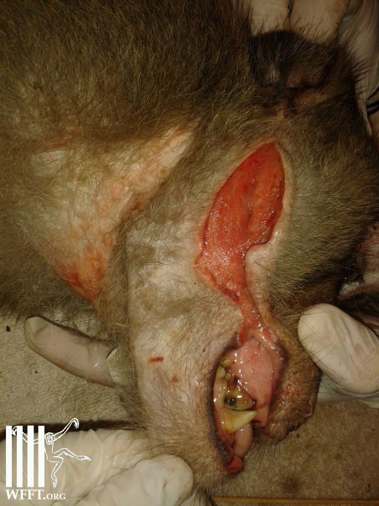 We are currently caring for the monkey we called “the Joker” and hope we can get him back to good health, most wounds are pretty serious and infected, one of its legs has the tendant comeplete severed, but we will do our bets to get him back in shape! After 4 days at WFFT he is stable and improving bit by bit.