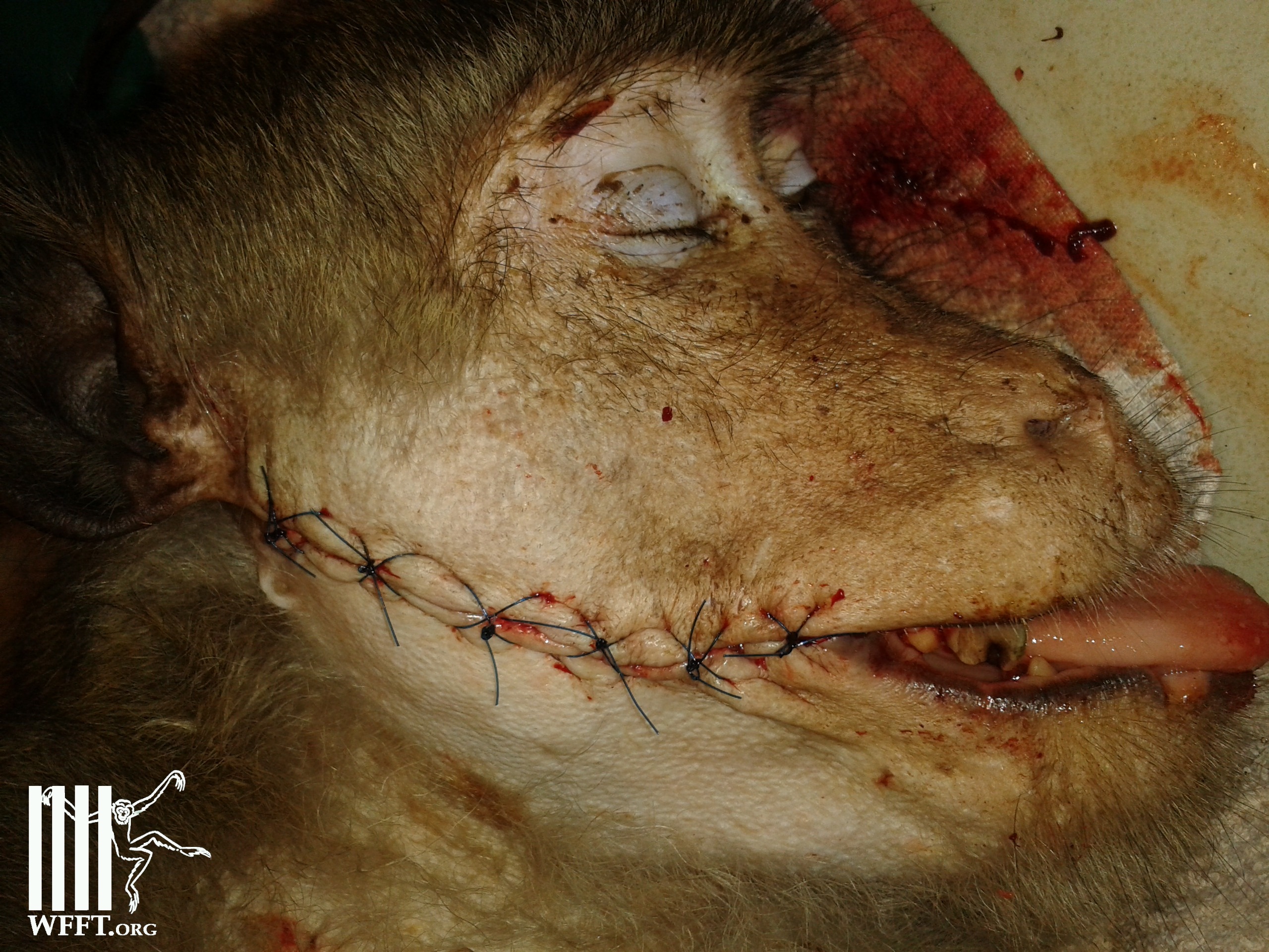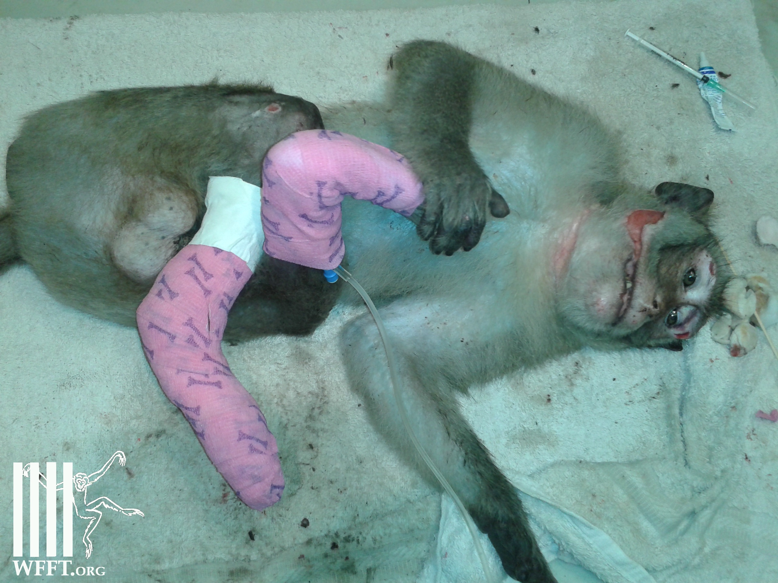We received a long-tailed macaque last week that was kept as a pet in a temple. The monkey that was chained up was attacked by a group of dogs and was severely bitten by these dogs. As the monkey was chained up it could not fight back or run for its life, the wounds tell it all…