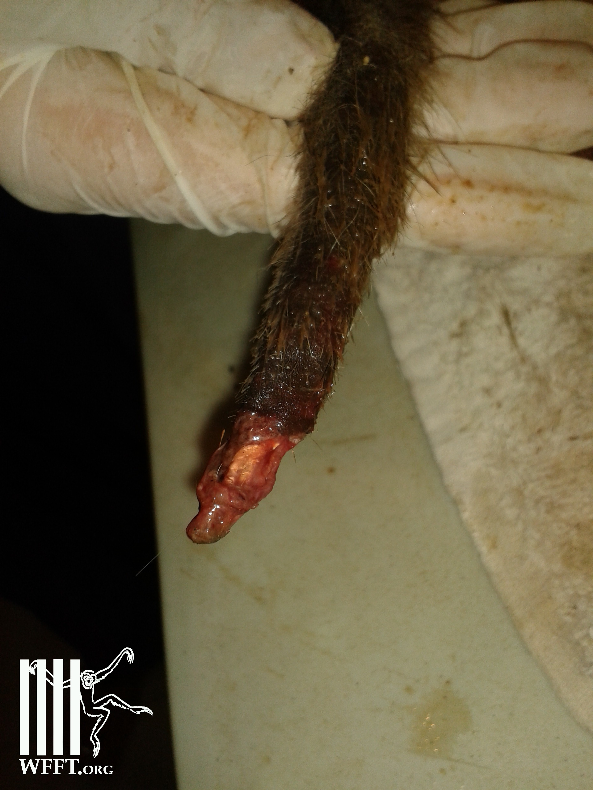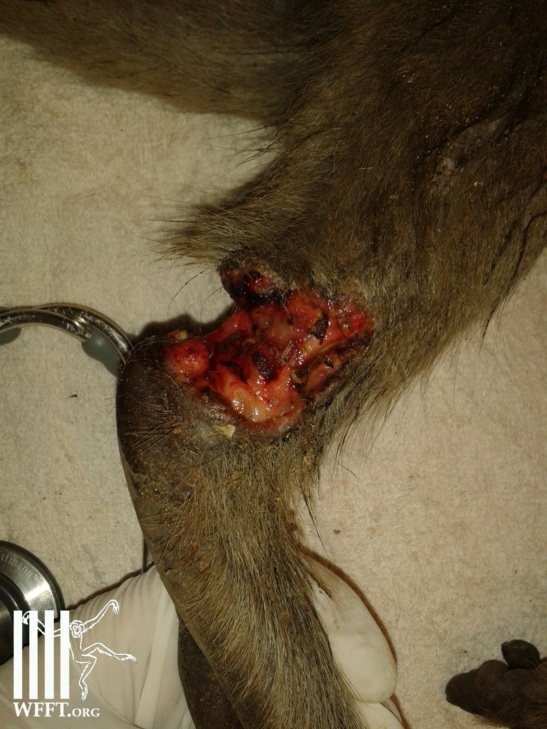 We are currently caring for the monkey we called “the Joker” and hope we can get him back to good health, most wounds are pretty serious and infected, one of its legs has the tendant comeplete severed, but we will do our bets to get him back in shape! After 4 days at WFFT he is stable and improving bit by bit.
