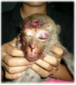 February 2006, a long-tailed macaque was brought to our clinic from the national park with severe injuries to three of four limbs.  It is suspected some animals had been dumped in Kaengkrachan, an area long-tailed macaques are not known to populate prior to the finding of this monkey and others recently.