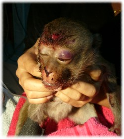 The young female macaque had suffered a severe head trauma injury as a result of a vehicular accident on the highway.