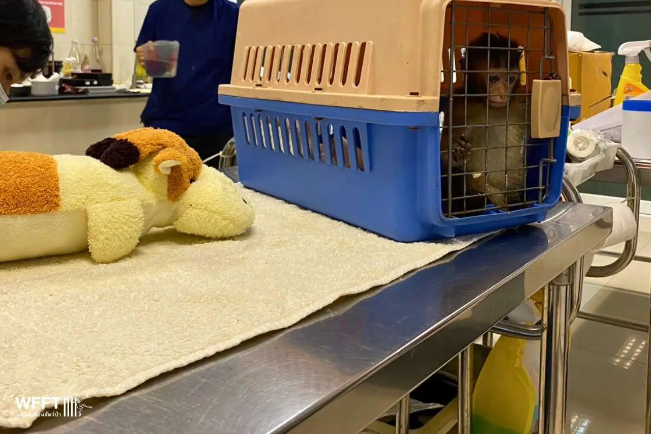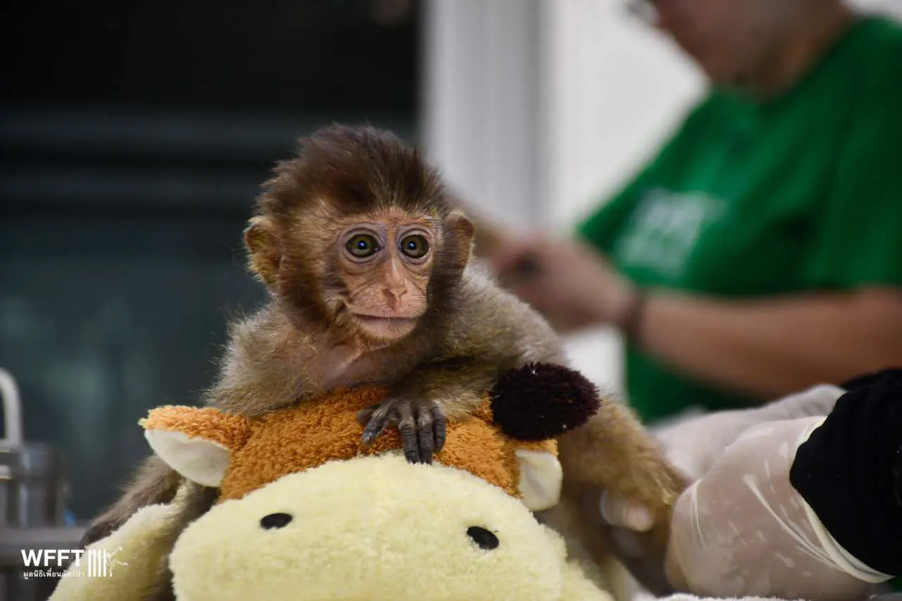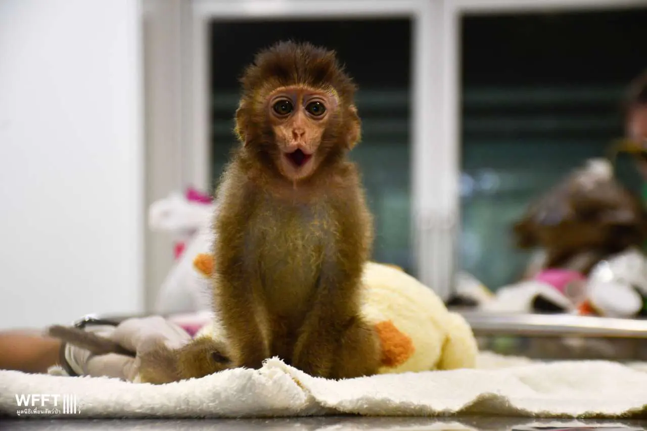Chaba Kaew, a beautiful long-tailed macaque, recently arrived at WFFT after suffering a devastating fall from a tree on the tourist island of Koh Chang. The accident left her with severe spinal damage and paralysis in her back legs. Yet, despite her injuries, Chaba Kaew’s spirit remains unbroken. She is bright, alert, and has a wonderfully sweet nature.