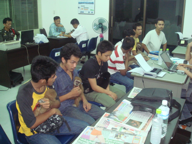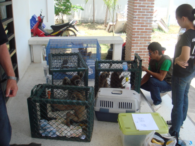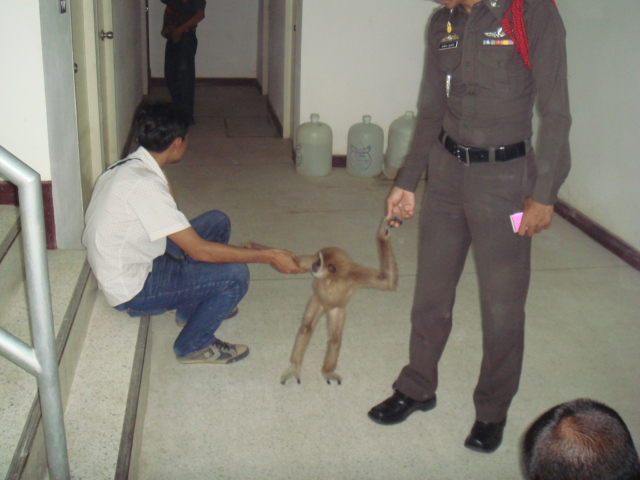 In a well prepared raid by the Natural Resources and Environmental Crime Division of the Royal Thai Police, headed by their commander Police Major-General Boonmee Somsuk, seven white handed gibbon babies were confiscated and their owners arrested on charges of illegal wildlife possession and cruelty to animals. Koh Samui, one of Thailand’s prime tourist destinations has seen the exploitation of many species of wildlife such as gibbons, snakes, young crocodiles, birds of prey and other protected wildlife being carried around as photo-props, where foreign tourists are offered to take pictures holding the animals for a charge of 200 to 500 Baht per person (US$ 6.- to 15.-)