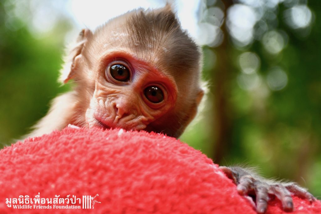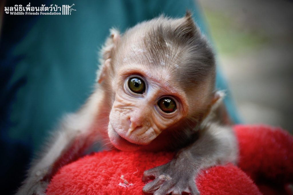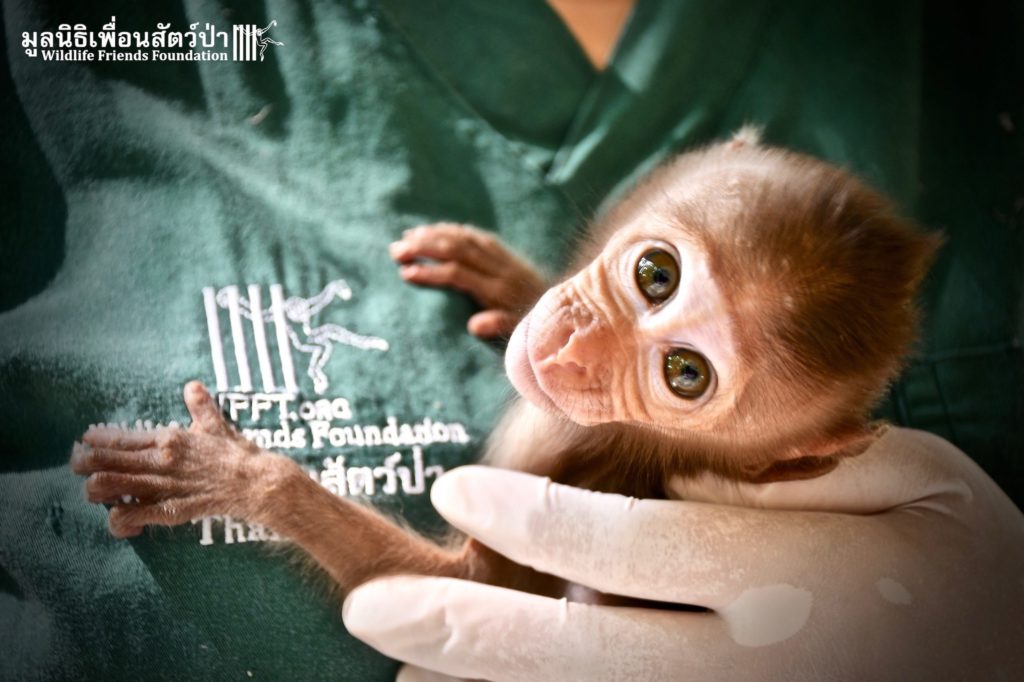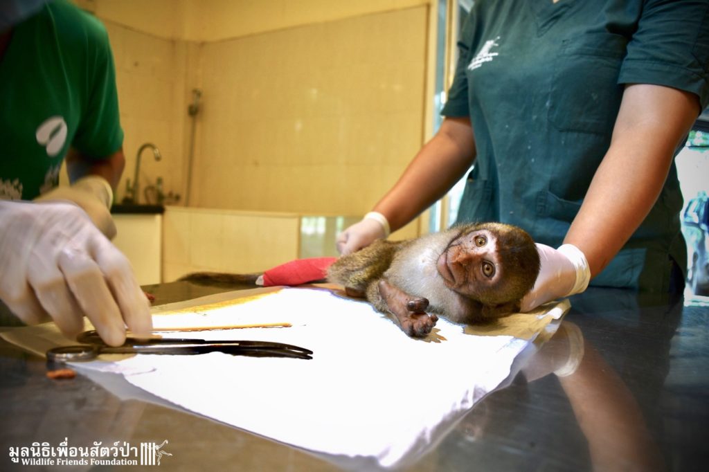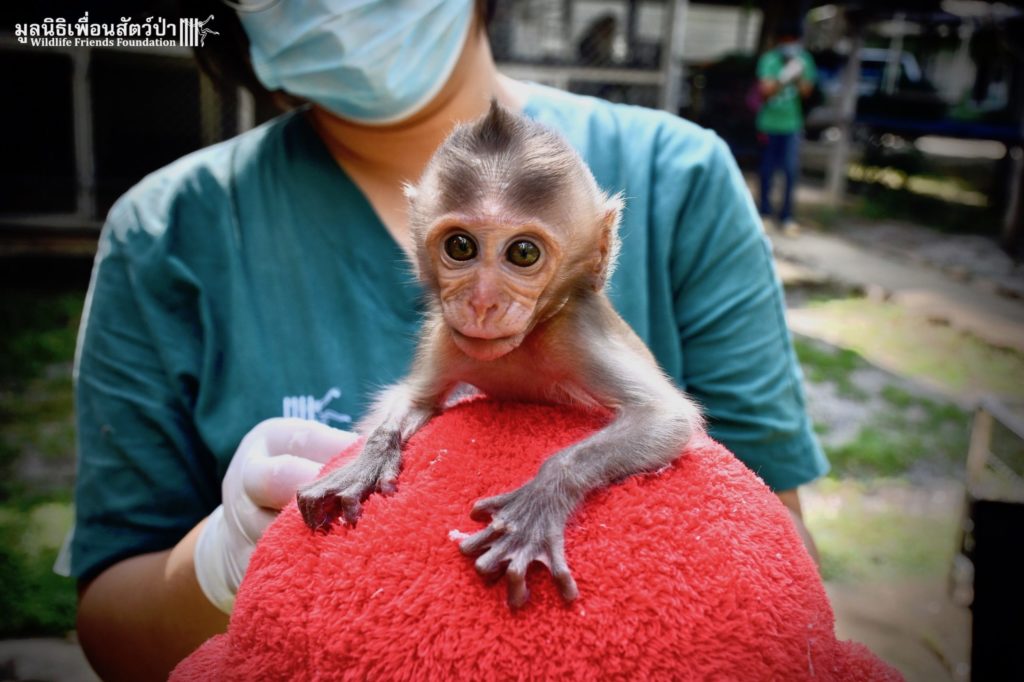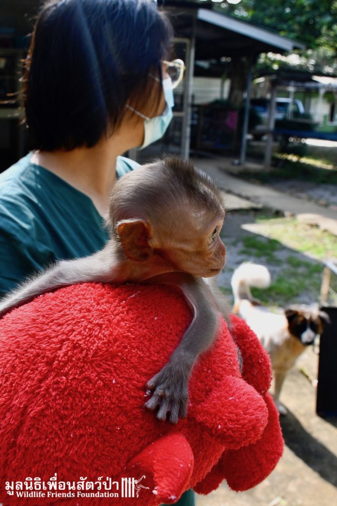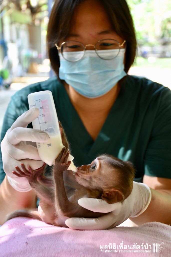 The first was ‘Im Un’ who was rescued from Uthai Thani by Khun Kae Chollada and the team from The Voice Foundation. Khun Kae had rescued Im Um and his mother a few days ago, they had been hit by a car and badly injured. Sadly his mother passed away leaving him orphaned. We were asked to help take care of him, as our team are experts in caring for infant macaques. Thank to Khun Kae for saving this little one.