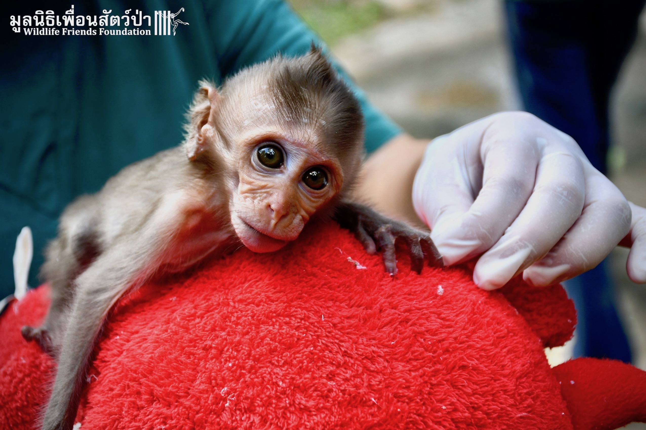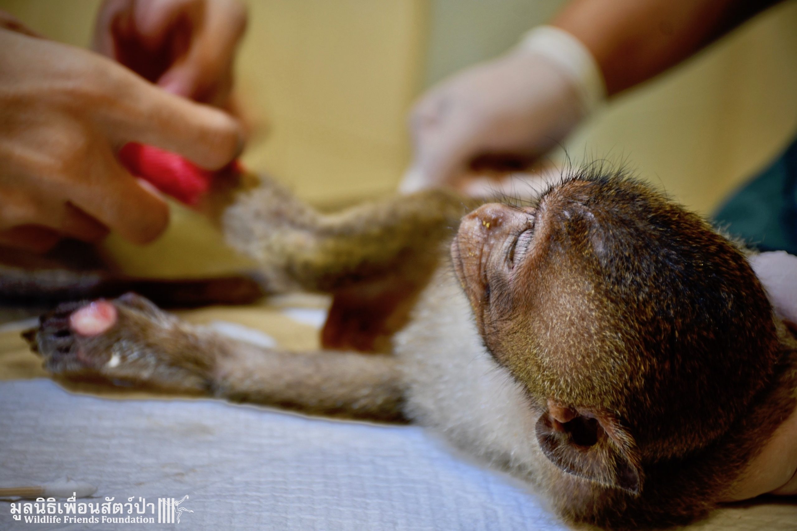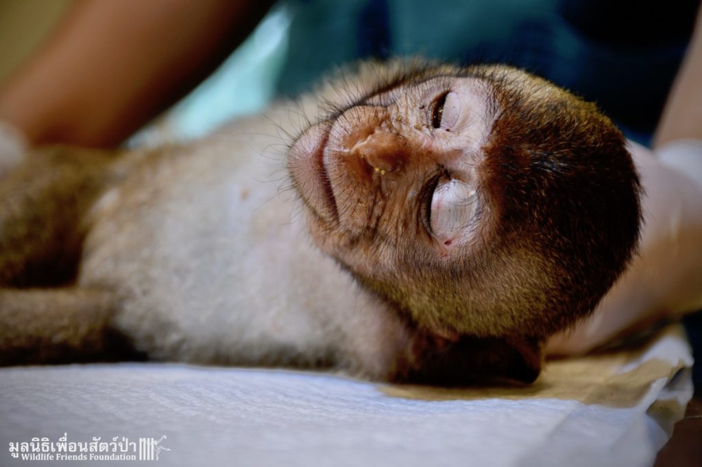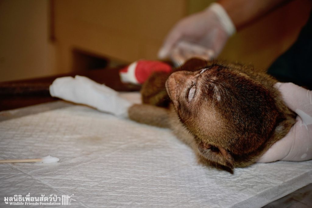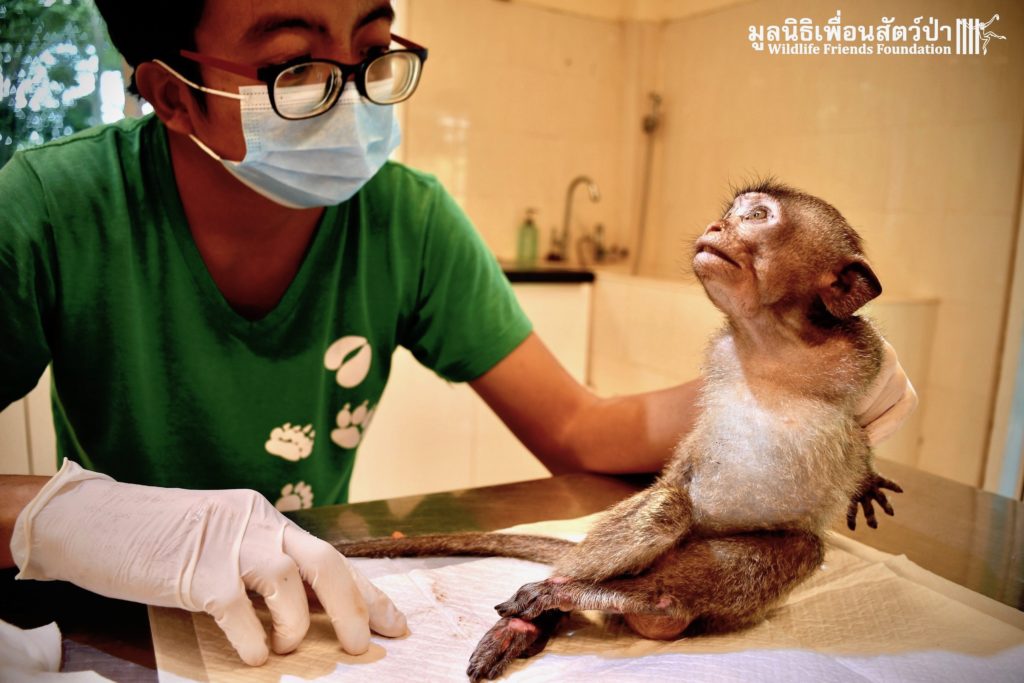The first was ‘Im Un’ who was rescued from Uthai Thani by Khun Kae Chollada and the team from The Voice Foundation. Khun Kae had rescued Im Um and his mother a few days ago, they had been hit by a car and badly injured. Sadly his mother passed away leaving him orphaned. We were asked to help take care of him, as our team are experts in caring for infant macaques. Thank to Khun Kae for saving this little one.