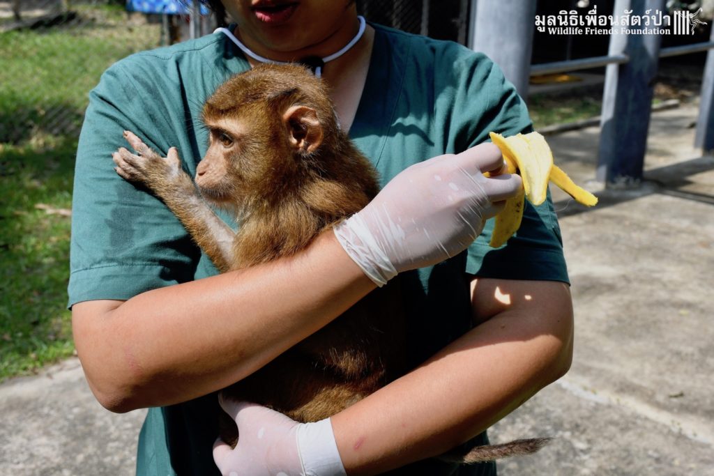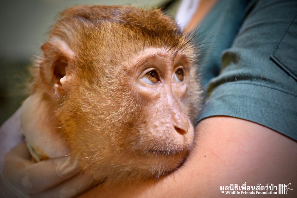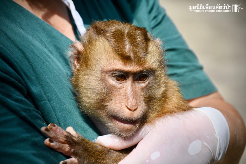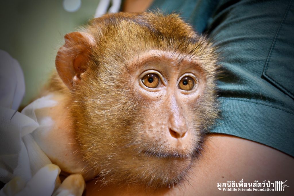 WFFT welcomed another primate in need of help this week. This sub-adult Northern pig-tailed macaque was found with a rope or vine caught around his right arm. The local people who found him in Chumpon district brought him to WFFT. Mysteriously he is very tame, clearly an ex-captive, we assume that he is an escaped or unwanted coconut-picking monkey. The people that found him named him Boon Lott.