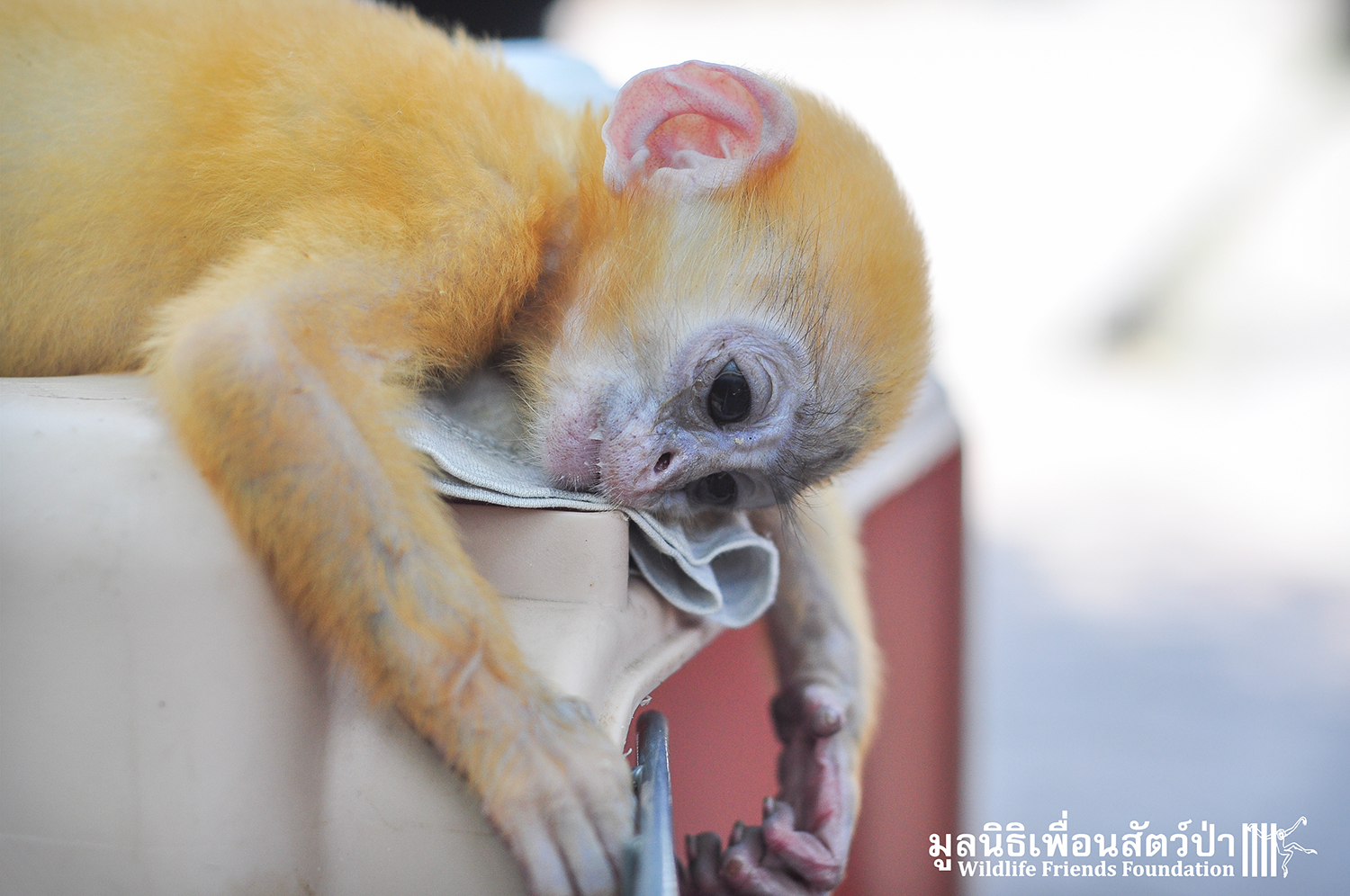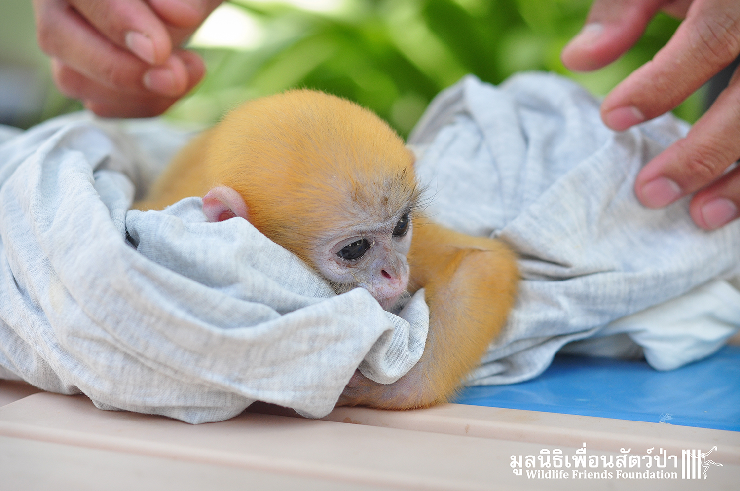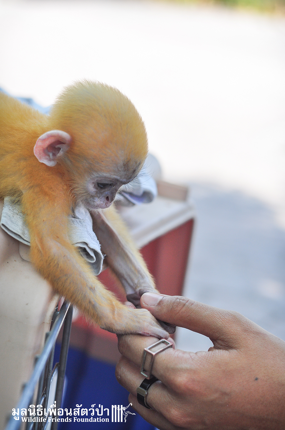 The WFFT mobile wildlife rescue team was again contacted over the last weekend to help out a few unfortunate wild animals. The first victim of the illegal wildlife trade and hunt this weekend was “Piak” a very young spectacled langur baby. Piak has been living in the jungles of Ranong province until only a few weeks ago when his mother was shot and killed to end up as dinner. The poacher said he did not realize the mother was carrying a baby when he killed her. Unfortunately this is ver common still in Thailand.