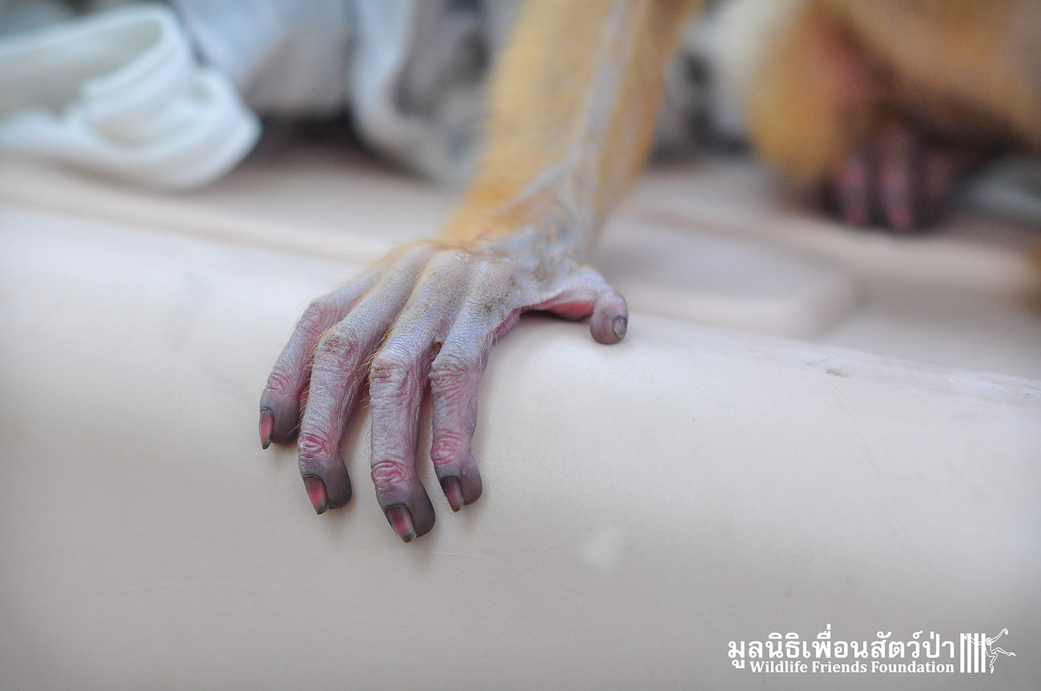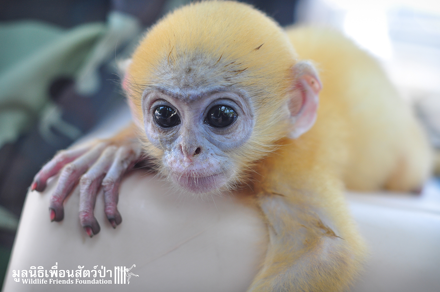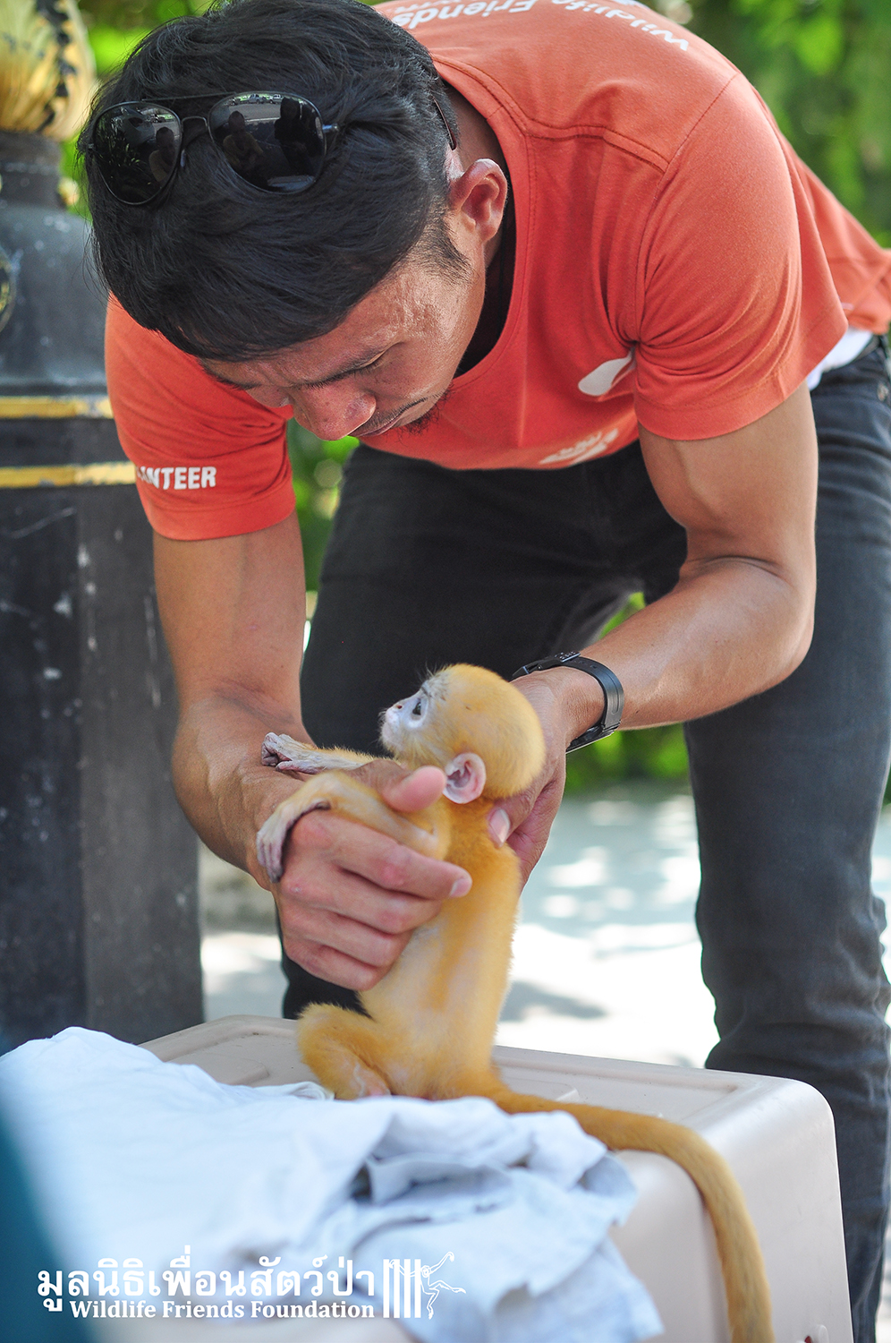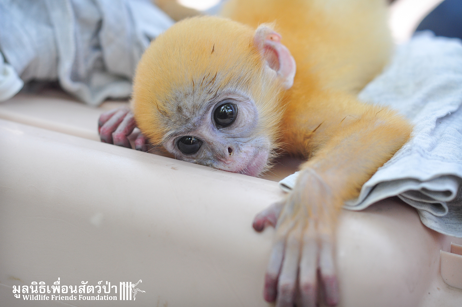 The WFFT mobile wildlife rescue team was again contacted over the last weekend to help out a few unfortunate wild animals. The first victim of the illegal wildlife trade and hunt this weekend was “Piak” a very young spectacled langur baby. Piak has been living in the jungles of Ranong province until only a few weeks ago when his mother was shot and killed to end up as dinner. The poacher said he did not realize the mother was carrying a baby when he killed her. Unfortunately this is ver common still in Thailand.