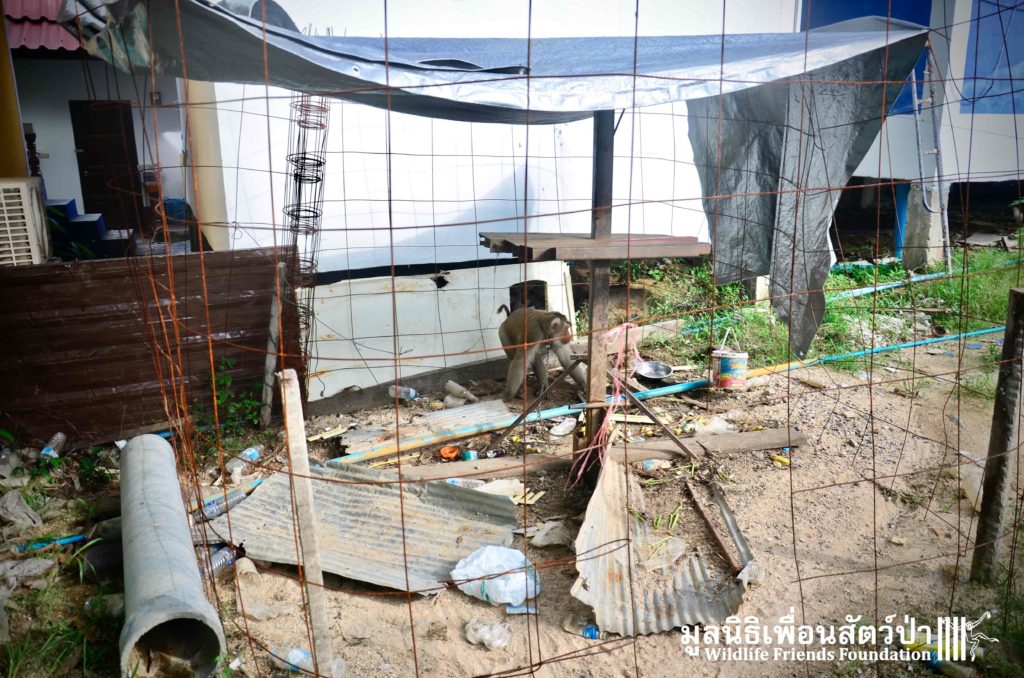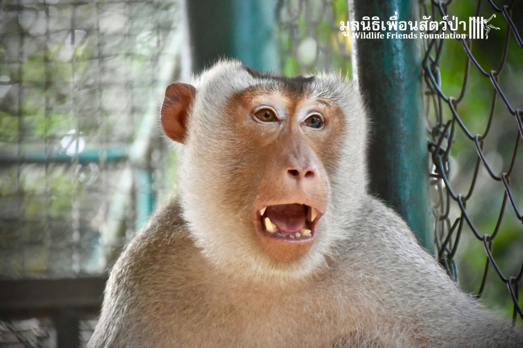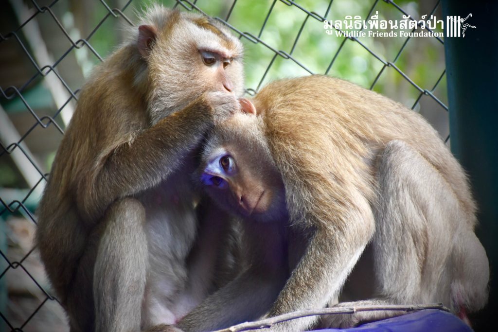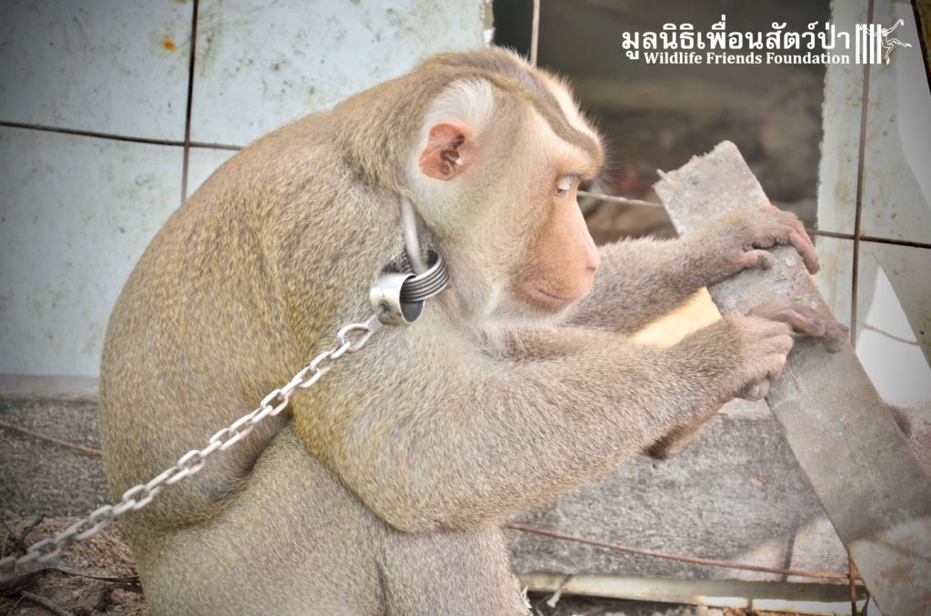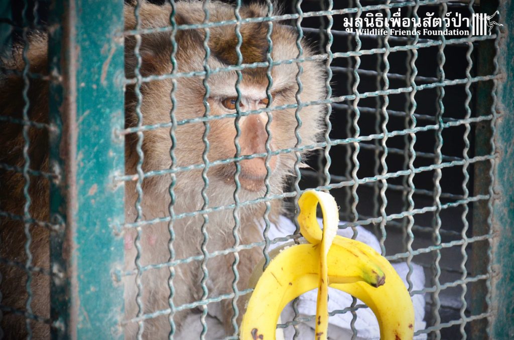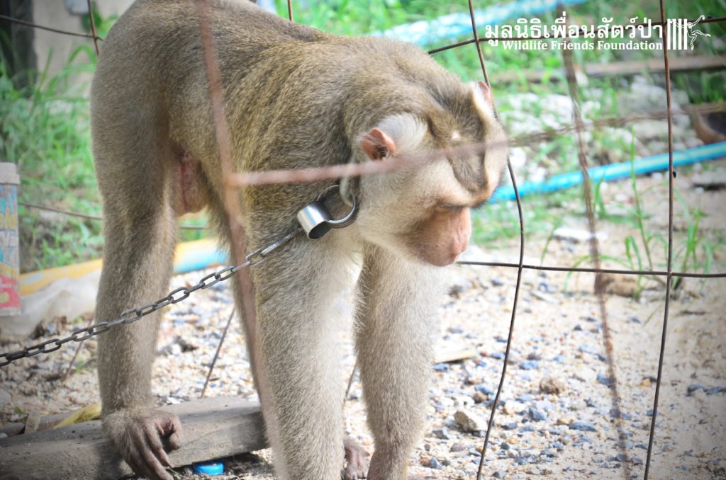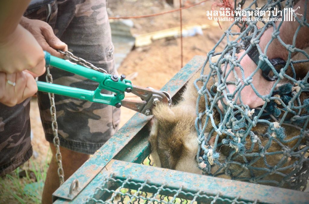 Last week the WFFT Wildlife Rescue Team headed out on a long rescue mission to Koh Samui, an island in Southern Thailand. The animals in need of rescue were 3 adult Northern pig-tailed macaques (Macaca leonina), 1 male and 2 females. The male named Khai, was being used as a coconut monkey and had escaped. He was then captured and chained up, he then spent the next 4 years on this chain until we were made aware of his plight. The 2 females, Maya and Nina, had been ‘rescued’ by a concerned ex-pat in 2010 after being found as very young in infants for sale at the side of a road. They then spent the next 7 years being cared for by these people in an enclosure in their garden. The people caring for them had to leave Thailand so called us to help.
