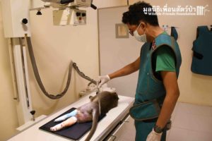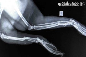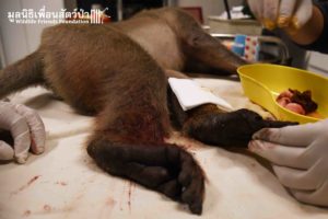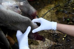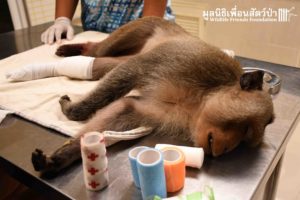 But sometimes bad luck brings good luck as well. A concerned local found Leggy immobile on the ground and contacted us about a monkey in need of emergency medical treatment. Now he is in the good hands of the WFFT vet team, where he will receive the care he needs until he recovers enough to be returned to the wild.