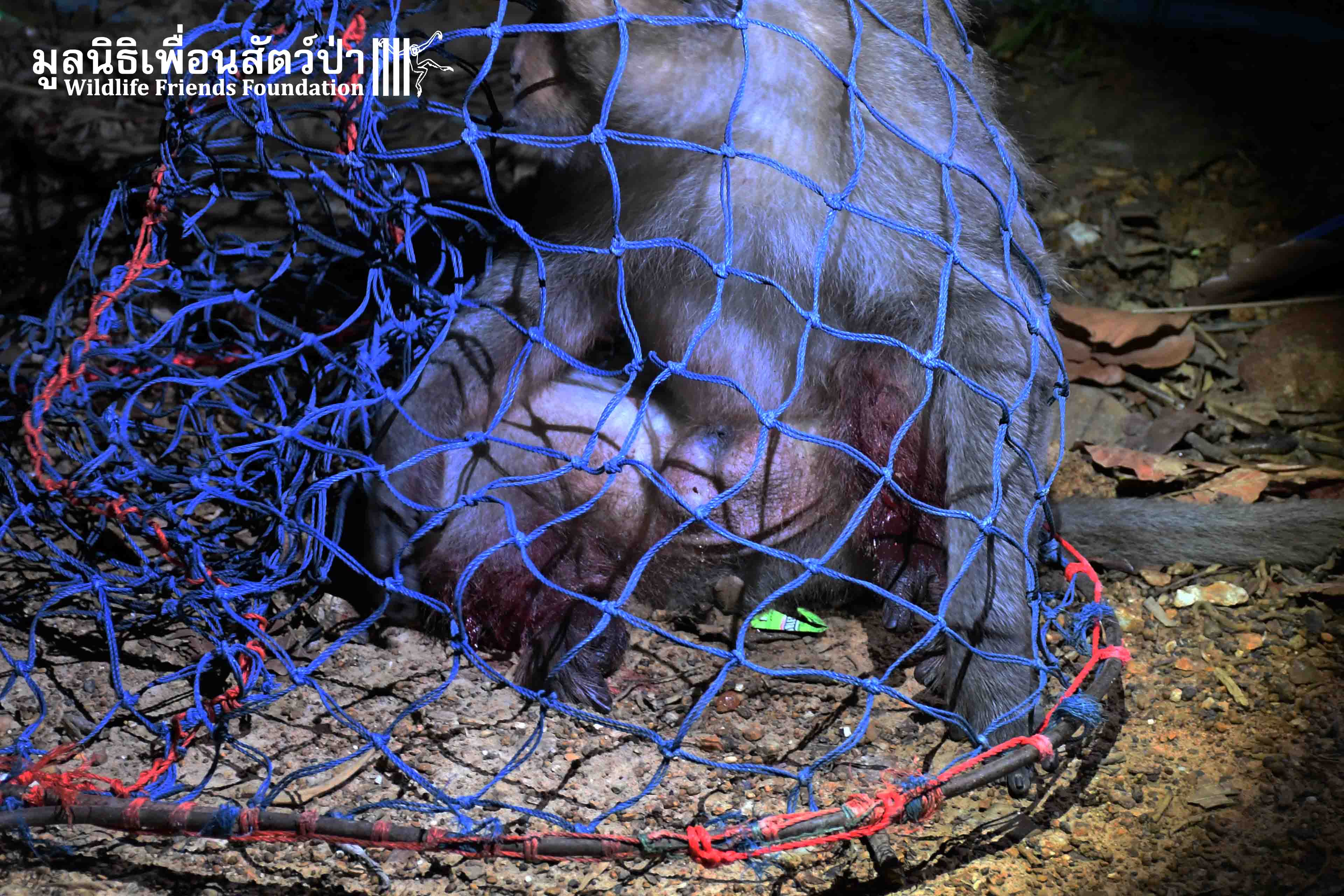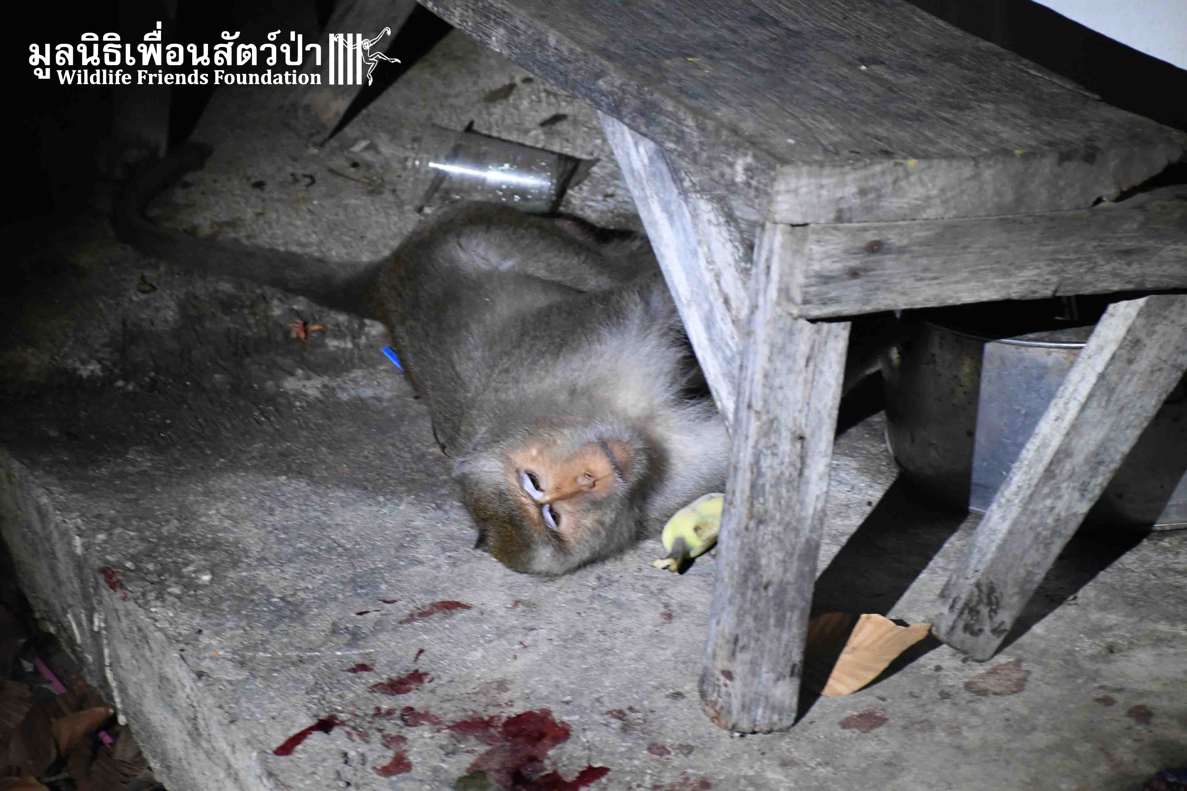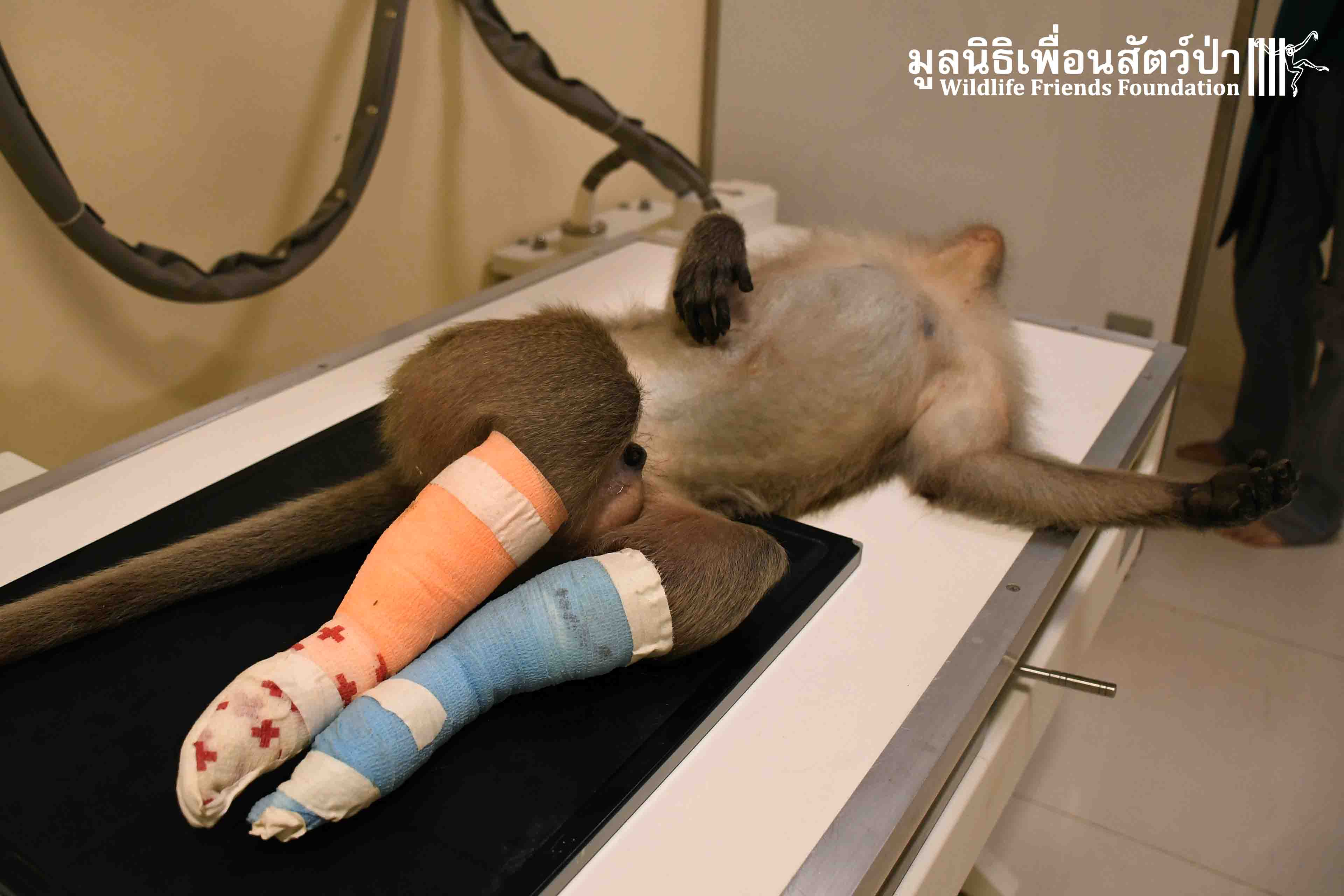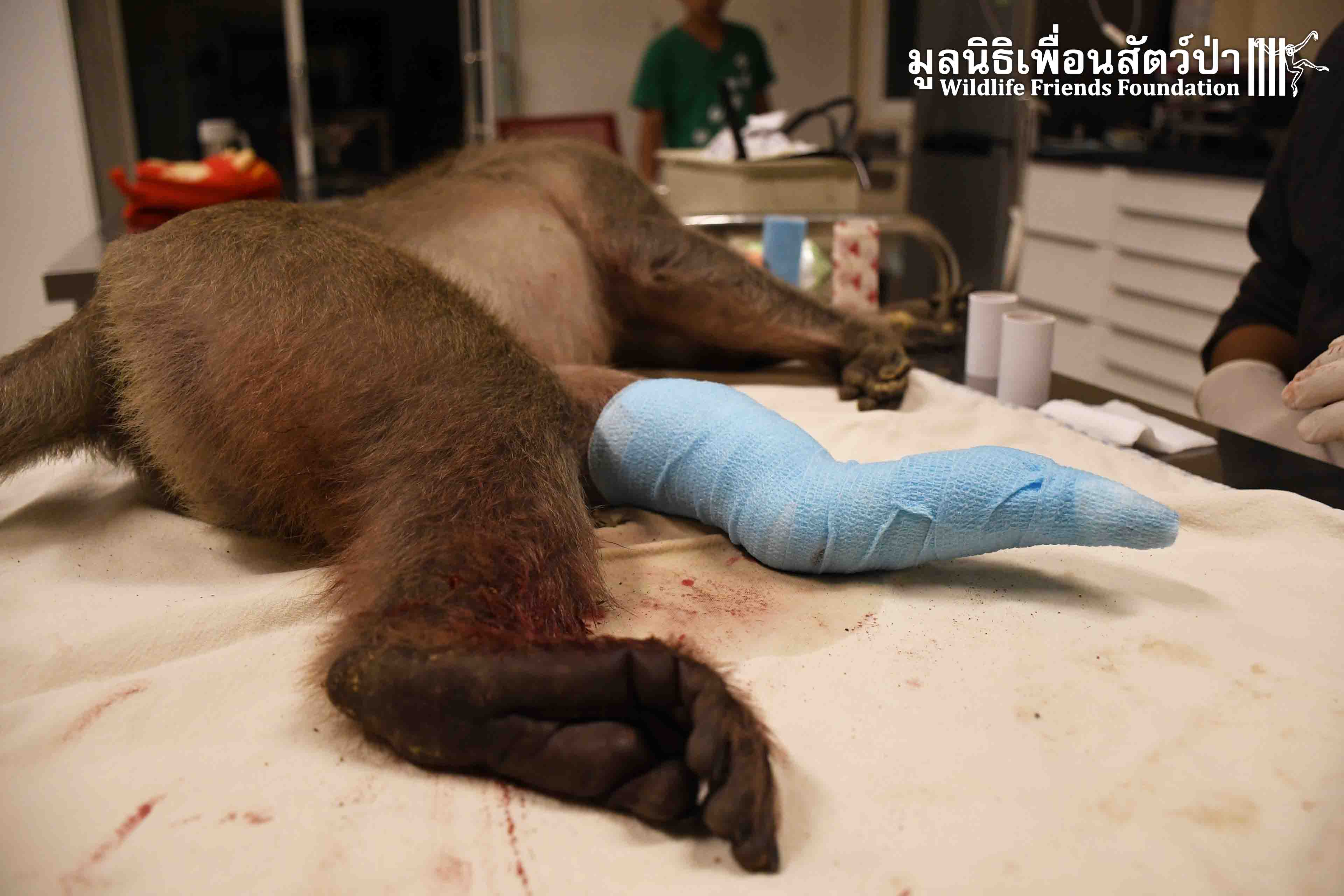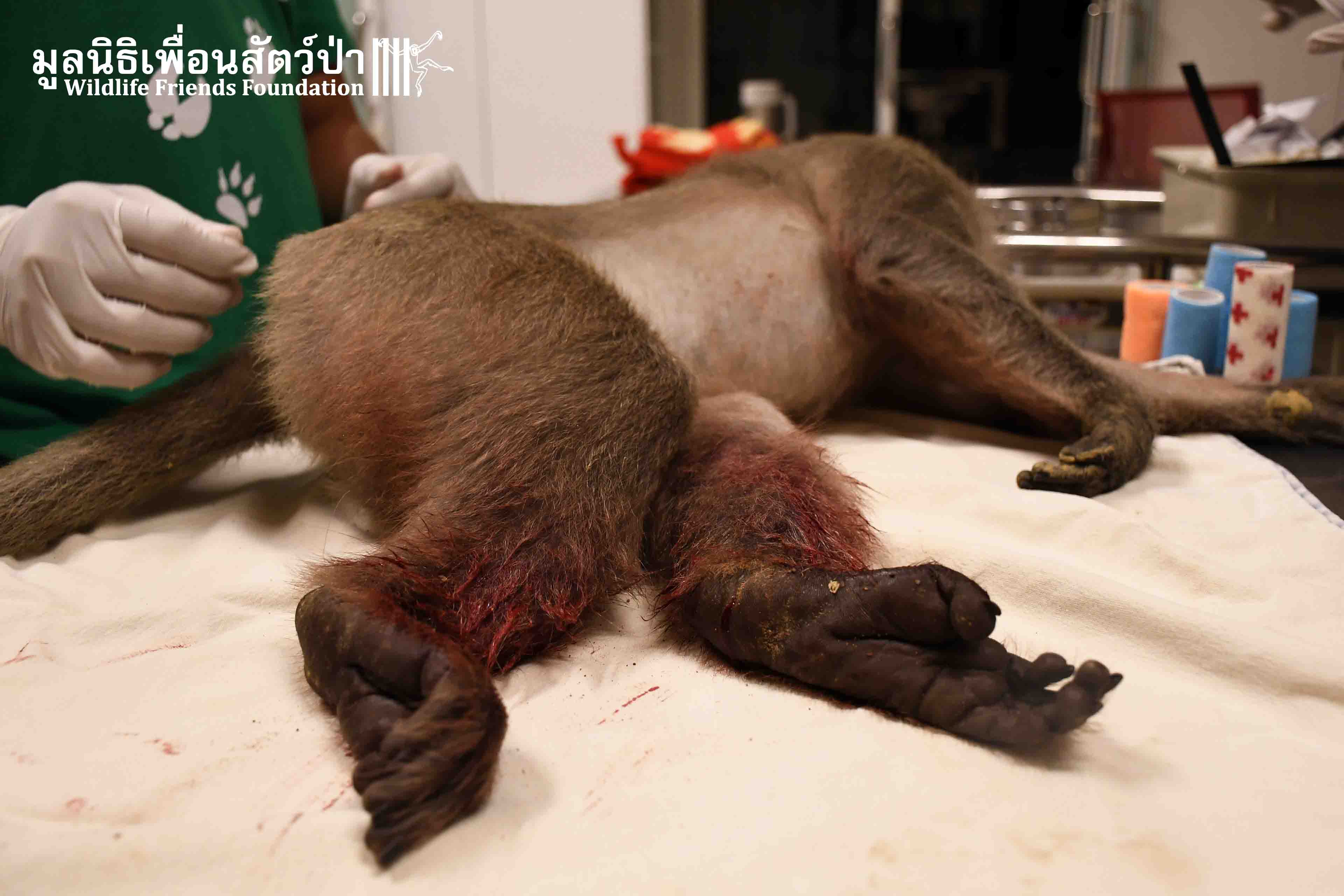 But sometimes bad luck brings good luck as well. A concerned local found Leggy immobile on the ground and contacted us about a monkey in need of emergency medical treatment. Now he is in the good hands of the WFFT vet team, where he will receive the care he needs until he recovers enough to be returned to the wild.